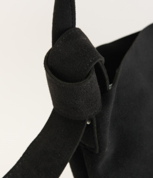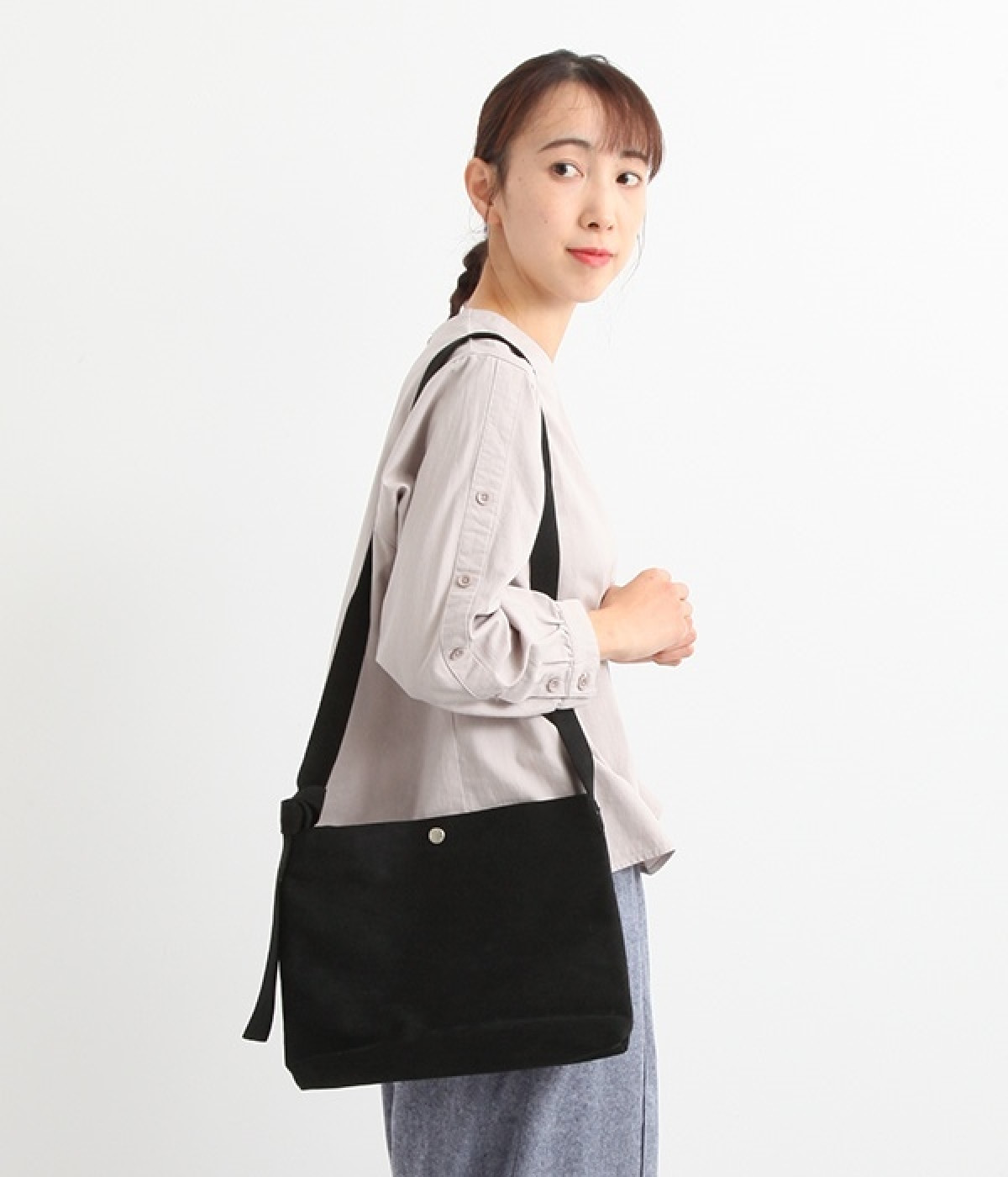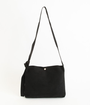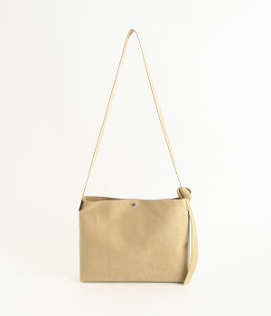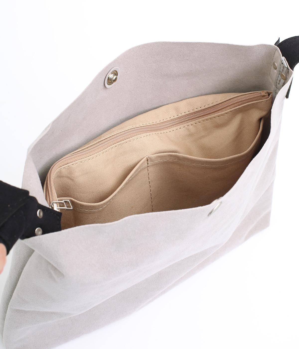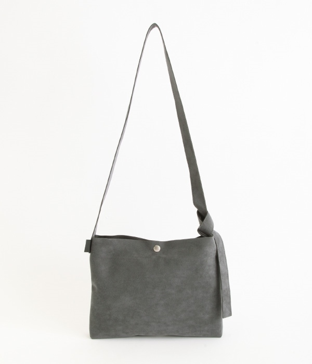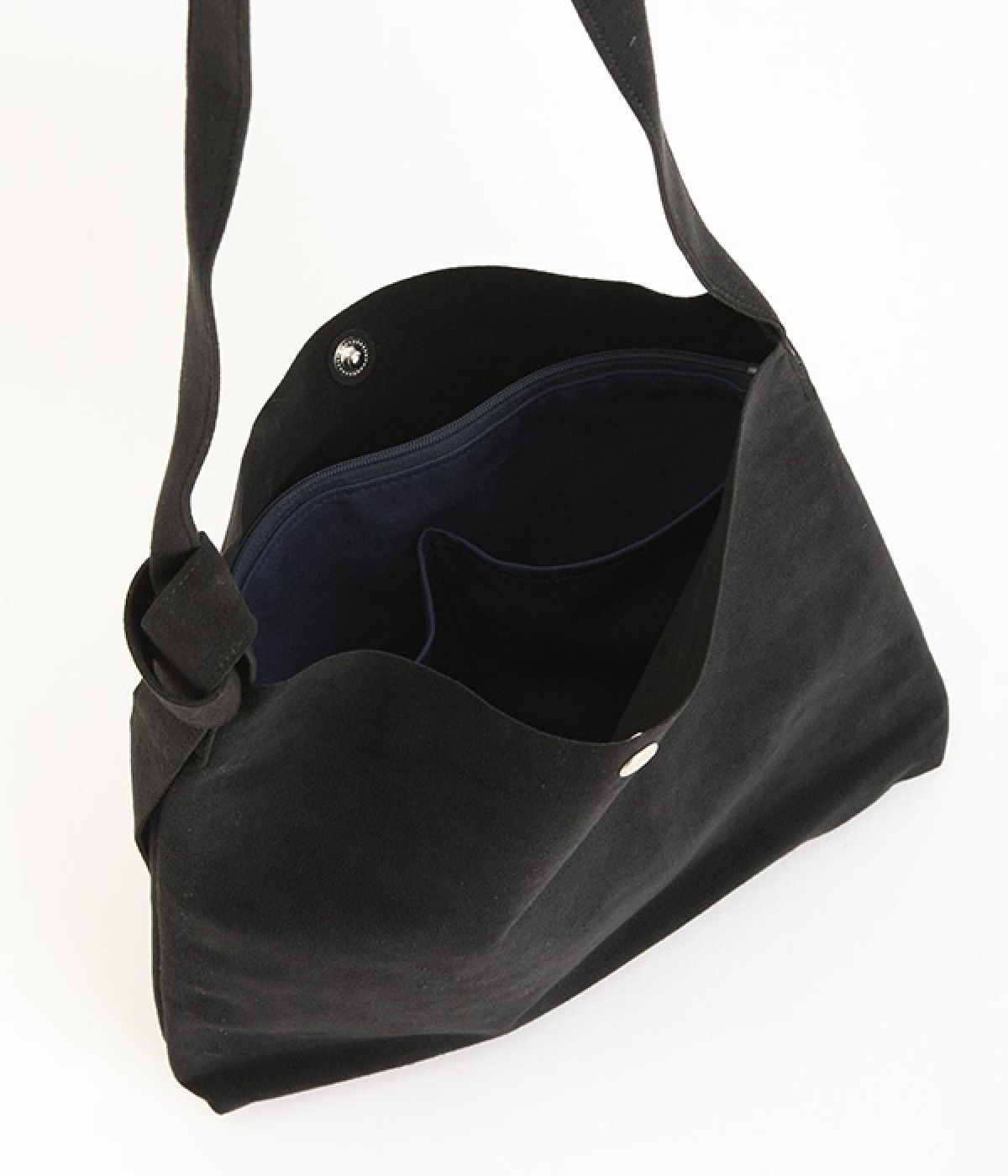 高級感のある雰囲気のフェイクスエードショルダーバッグです。おでかけにちょうどよいサイズ感で、ファスナー付きのファスナーポケットで収納力も抜群です。ショルダーの紐は結んで長さを調節できます。