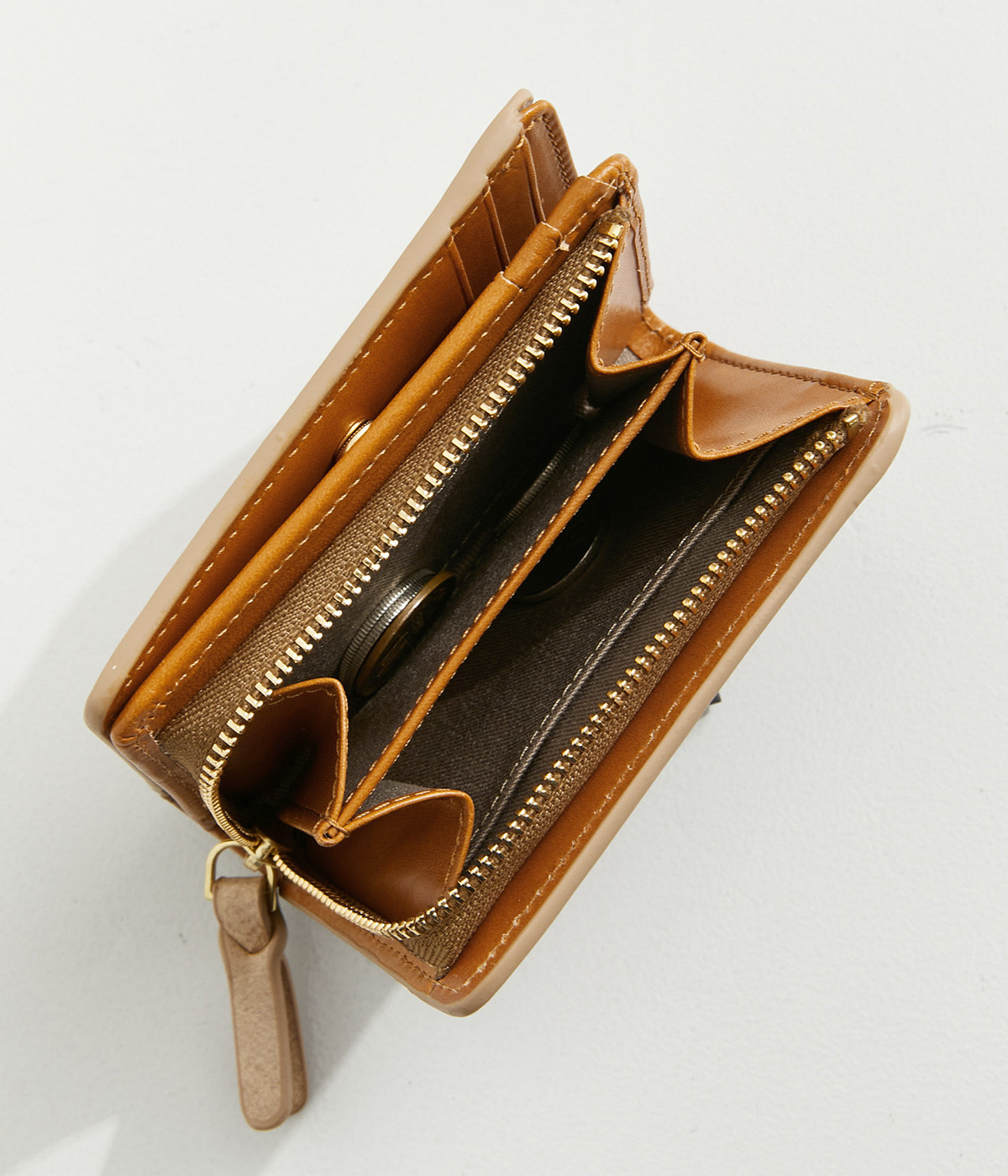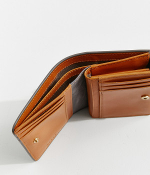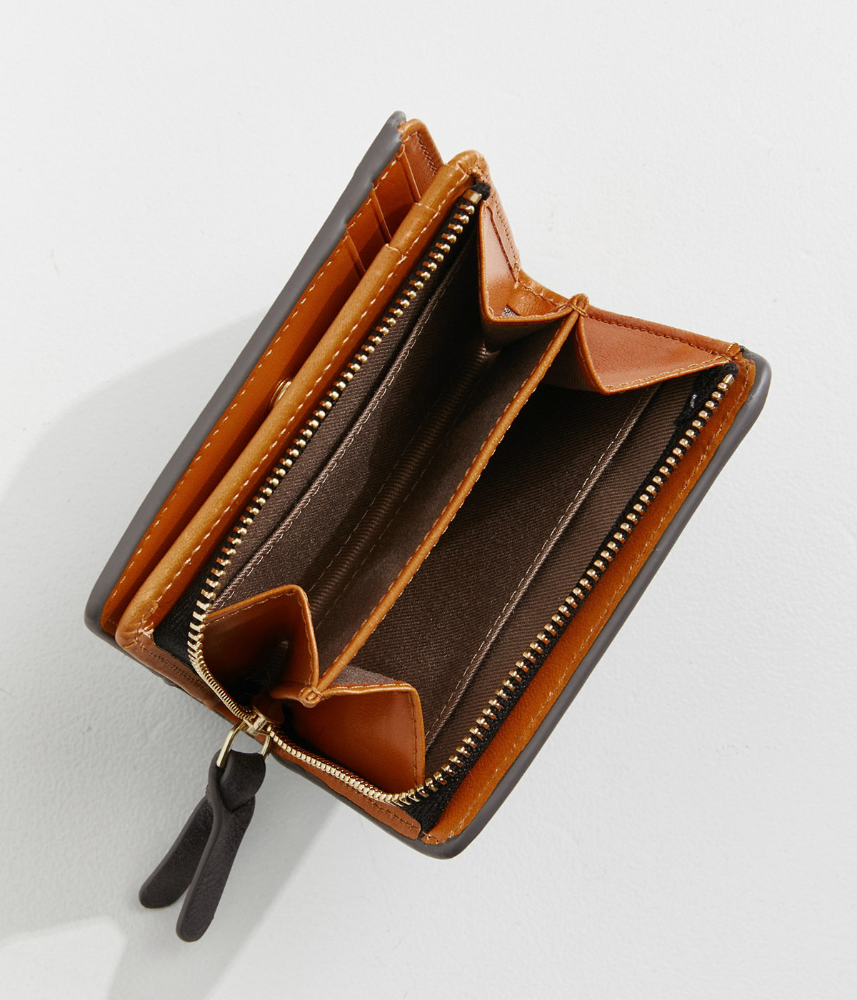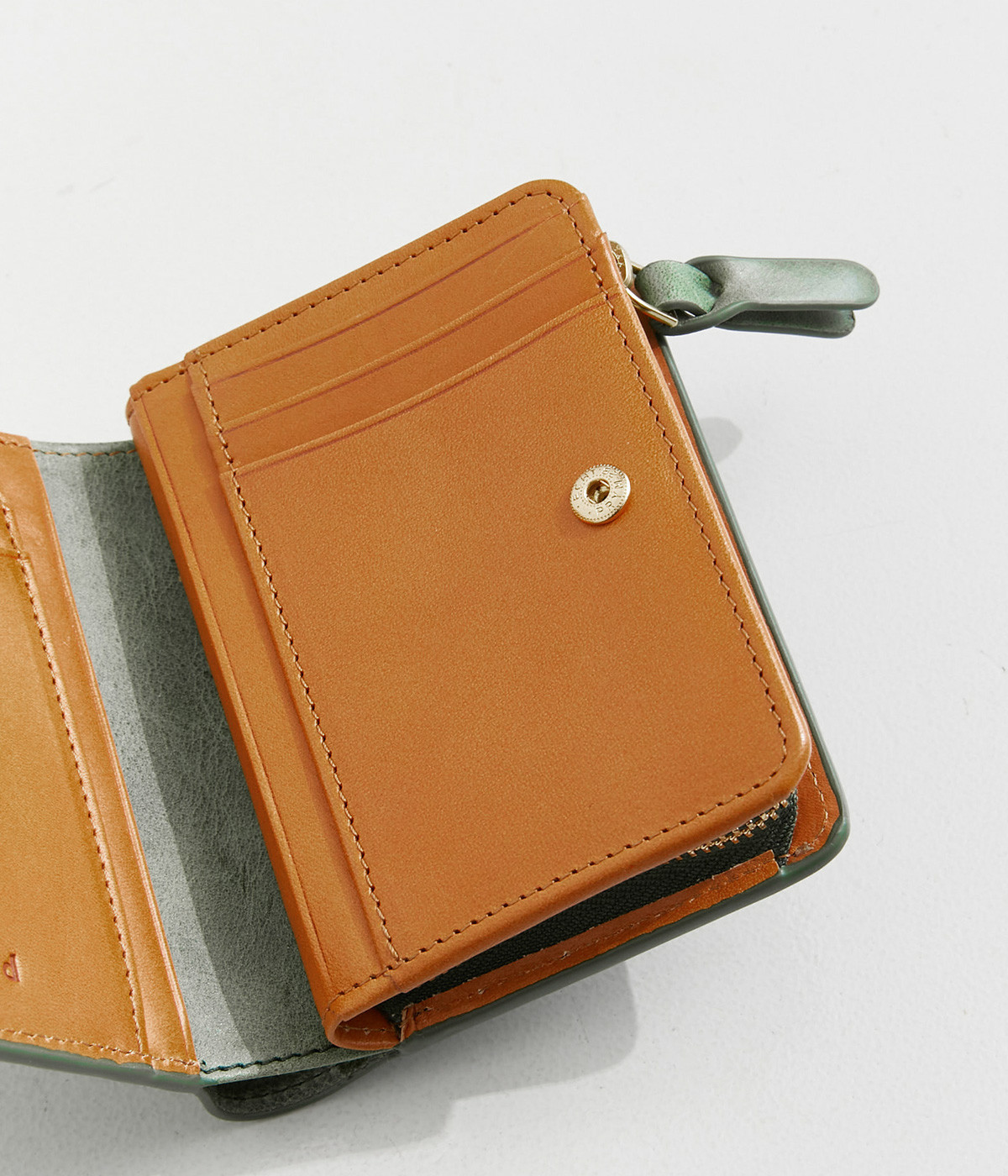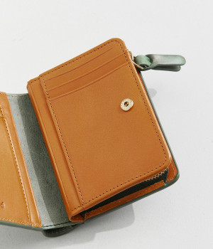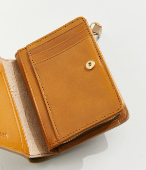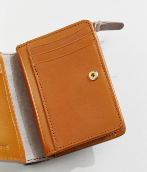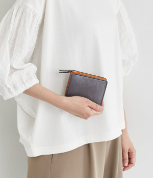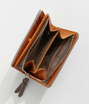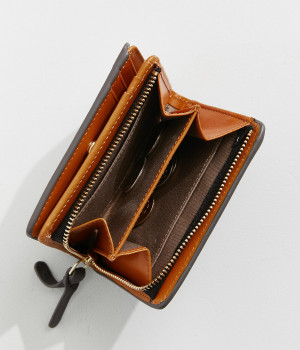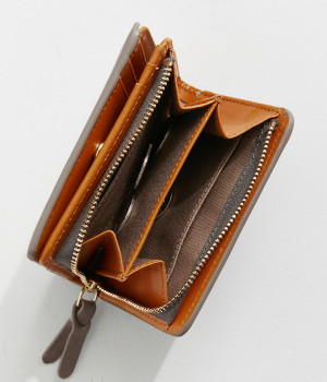 手にしっくりなじむサイズ感ながら、カードポケットや札入れも充実し、仕切りもついているのですっきり収納できます。コイン収納部は外側に設けているので本体をあけることなく出し入れ可能。L字ファスナーで大きく開きます。
