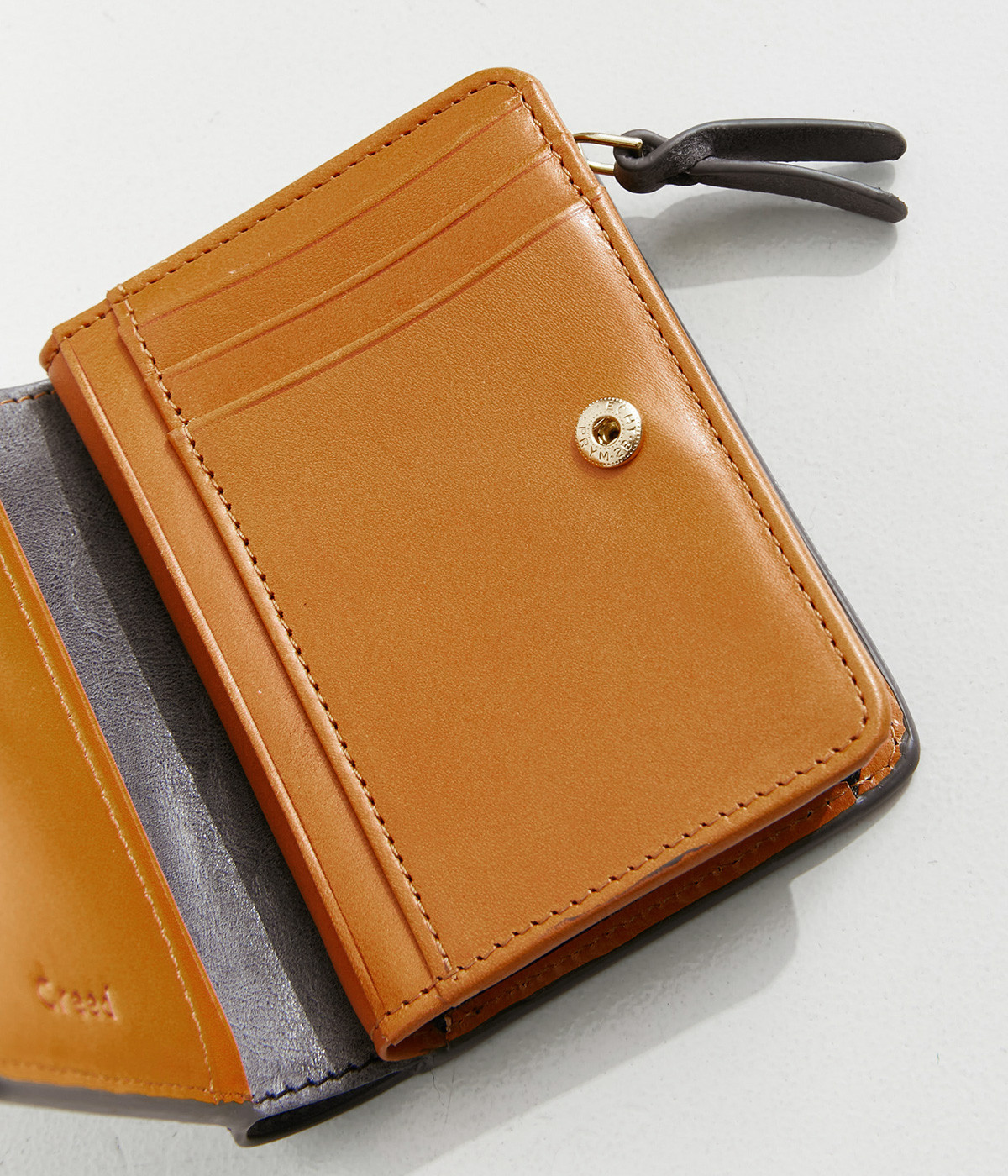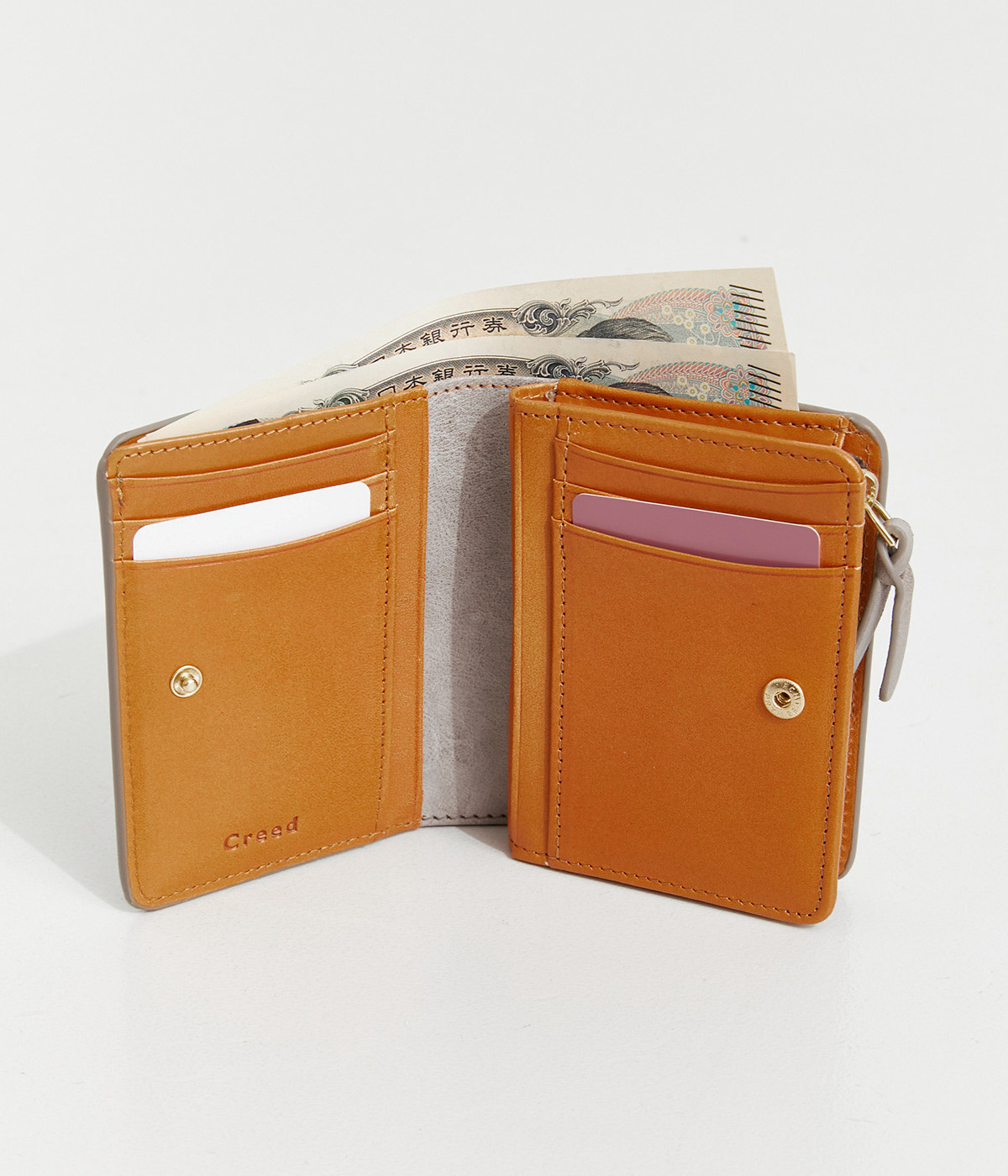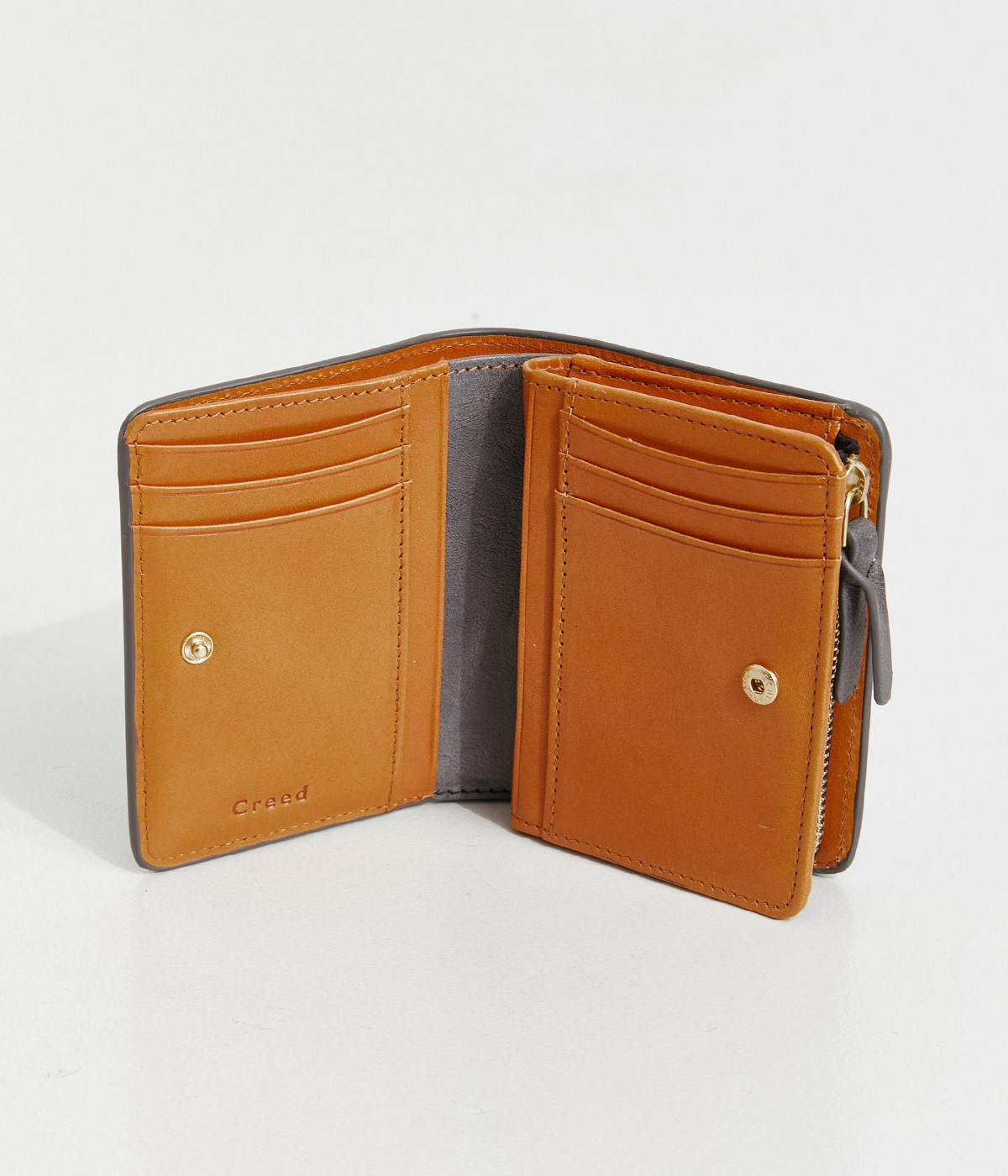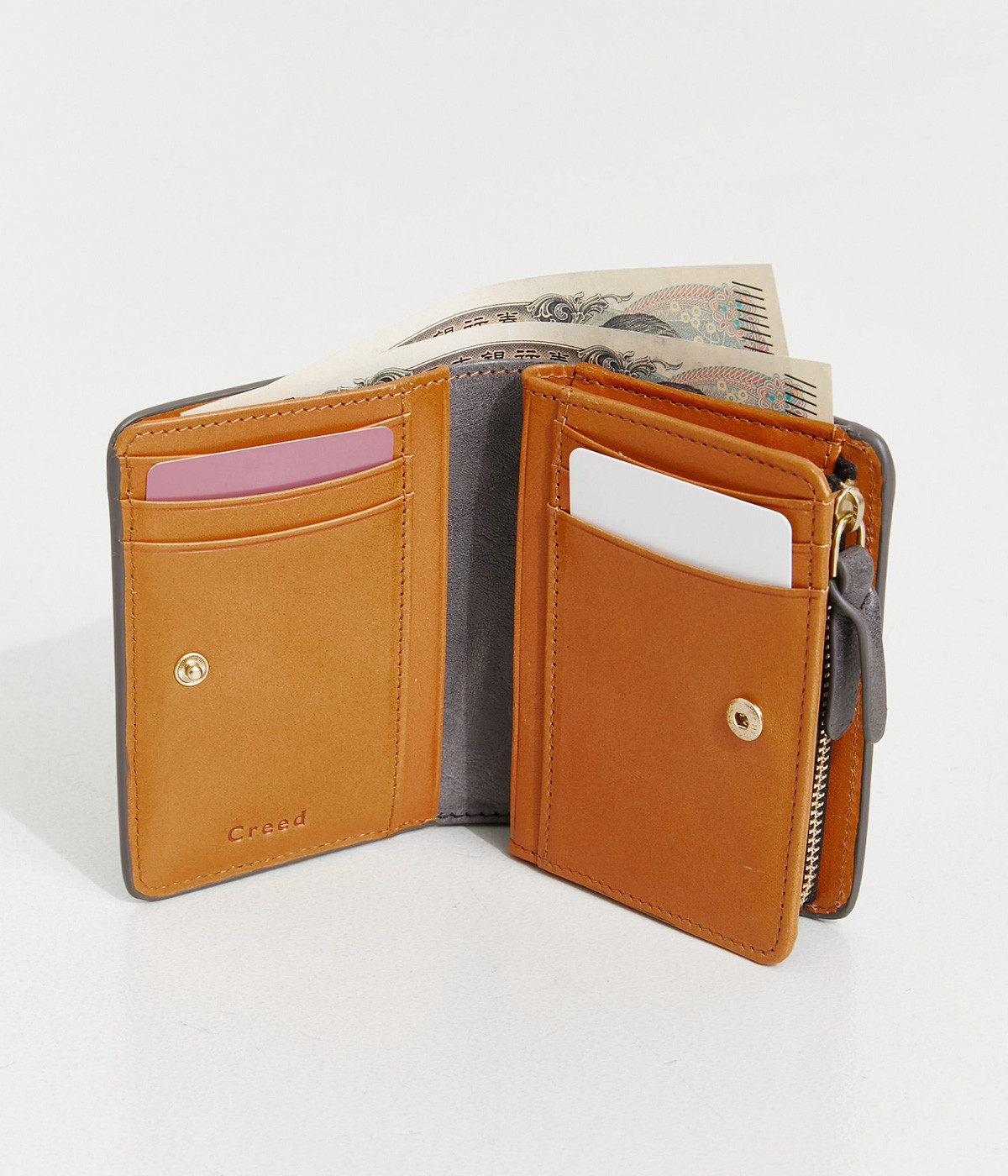 手にしっくりなじむサイズ感ながら、カードポケットや札入れも充実し、仕切りもついているのですっきり収納できます。コイン収納部は外側に設けているので本体をあけることなく出し入れ可能。L字ファスナーで大きく開きます。