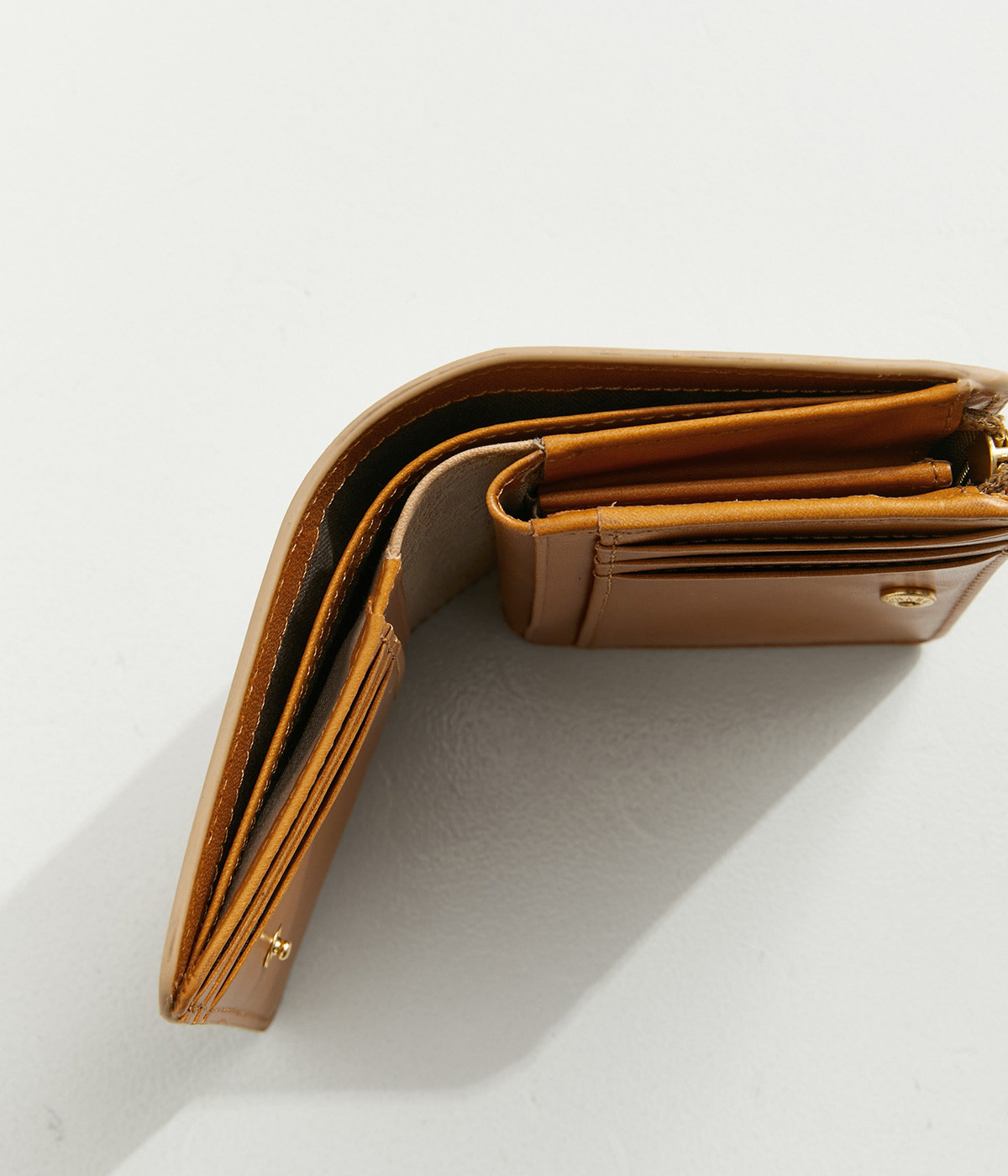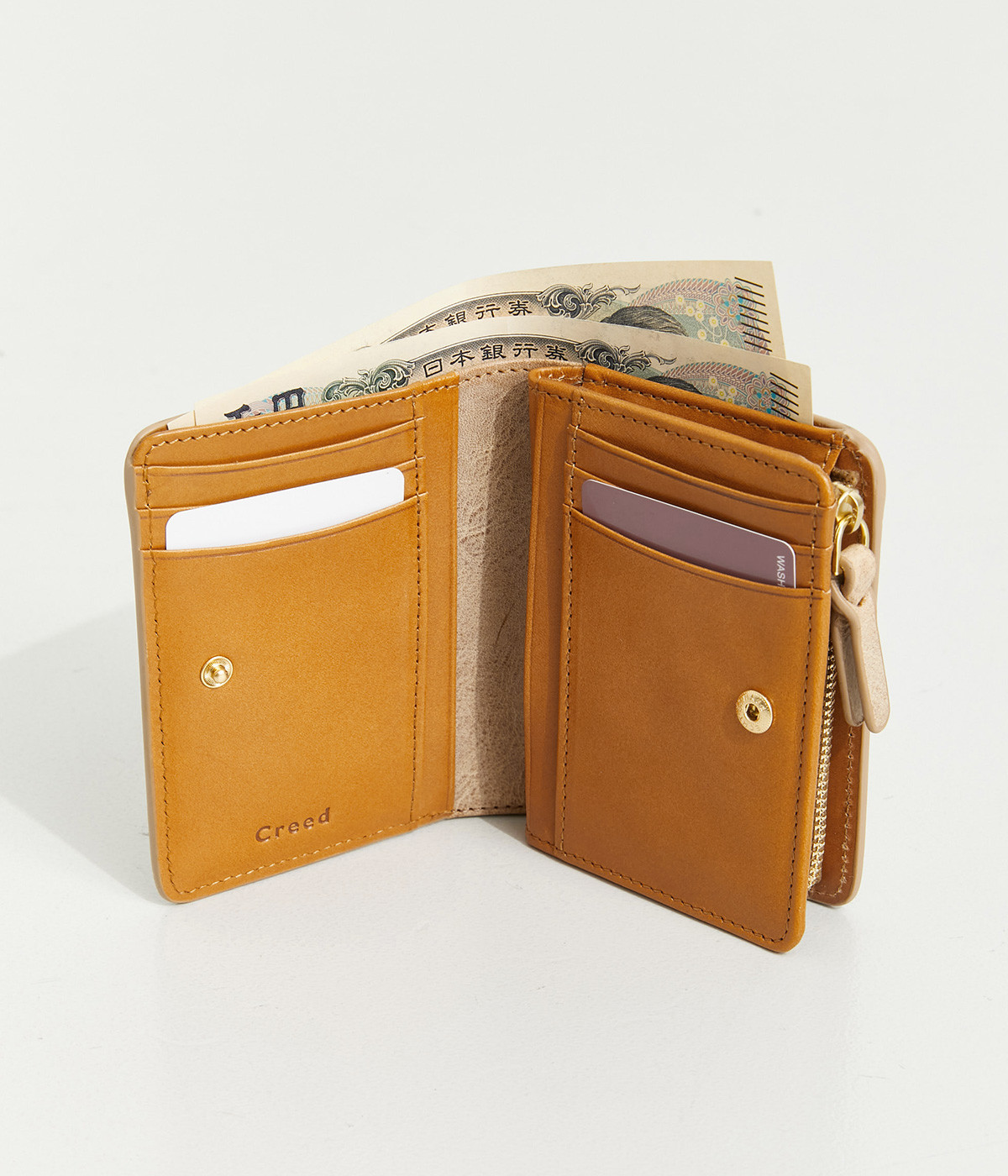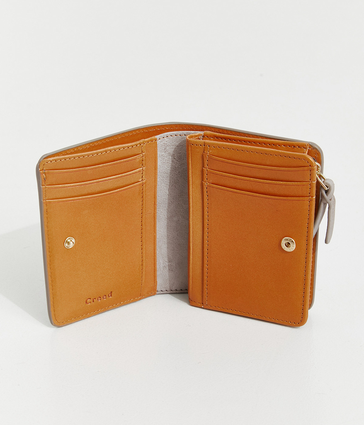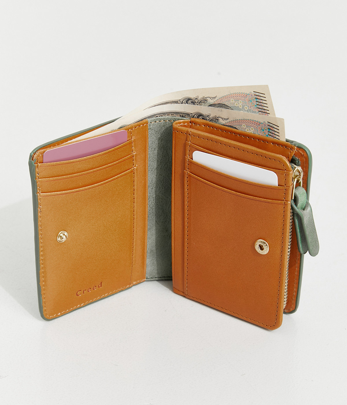 手にしっくりなじむサイズ感ながら、カードポケットや札入れも充実し、仕切りもついているのですっきり収納できます。コイン収納部は外側に設けているので本体をあけることなく出し入れ可能。L字ファスナーで大きく開きます。
