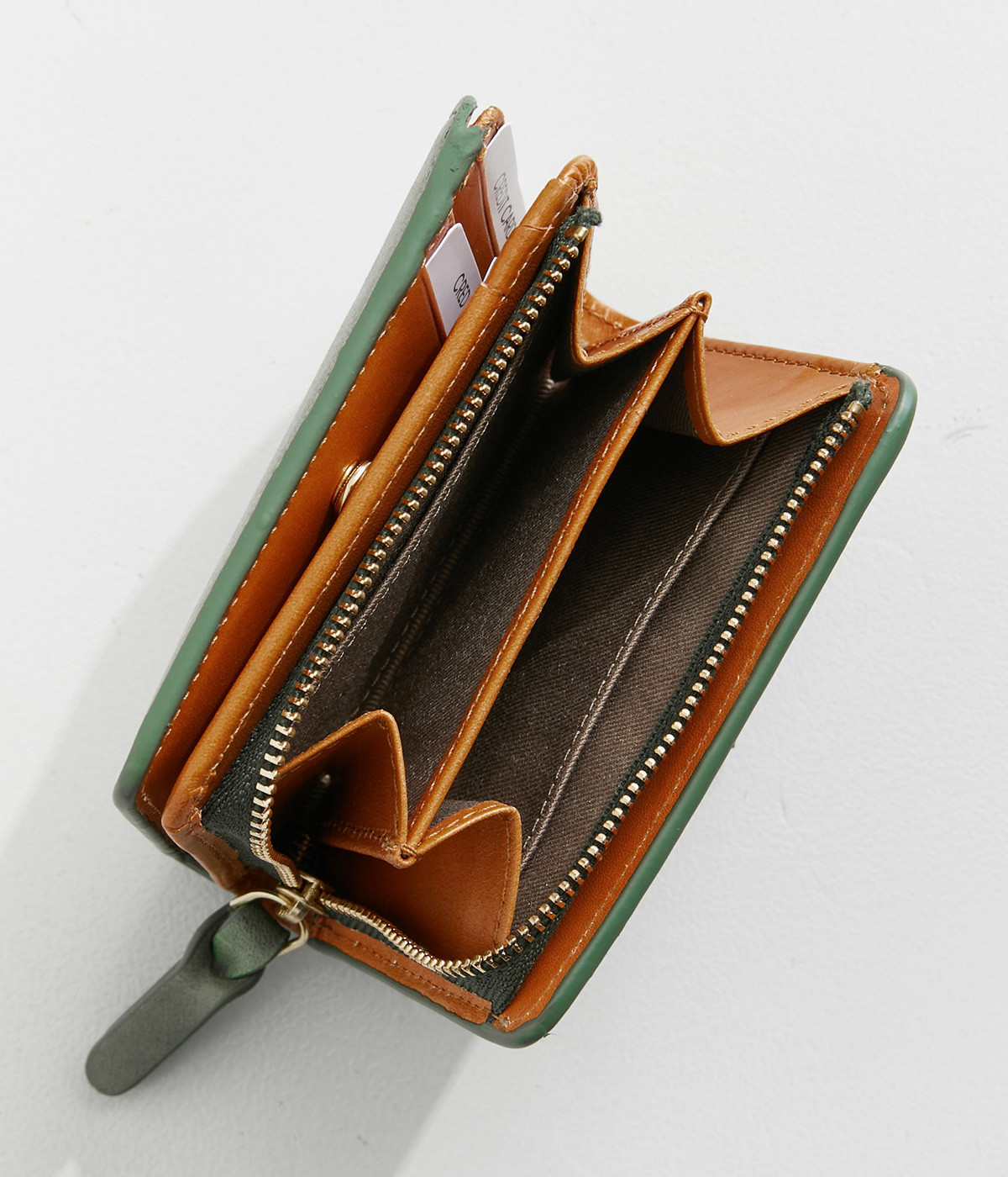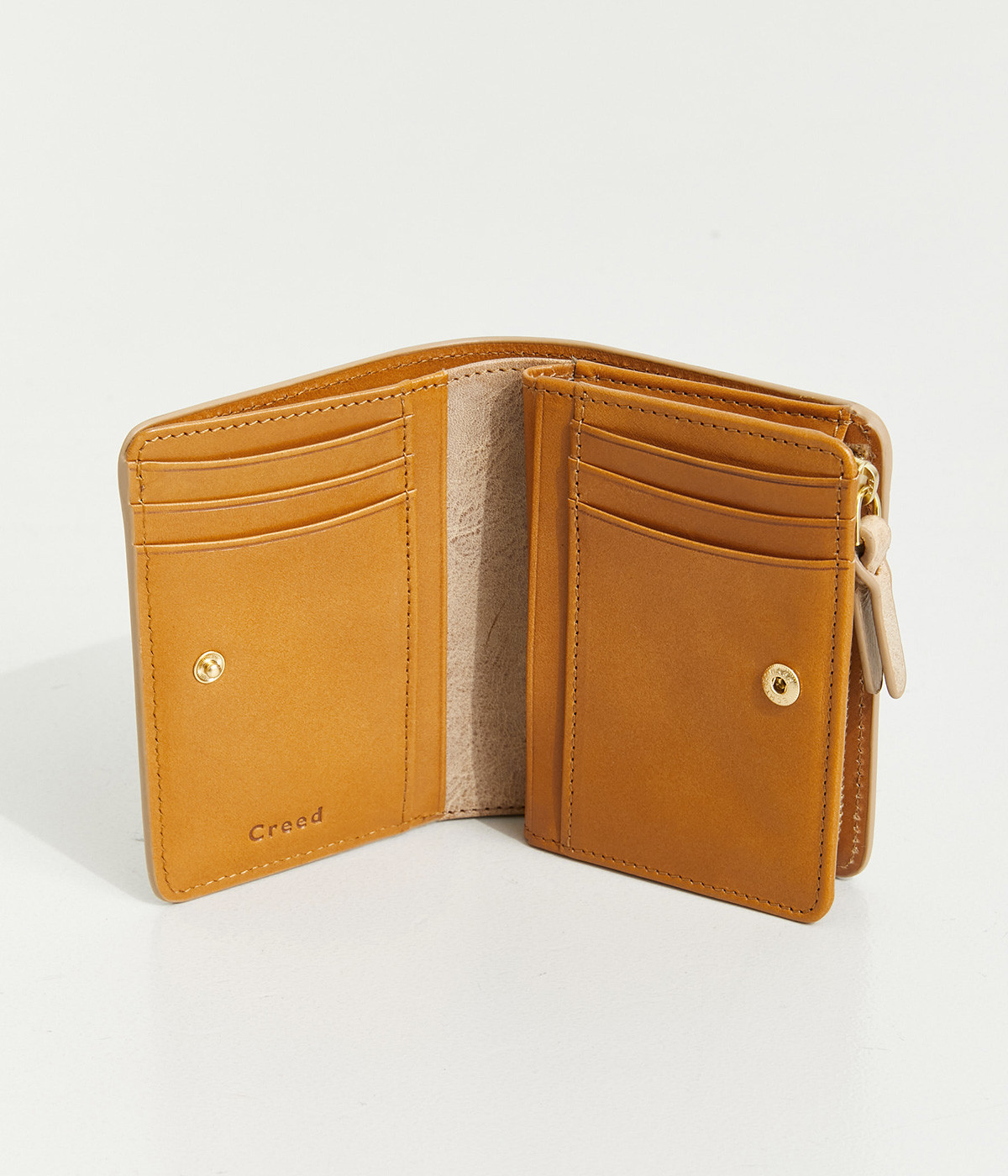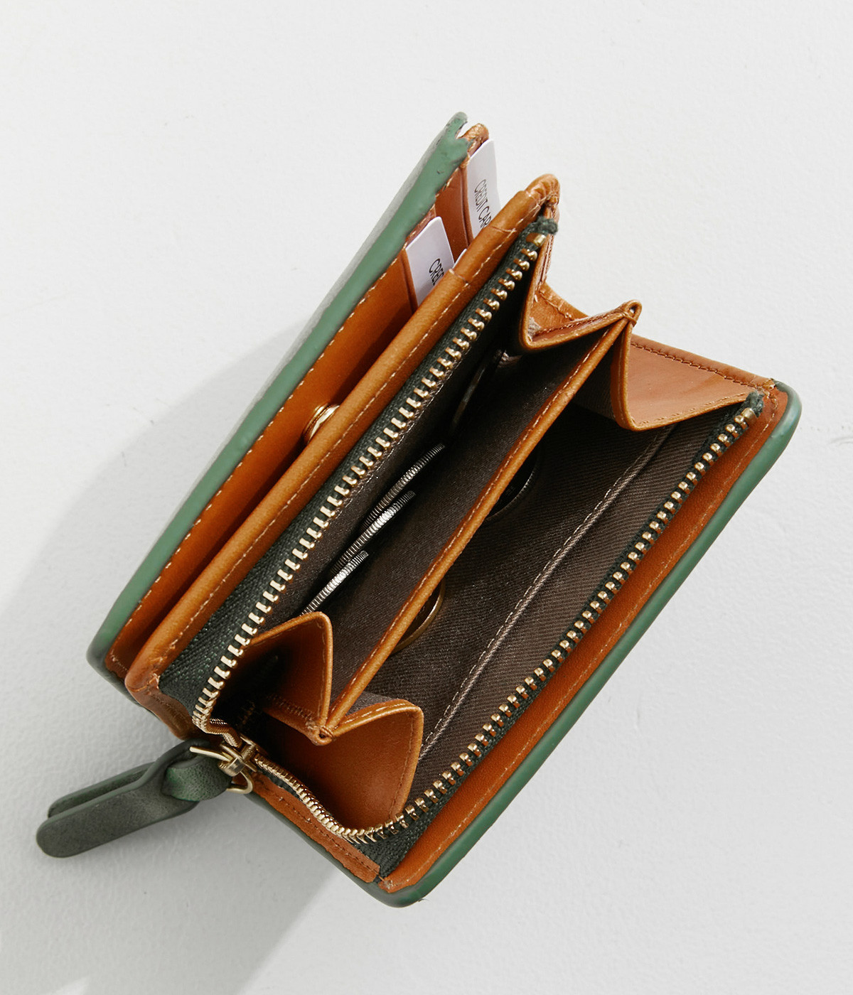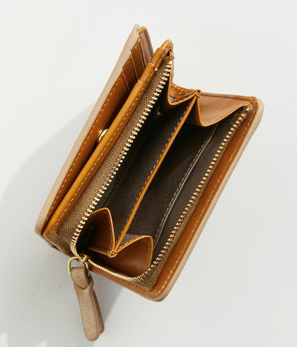 手にしっくりなじむサイズ感ながら、カードポケットや札入れも充実し、仕切りもついているのですっきり収納できます。コイン収納部は外側に設けているので本体をあけることなく出し入れ可能。L字ファスナーで大きく開きます。