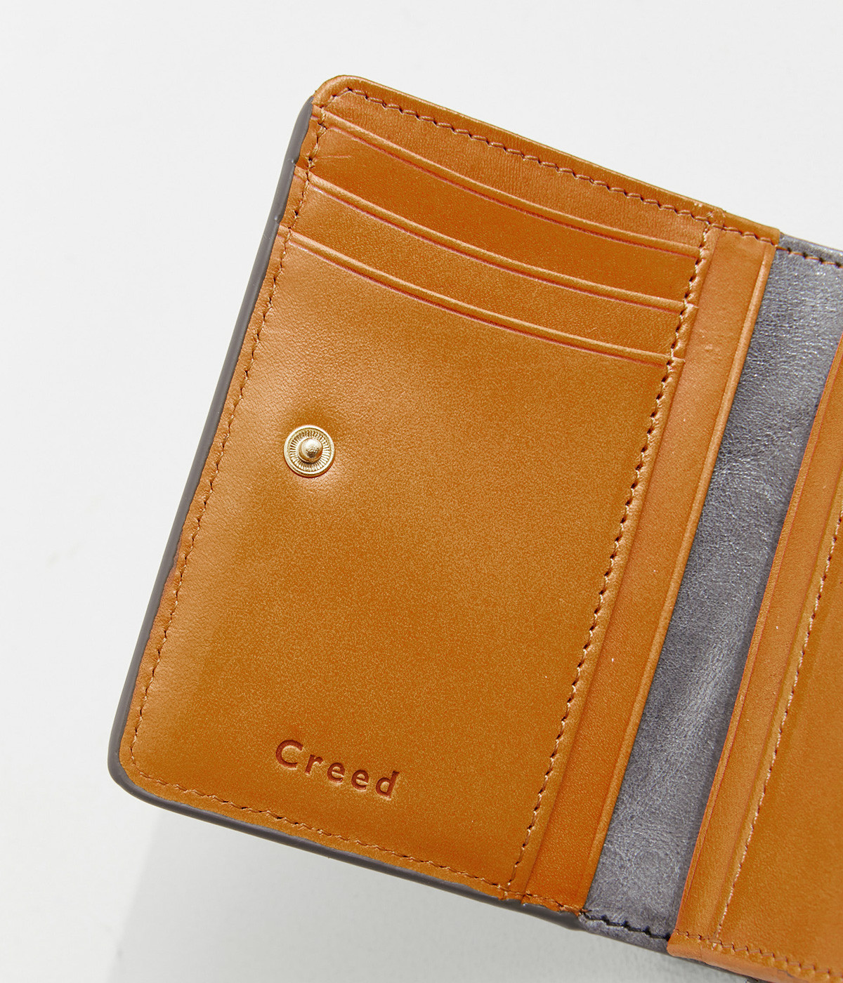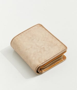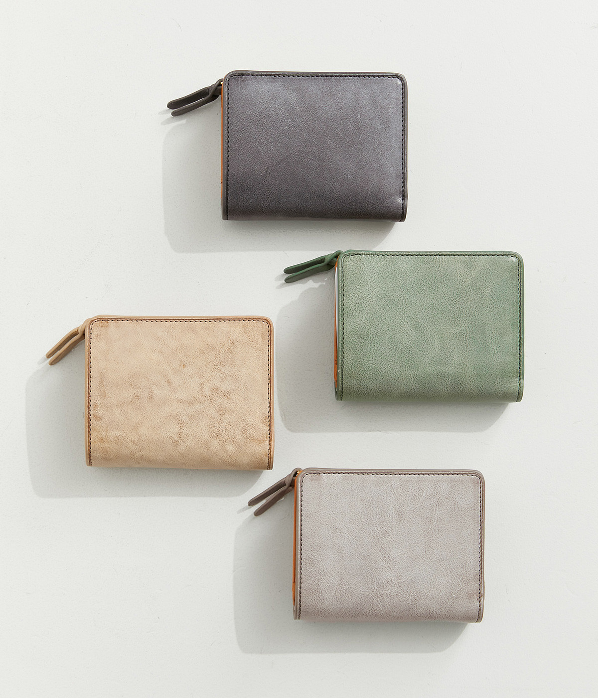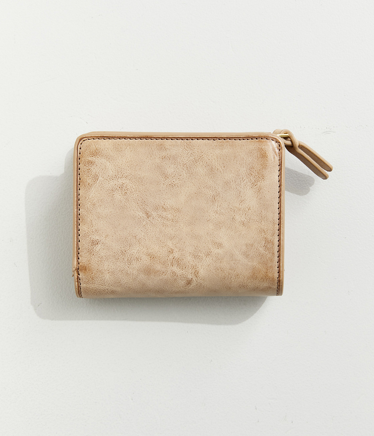 ホワイトワックス加工によるヴィンテージ感のある風合いのレザー。使い込むほどにワックスが革に浸透し、透明感のある色みや味わい深いツヤが増していきます。コシは残しつつも軽量なのも魅力的。
