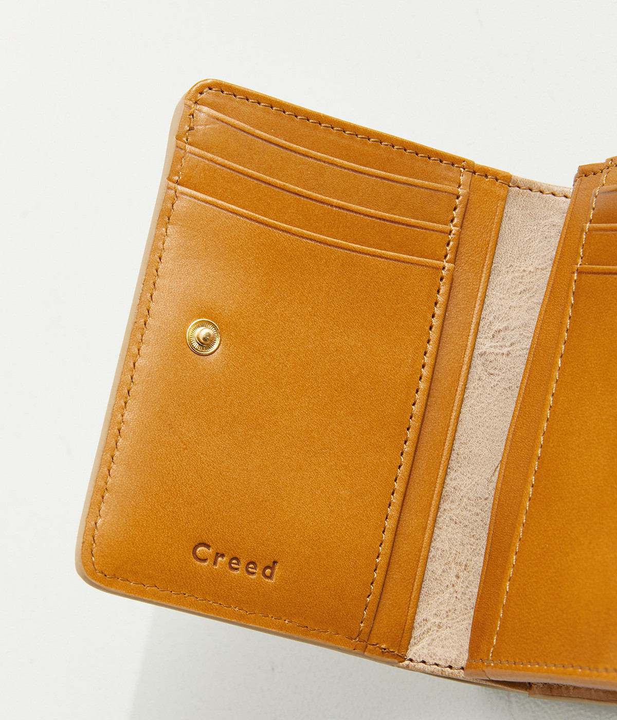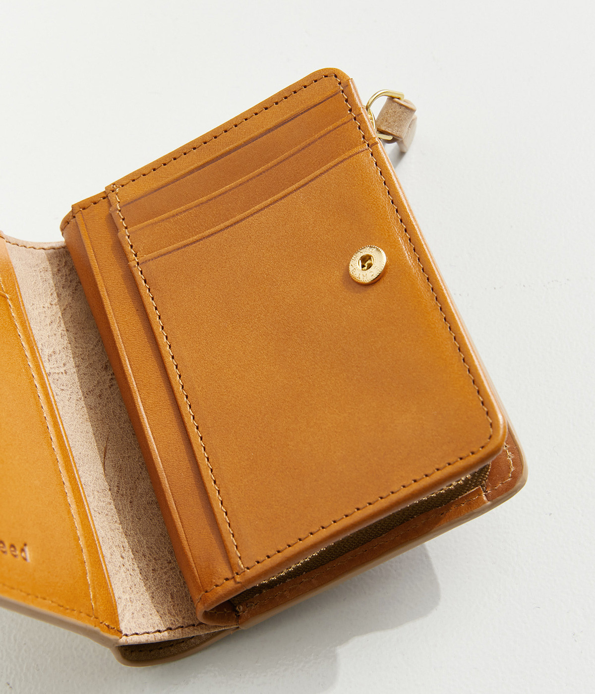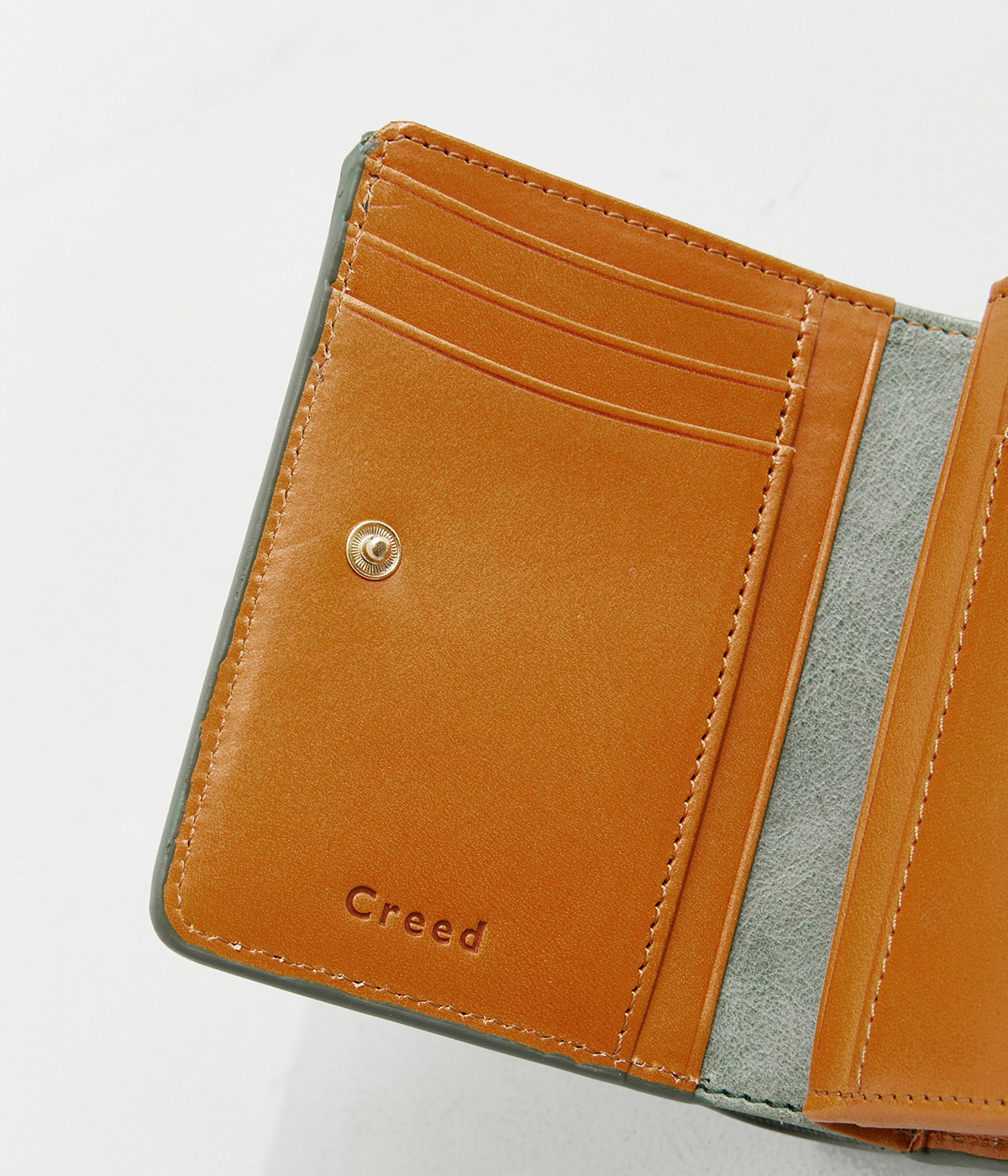 ホワイトワックス加工によるヴィンテージ感のある風合いのレザー。使い込むほどにワックスが革に浸透し、透明感のある色みや味わい深いツヤが増していきます。コシは残しつつも軽量なのも魅力的。