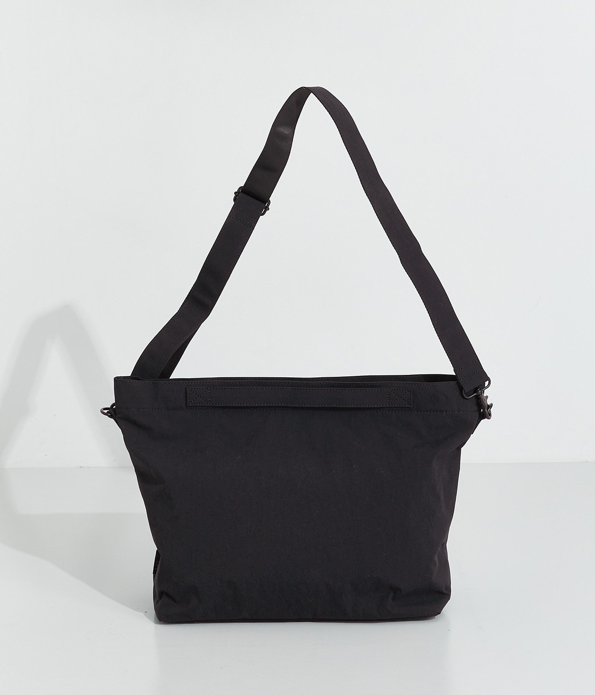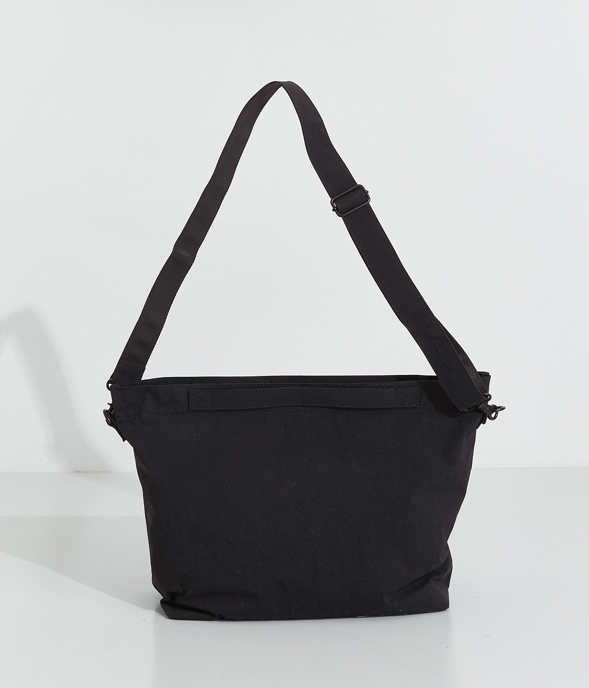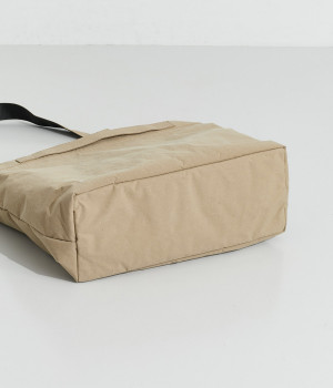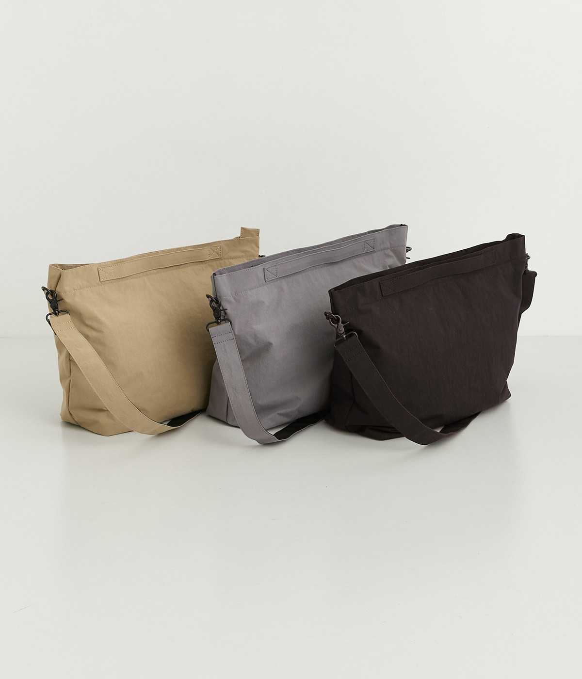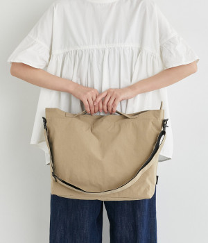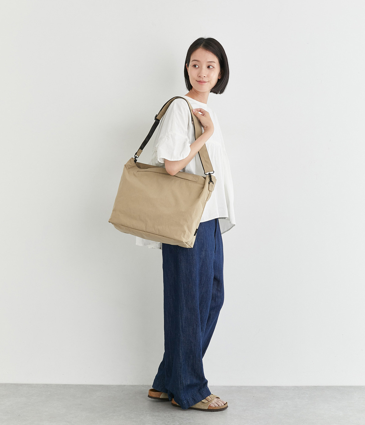 たっぷり大容量なショルダーバッグです。マチがついているので厚みのあるお弁当箱などもすっきり収まります。ショルダーベルトは取り外し可能で、手提げにするとハンサムでスマートな印象にチェンジ。