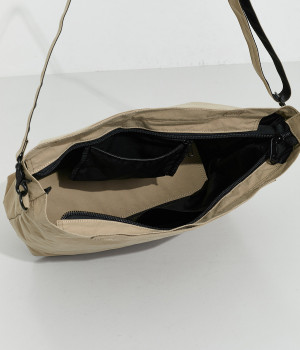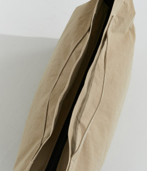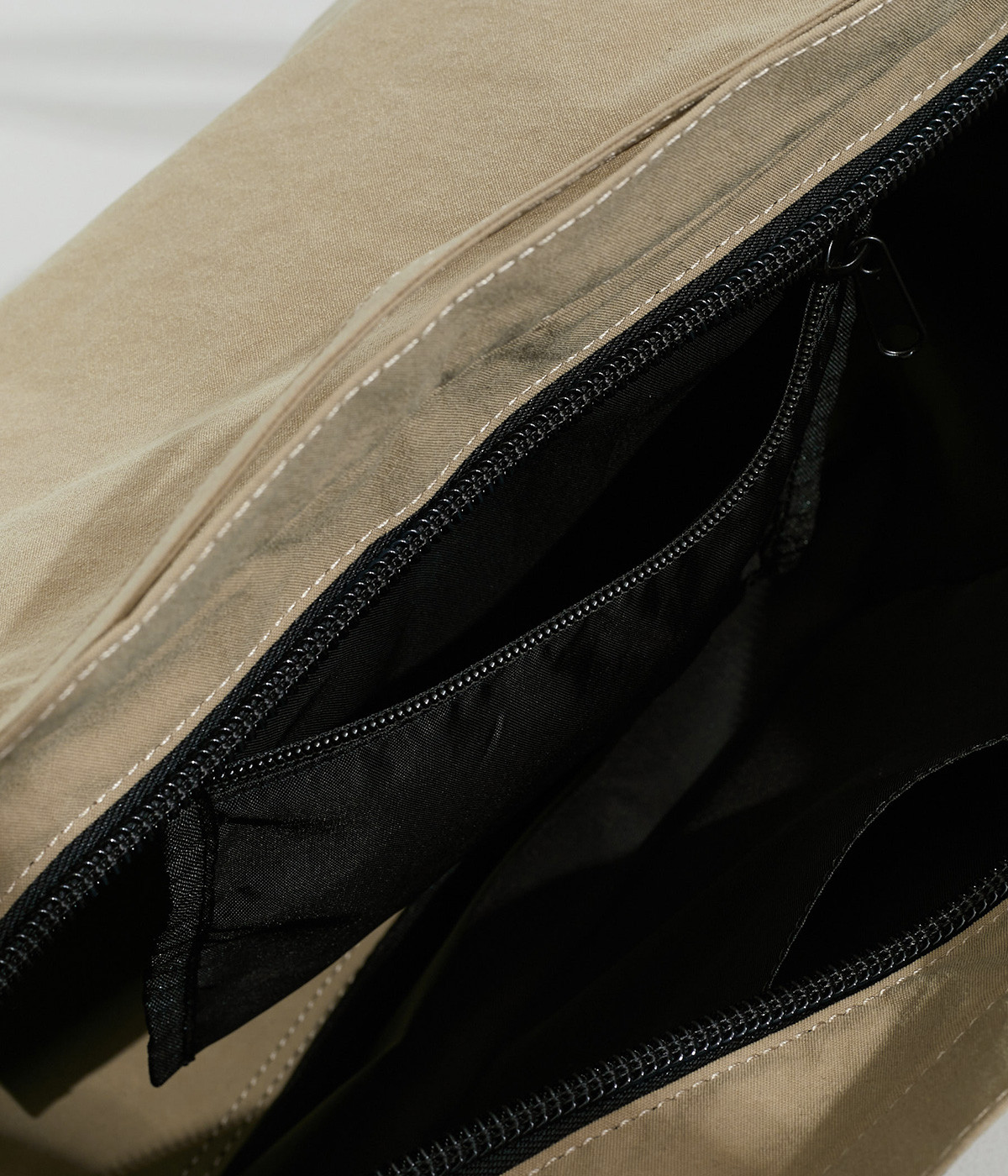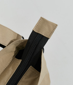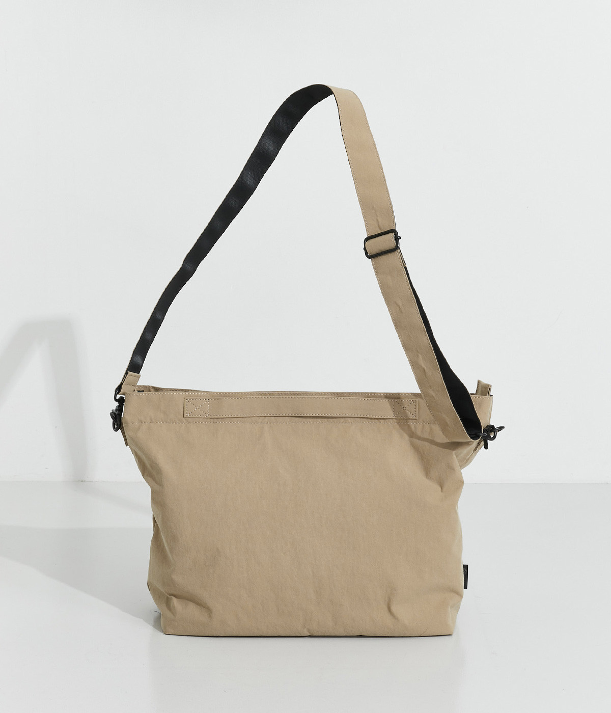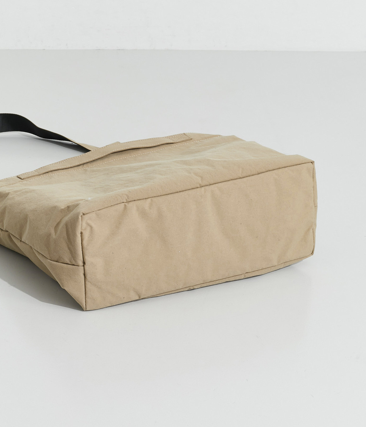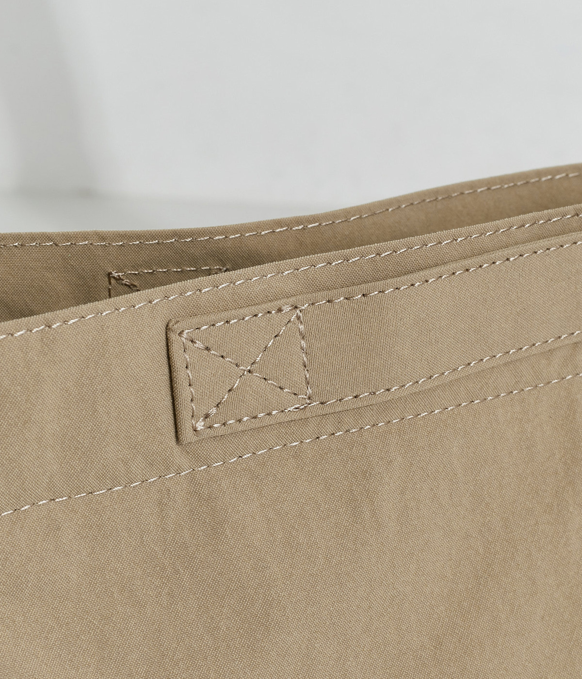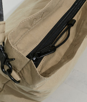 キャンバス地のような見た目とコシのある素材がタフな印象を与えます。ナイロンなので軽さ、強度、撥水性、劣化耐久性に優れた強みも完備。