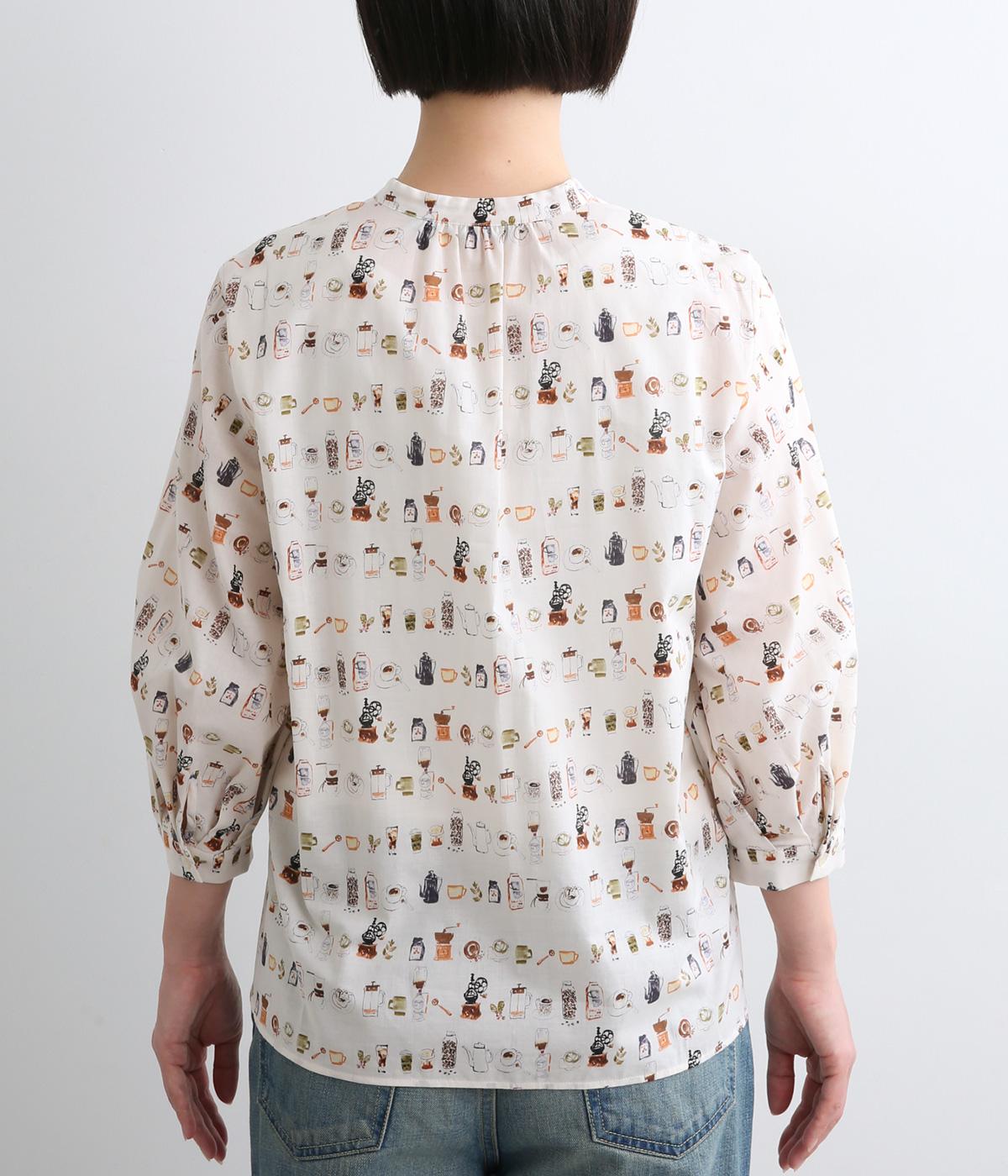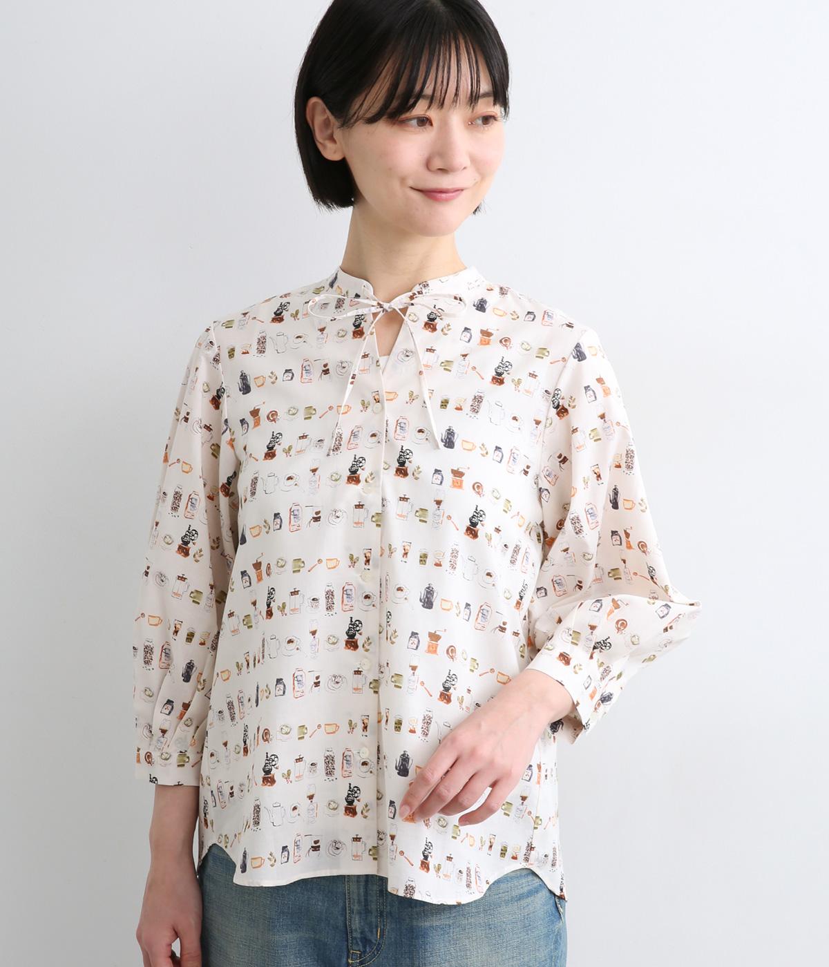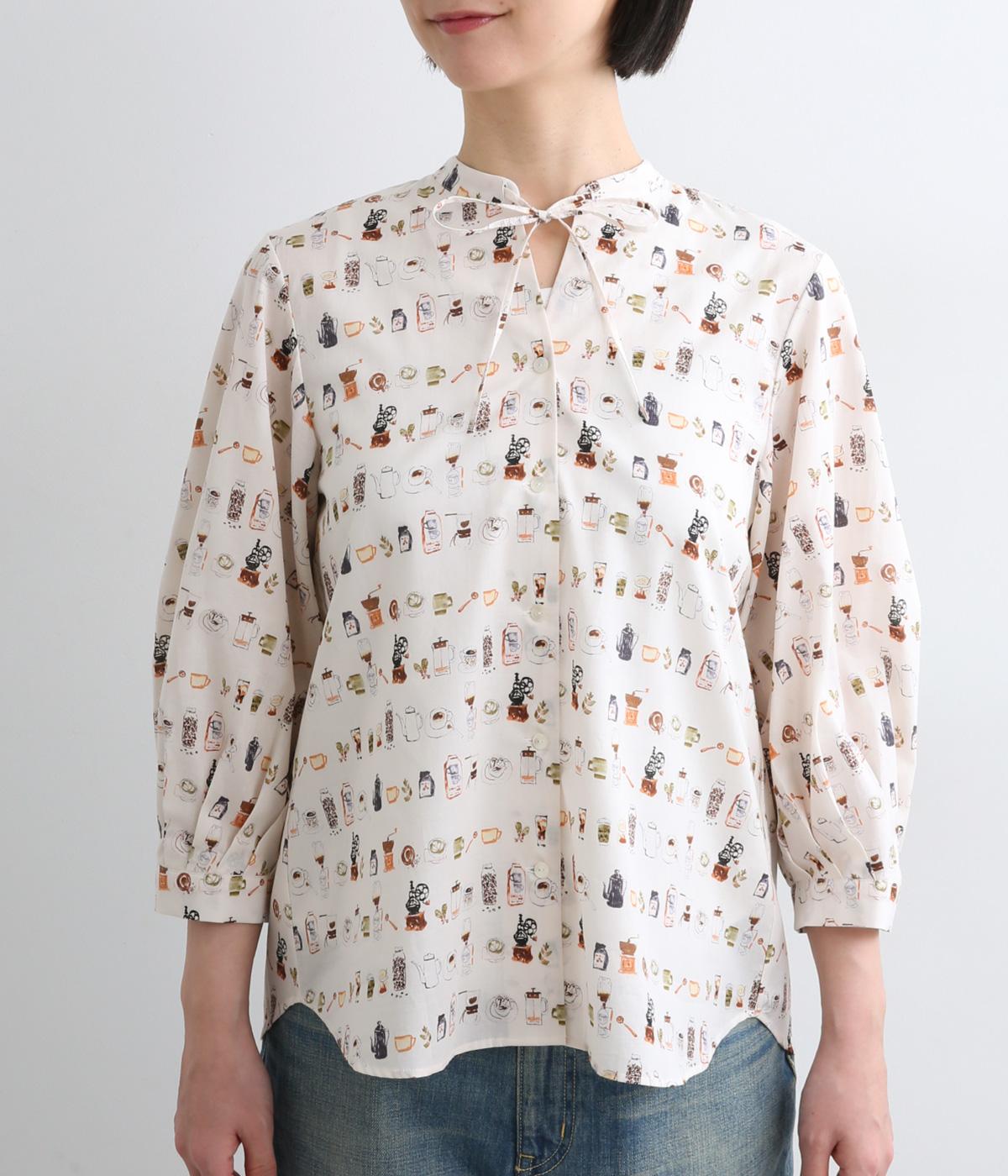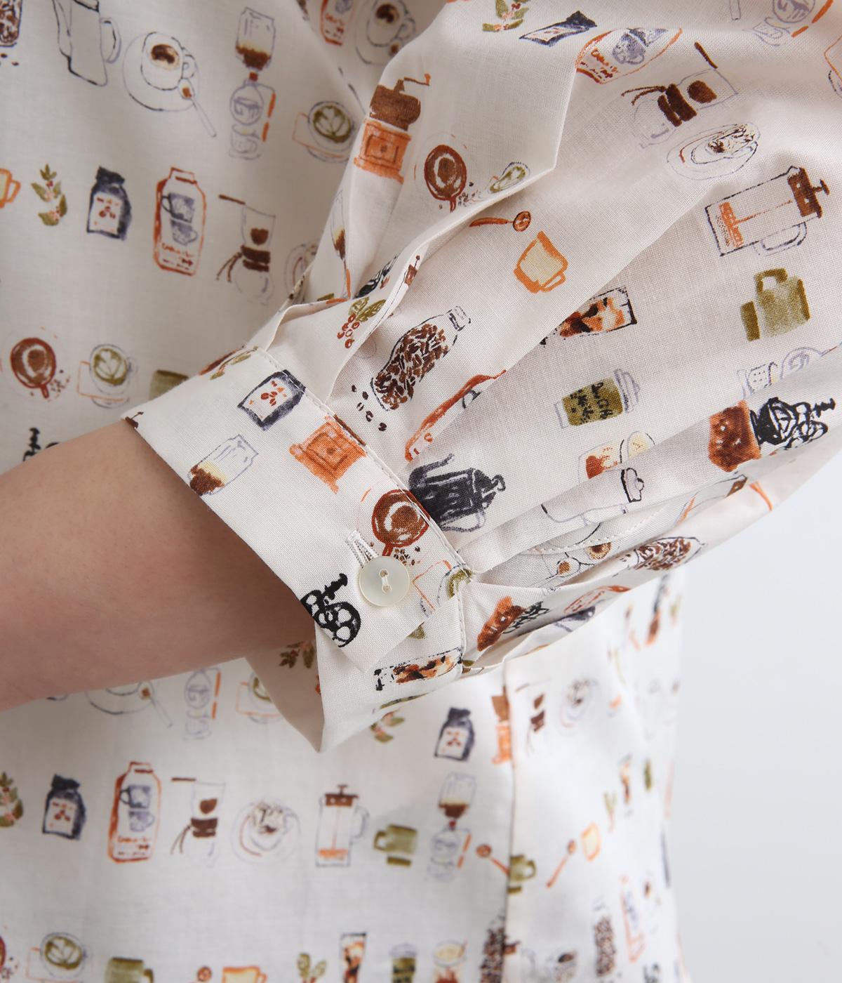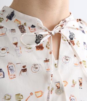 コーヒー豆やみる、ドリッパーなど息抜きタイムをイメージした総柄ブラウス。スキッパーカラーで顔まわりをすっきり見せ、細紐はラフに垂らしてもリボン結びでも◎。タック入りのボリューム袖もやさしい雰囲気にマッチしています。