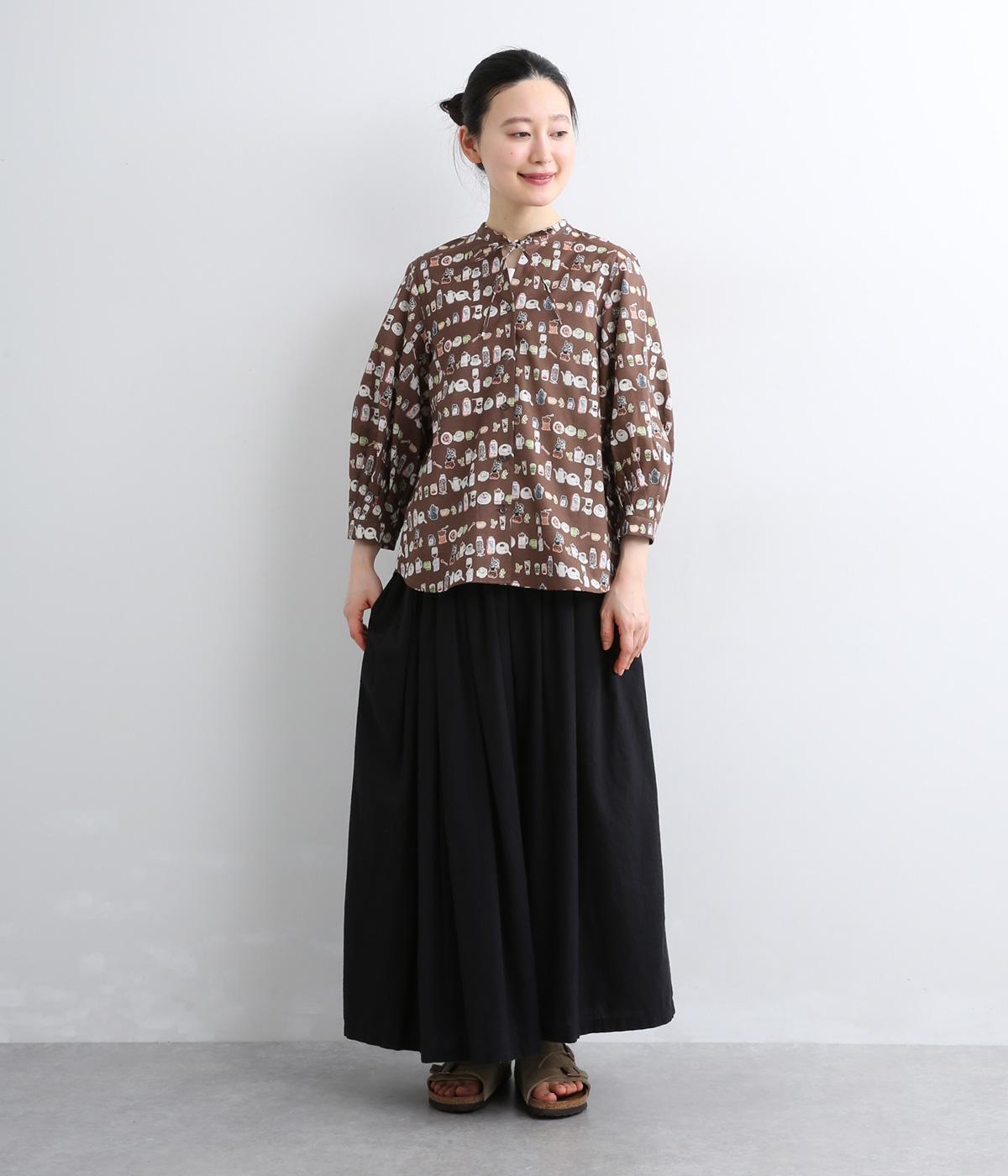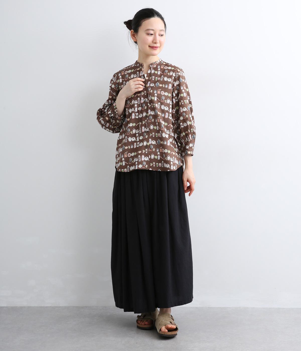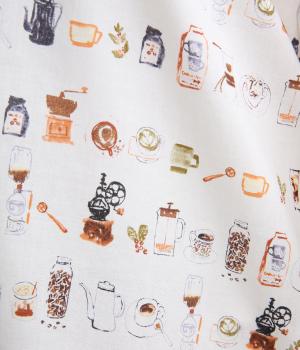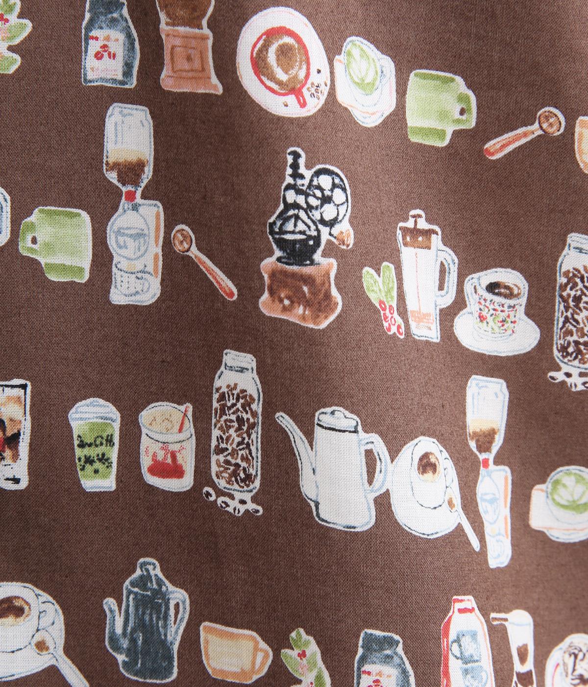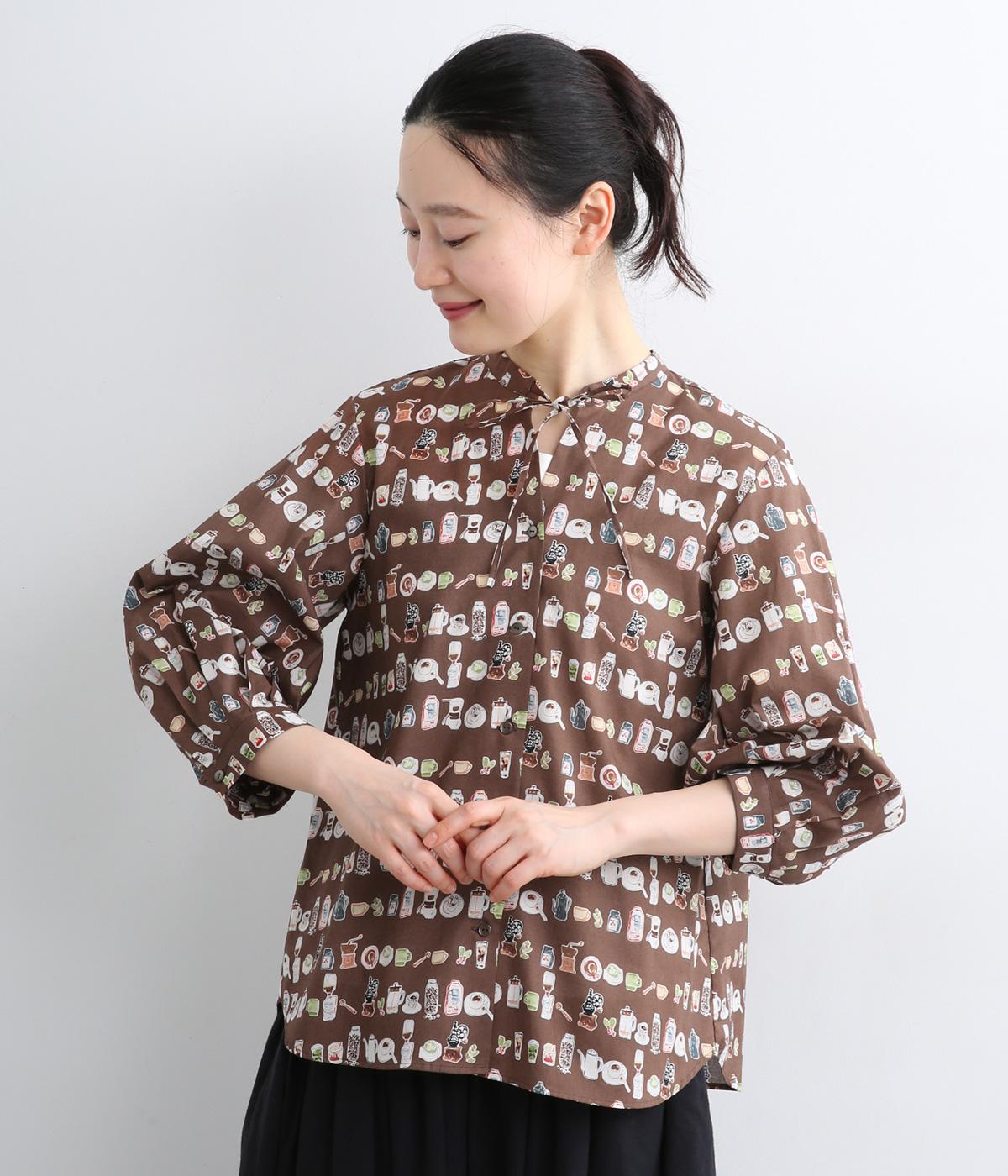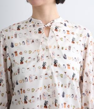 コーヒー豆やみる、ドリッパーなど息抜きタイムをイメージした総柄ブラウス。スキッパーカラーで顔まわりをすっきり見せ、細紐はラフに垂らしてもリボン結びでも◎。タック入りのボリューム袖もやさしい雰囲気にマッチしています。