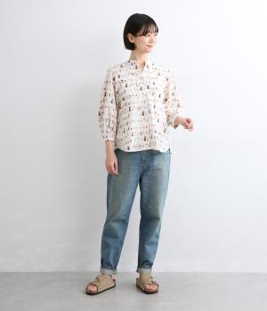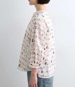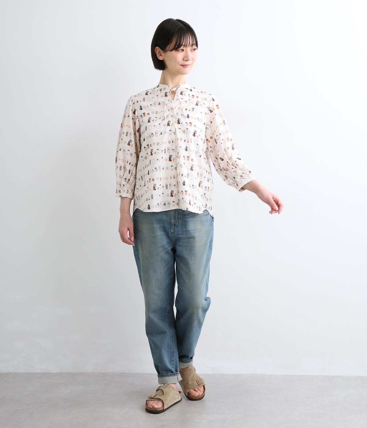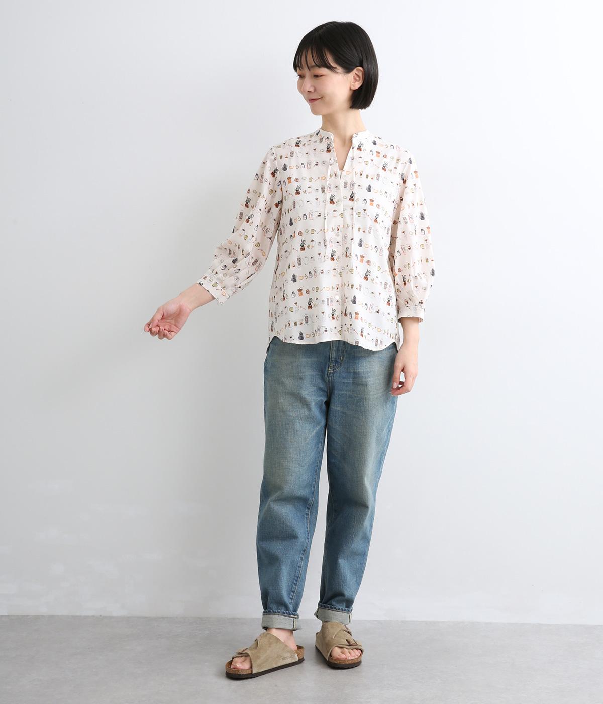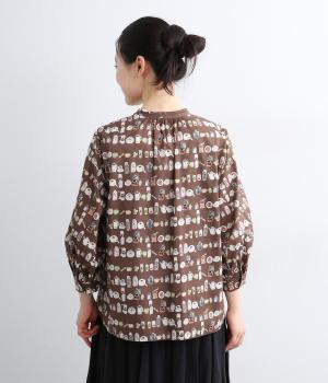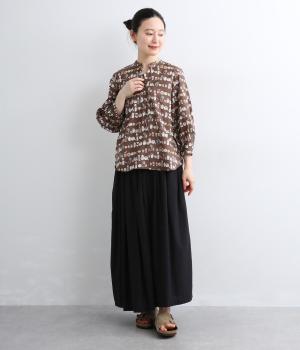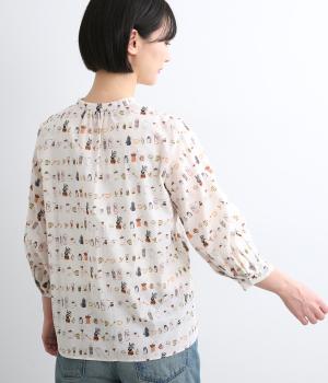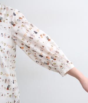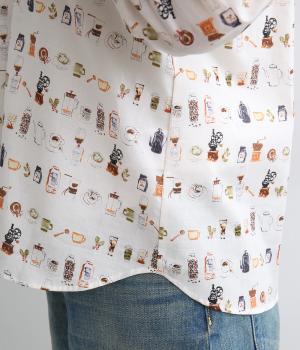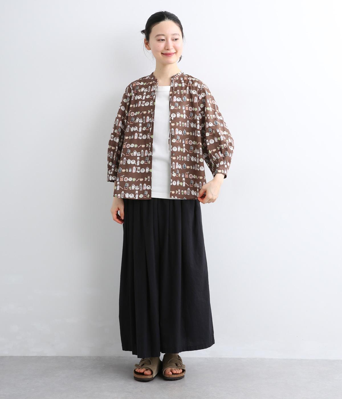コーヒー豆やみる、ドリッパーなど息抜きタイムをイメージした総柄ブラウス。スキッパーカラーで顔まわりをすっきり見せ、細紐はラフに垂らしてもリボン結びでも◎。タック入りのボリューム袖もやさしい雰囲気にマッチしています。