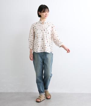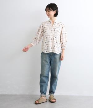 とても軽やかで通気性のいいコットン生地を使用し、着心地よく仕立てました。繊細な薄手素材でほんのり透けて、総柄でも抜け感のある印象です。