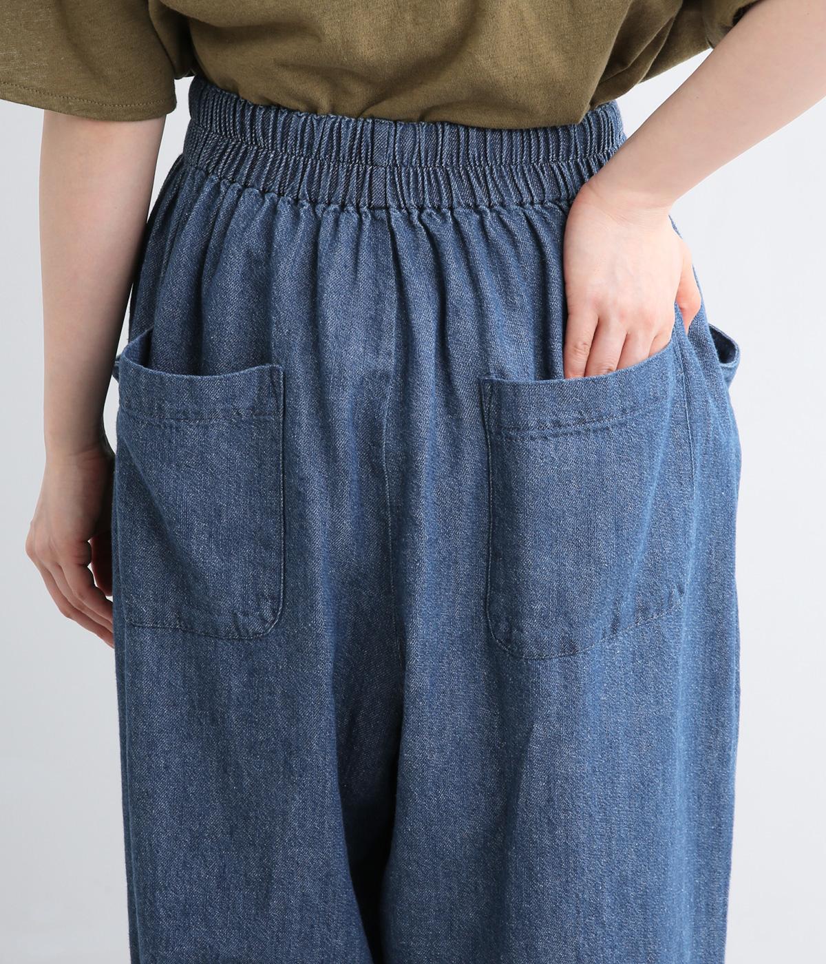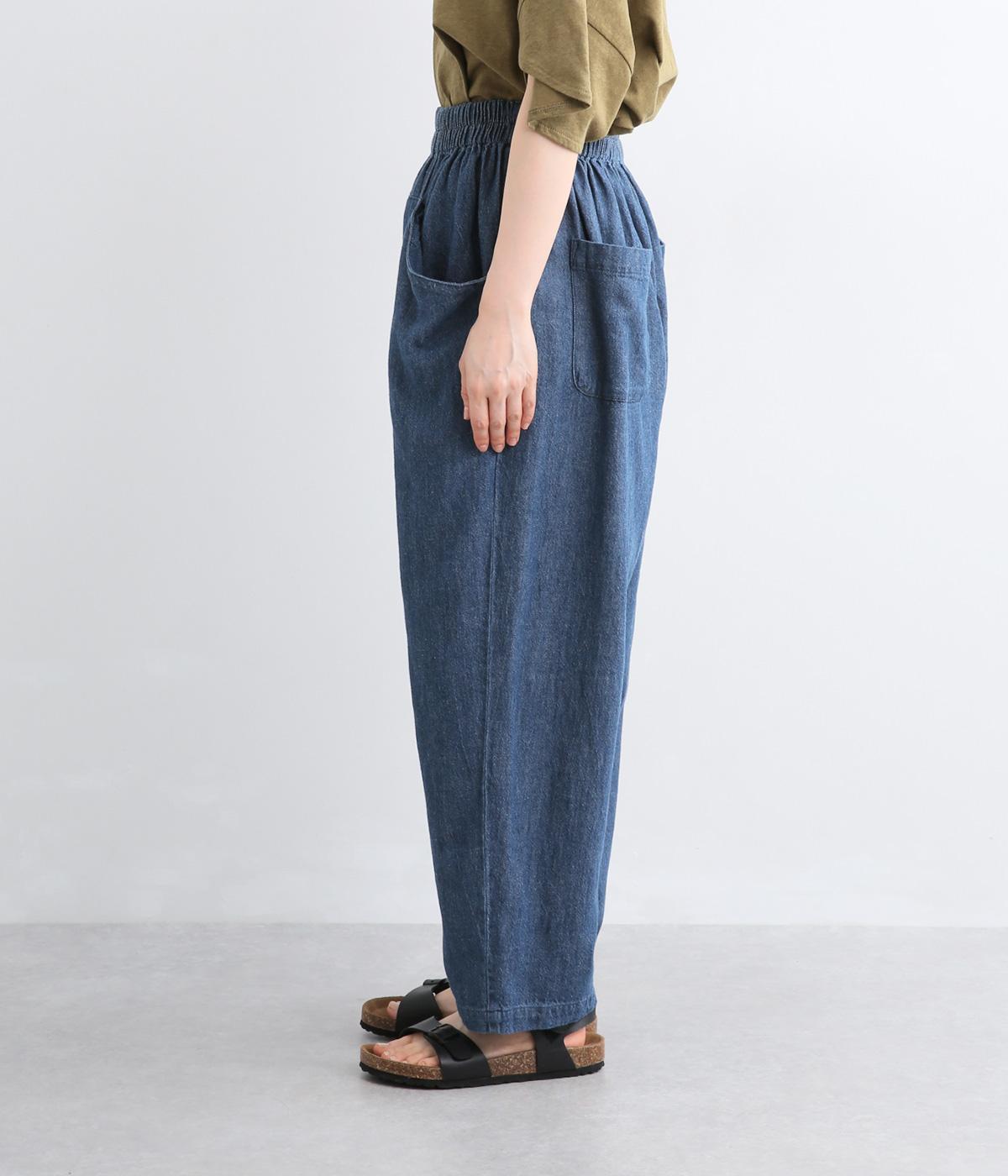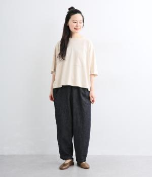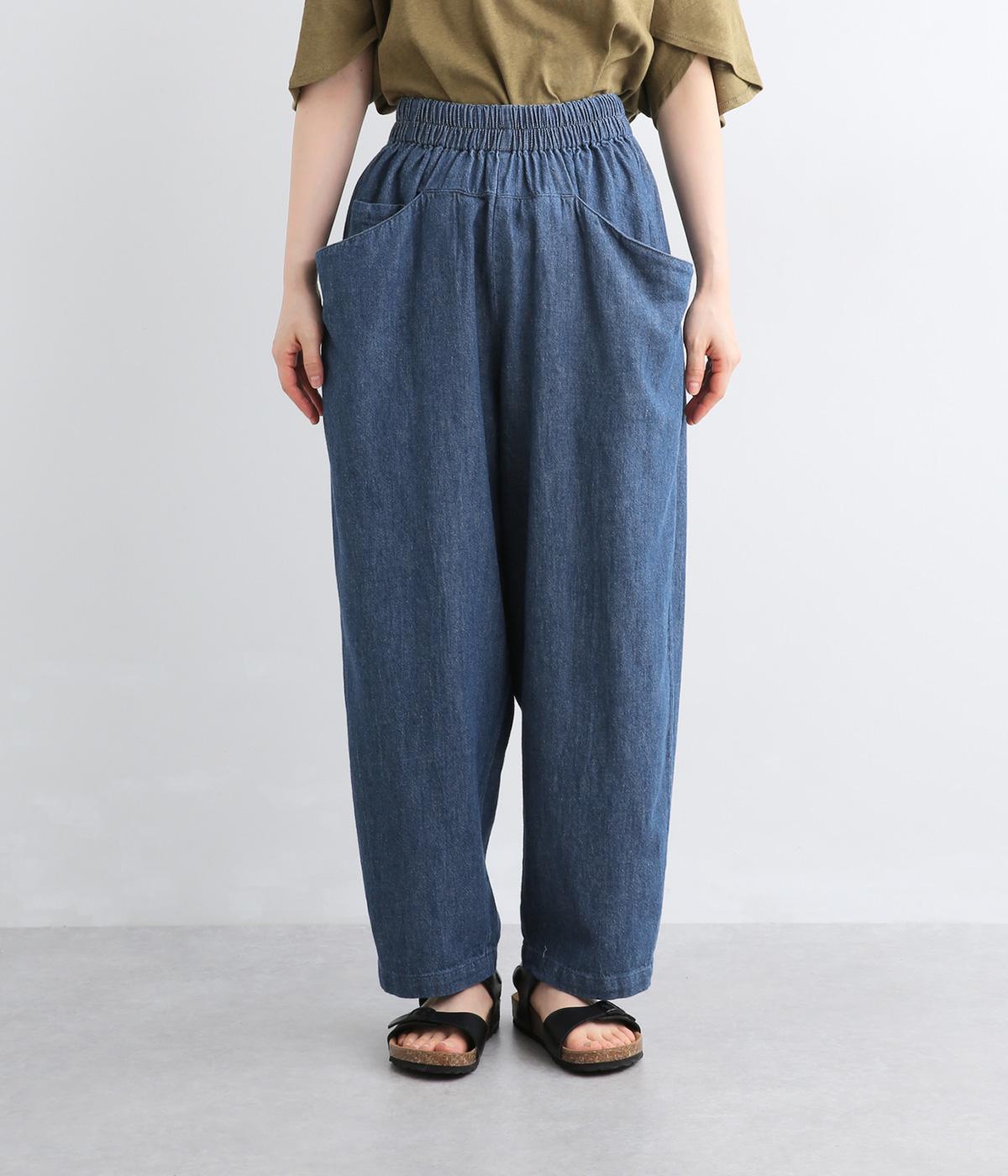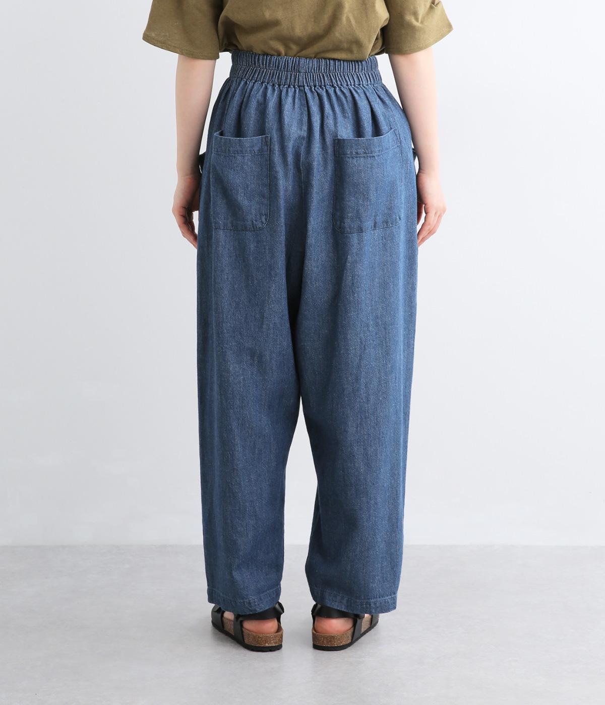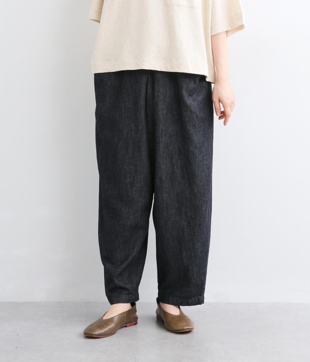 屋根をイメージしたルーフポケットにくったりした生地感が独特のこなれ感を運びます。腰まわりはゆったりと、裾に向かってほどよくしぼったテーパード型でルーズに見えないシルエットに。ウエストはフィット感のいい総平ゴムに内紐入りです。
