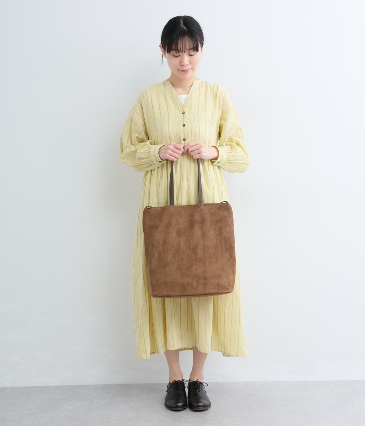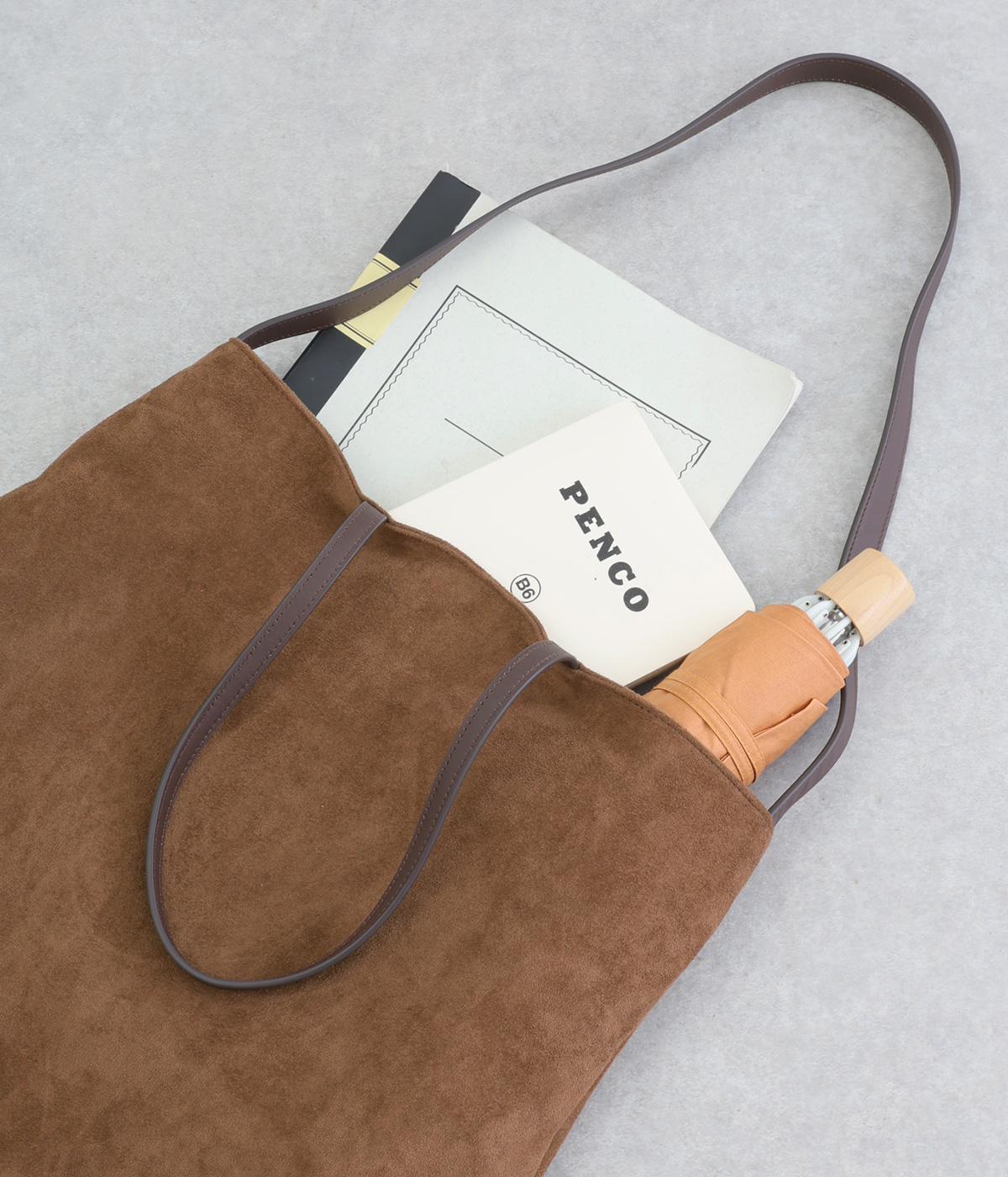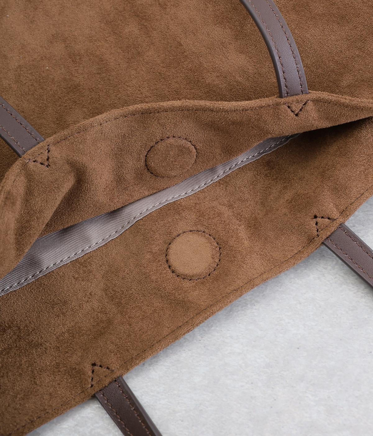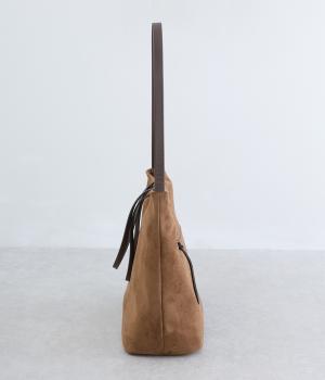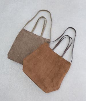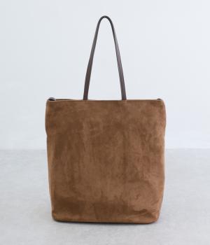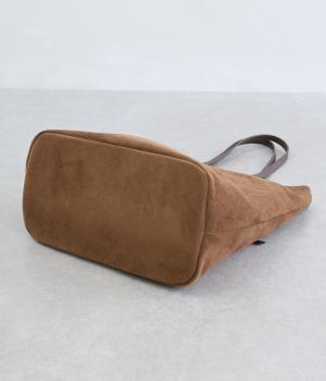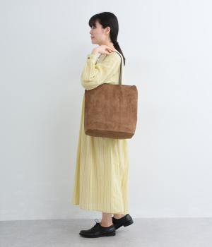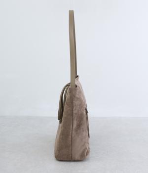 なめらかな手触りのポリスエード生地を使用した、温かみのある柔らかな風合い。本革に比べて軽量でお手入れもしやすく、日々の装いに気兼ねなく取り入れられます。ハンドルには本革を配し、耐久性と使い心地のよさにもこだわりました。
