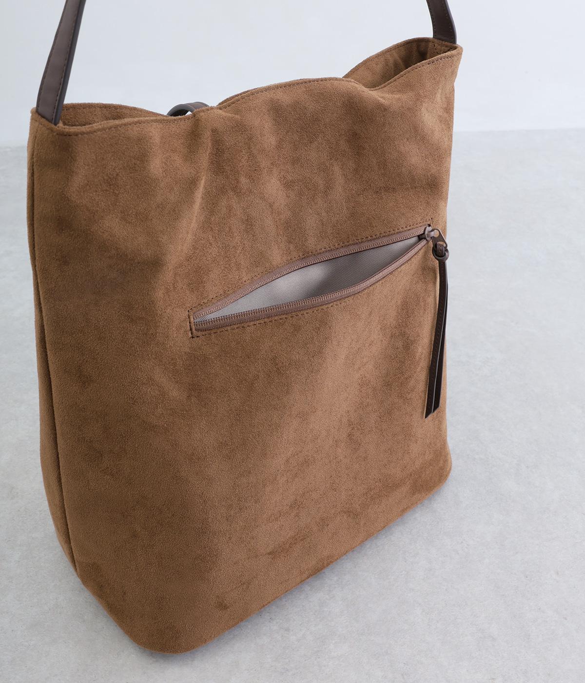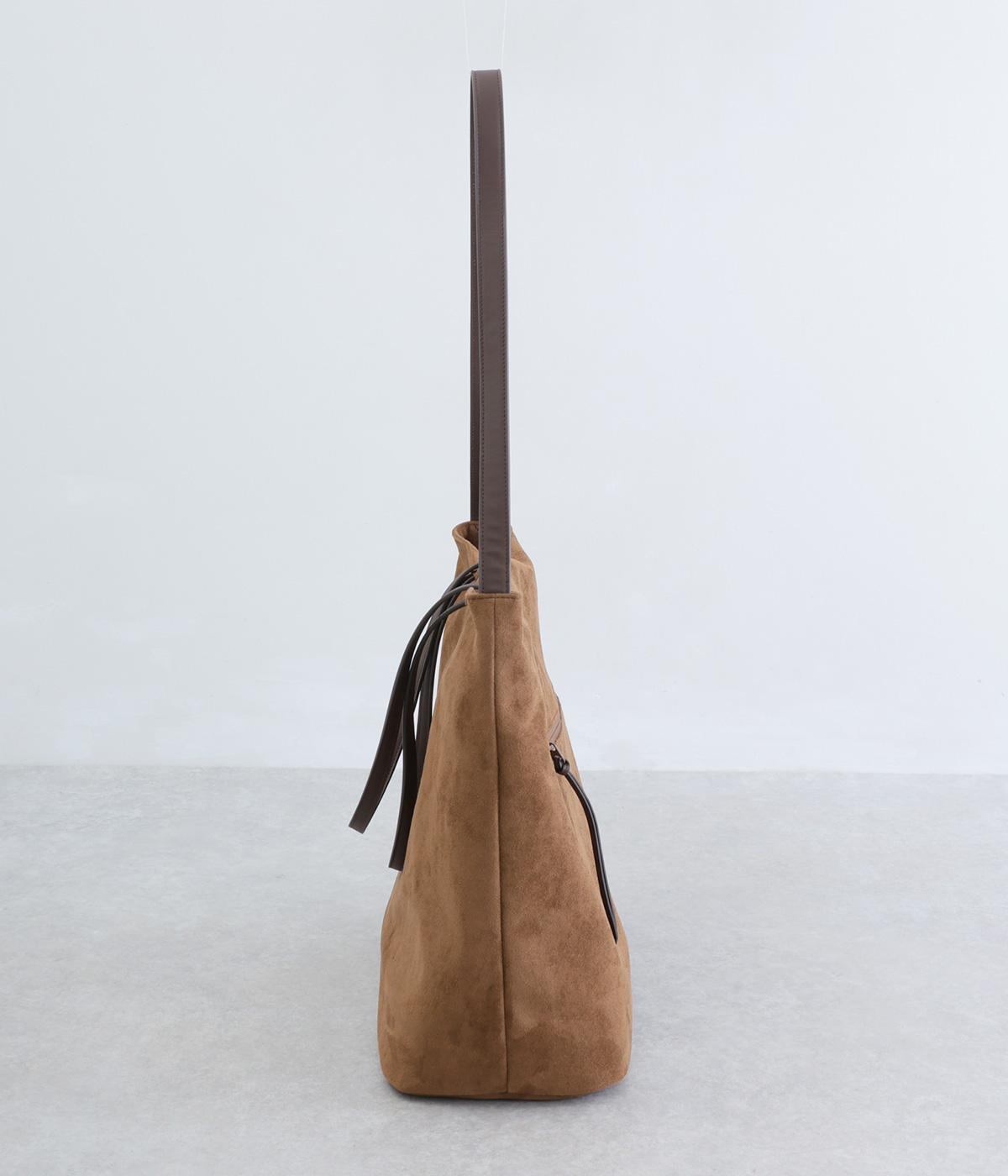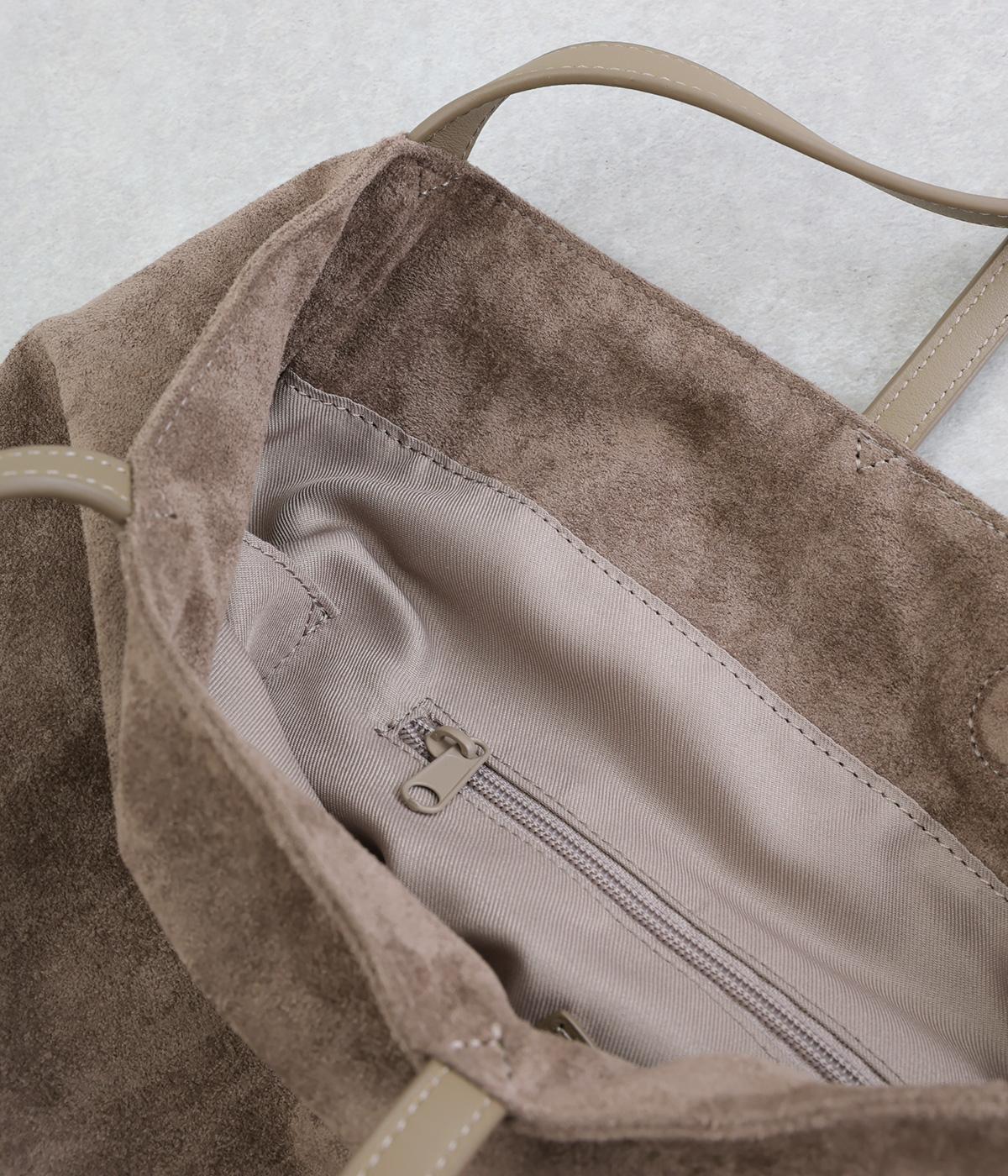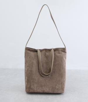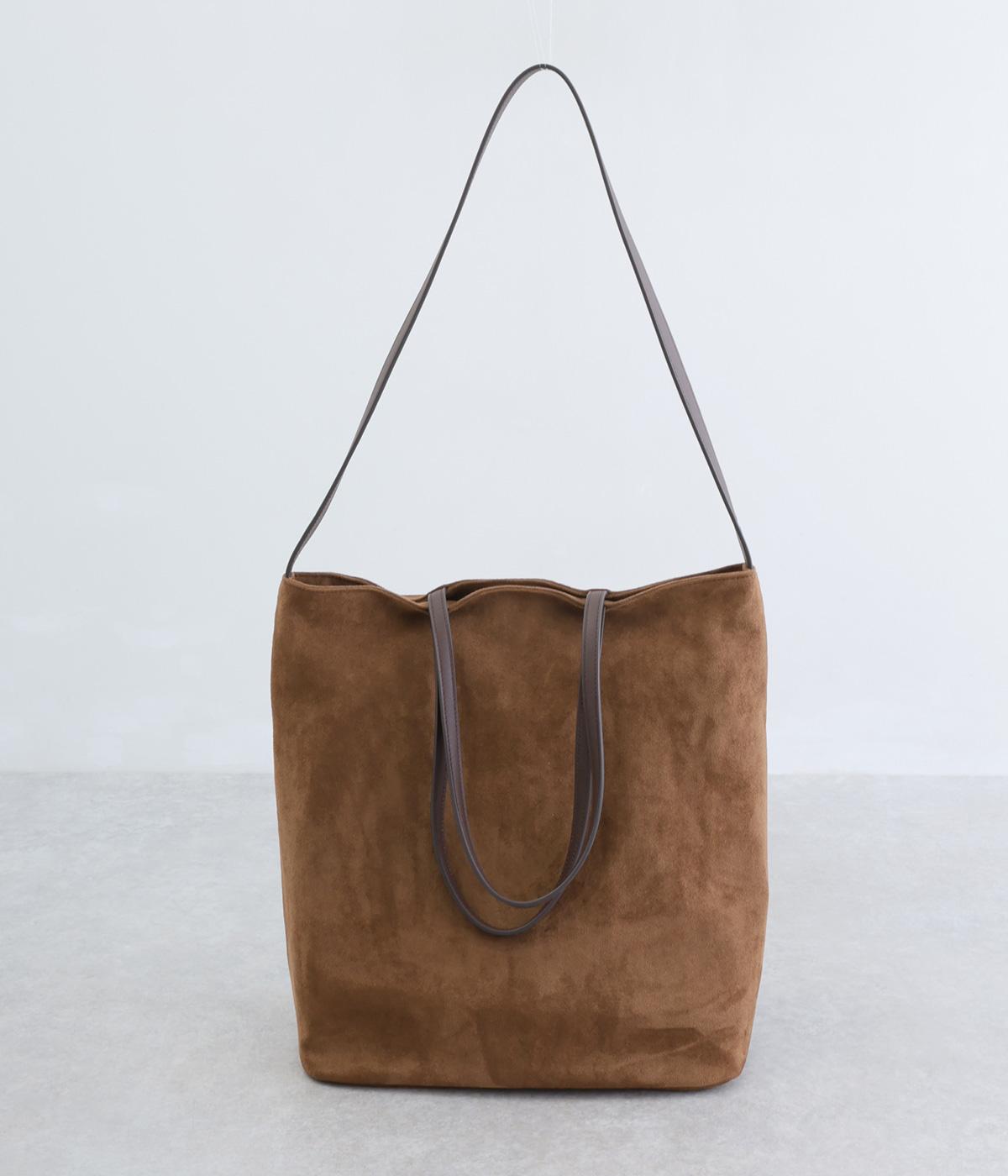 なめらかな手触りのポリスエード生地を使用した、温かみのある柔らかな風合い。本革に比べて軽量でお手入れもしやすく、日々の装いに気兼ねなく取り入れられます。ハンドルには本革を配し、耐久性と使い心地のよさにもこだわりました。