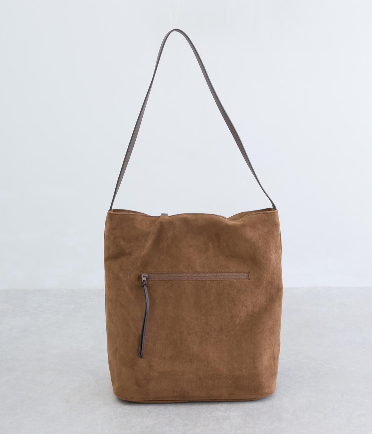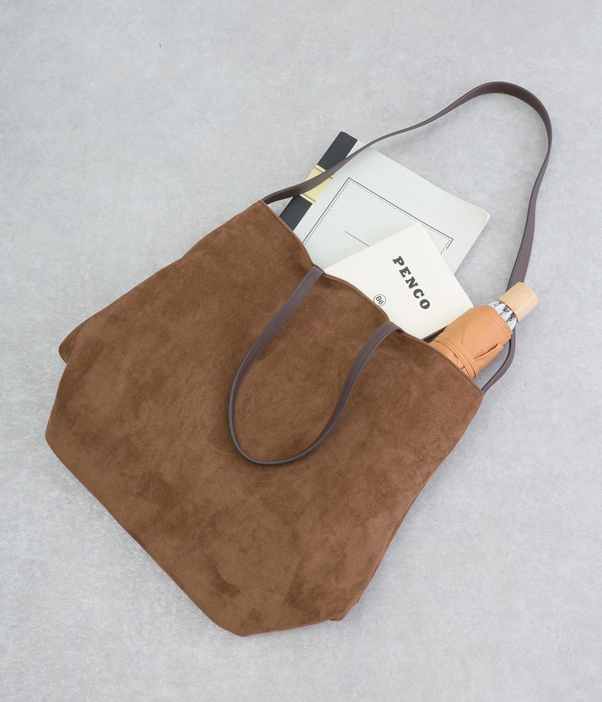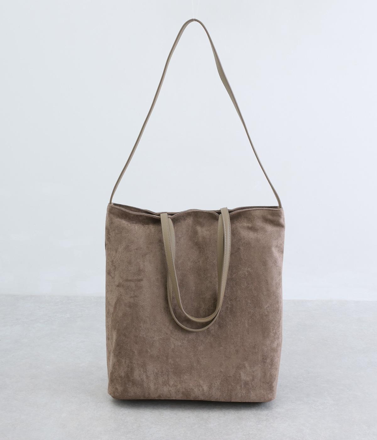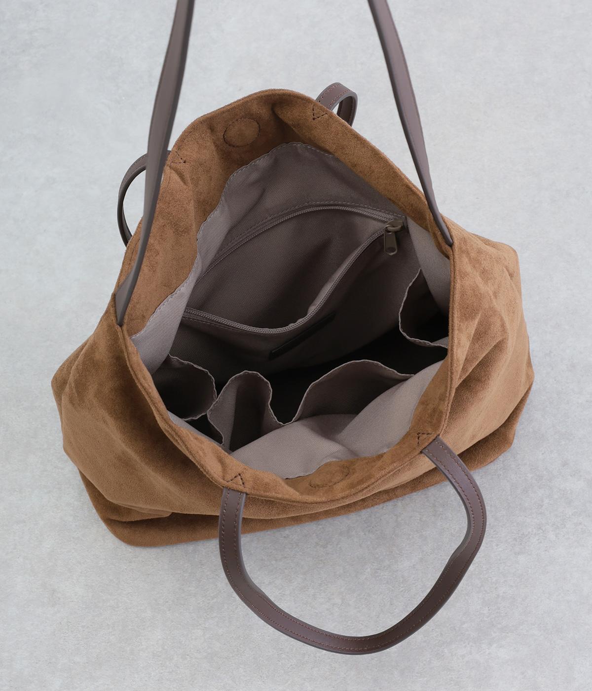 なめらかな手触りのポリスエード生地を使用した、温かみのある柔らかな風合い。本革に比べて軽量でお手入れもしやすく、日々の装いに気兼ねなく取り入れられます。ハンドルには本革を配し、耐久性と使い心地のよさにもこだわりました。