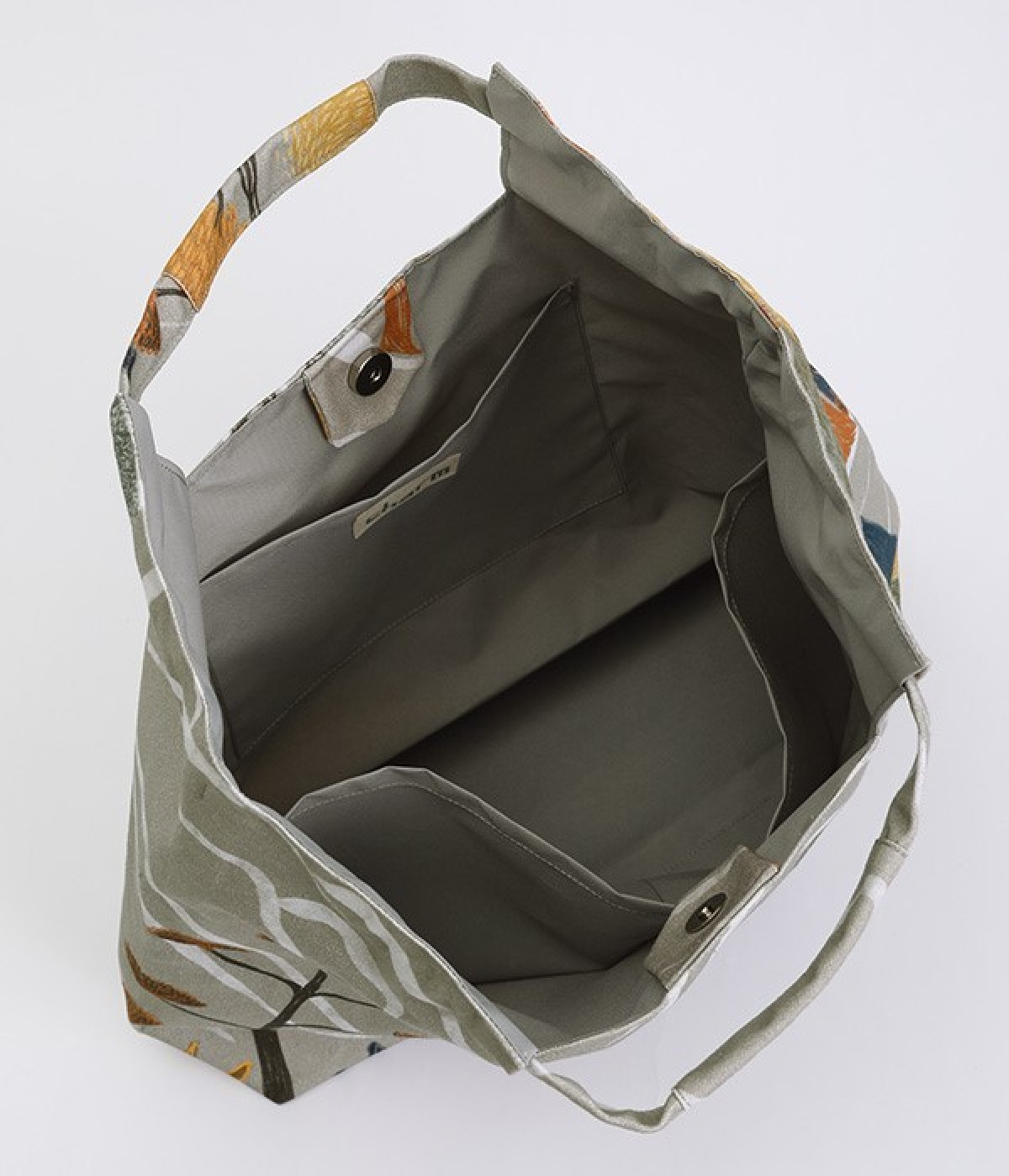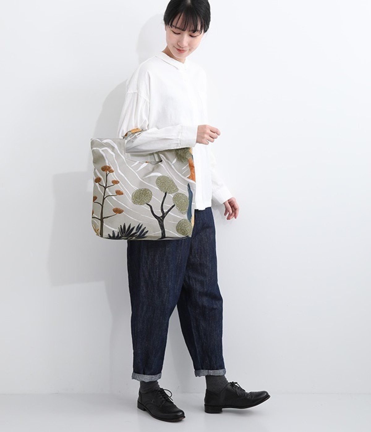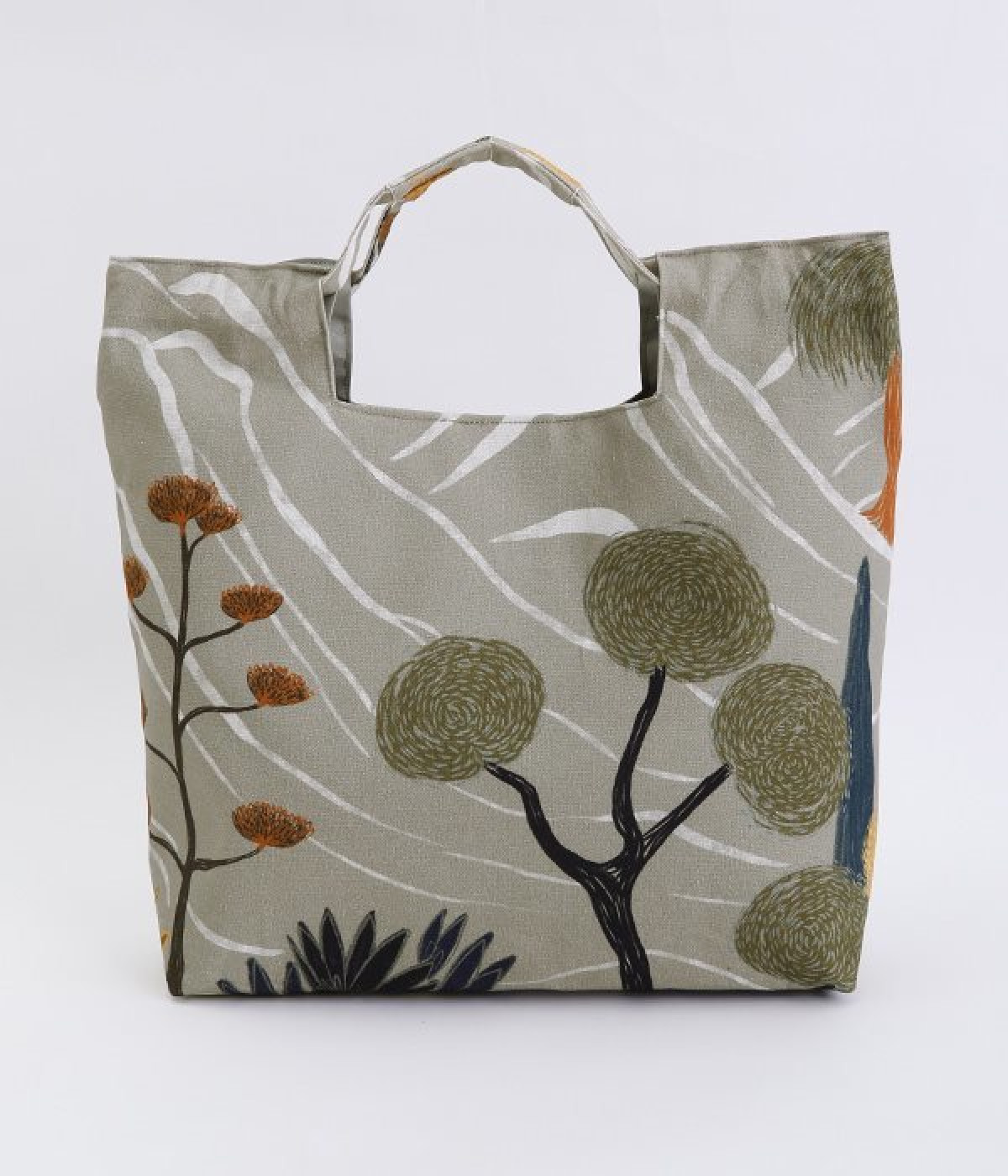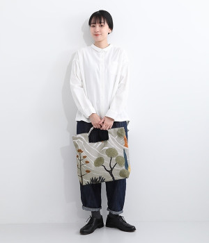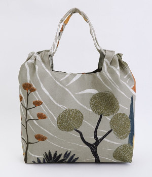 北欧風のタッチで描かれた自然の風景が素朴なバッグ。ハンドル部分を引っ張ると丸みのあるフォルムに変形するので、その日の気分に合わせたアレンジが楽しめます。内側には大きめポケットが3つ備わり、中身の飛び出しを防ぐマグネットボタンつきなど使い勝手も◎。裏地はポリエルテルで扱いやすく、手洗いもできるためデイリーづかいにぴったり。無難になりがちなデイリースタイルにプラスすると、グッと雰囲気を変えてくれます。