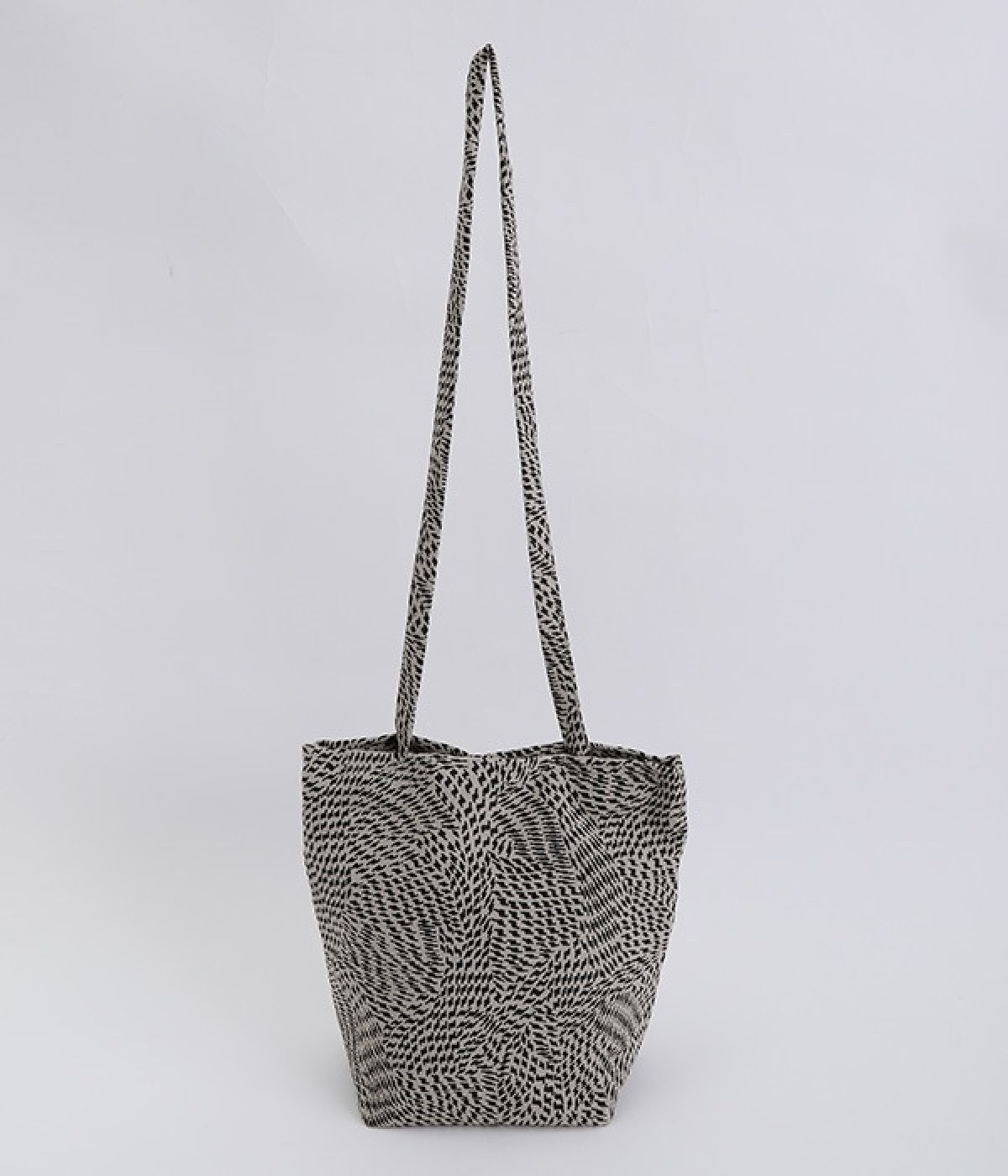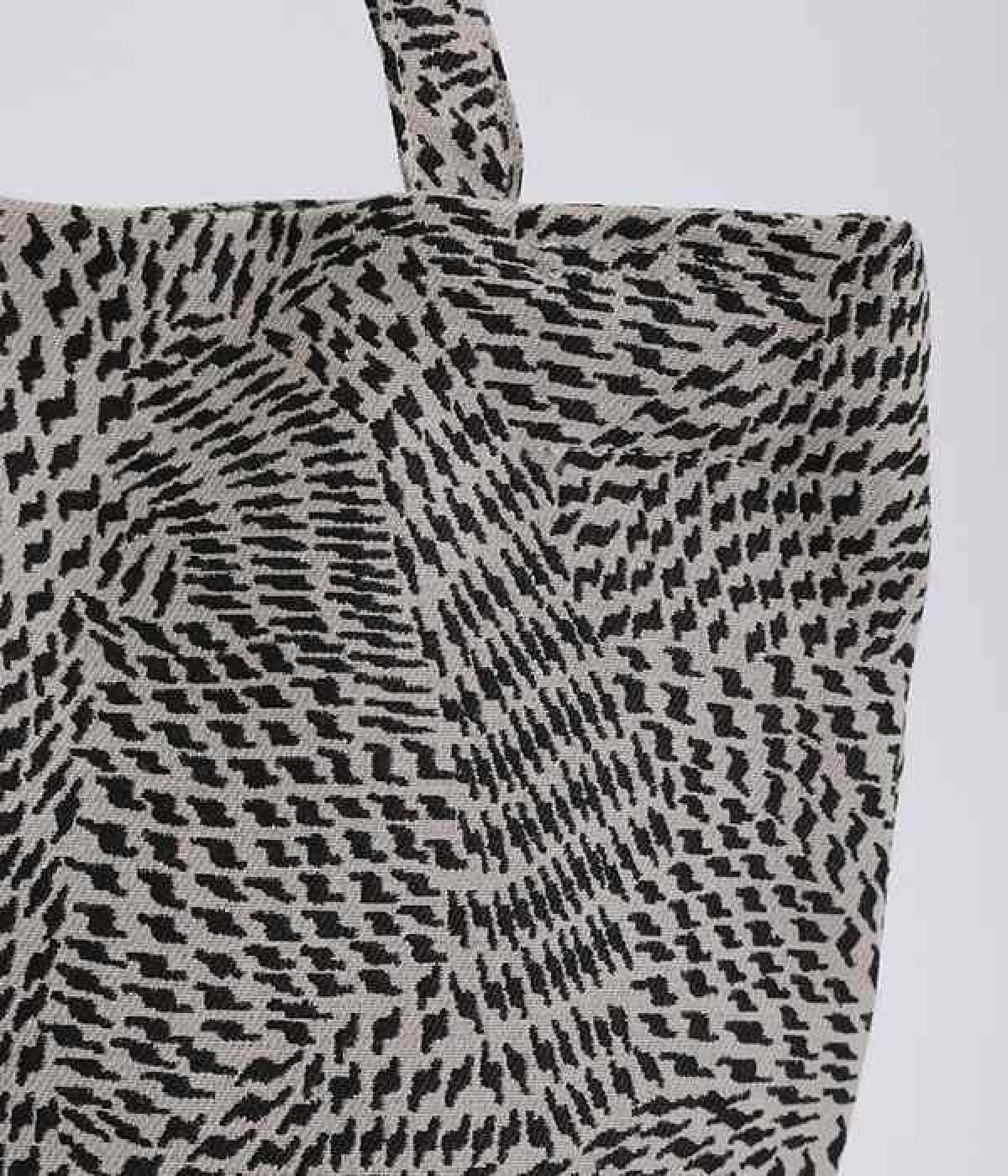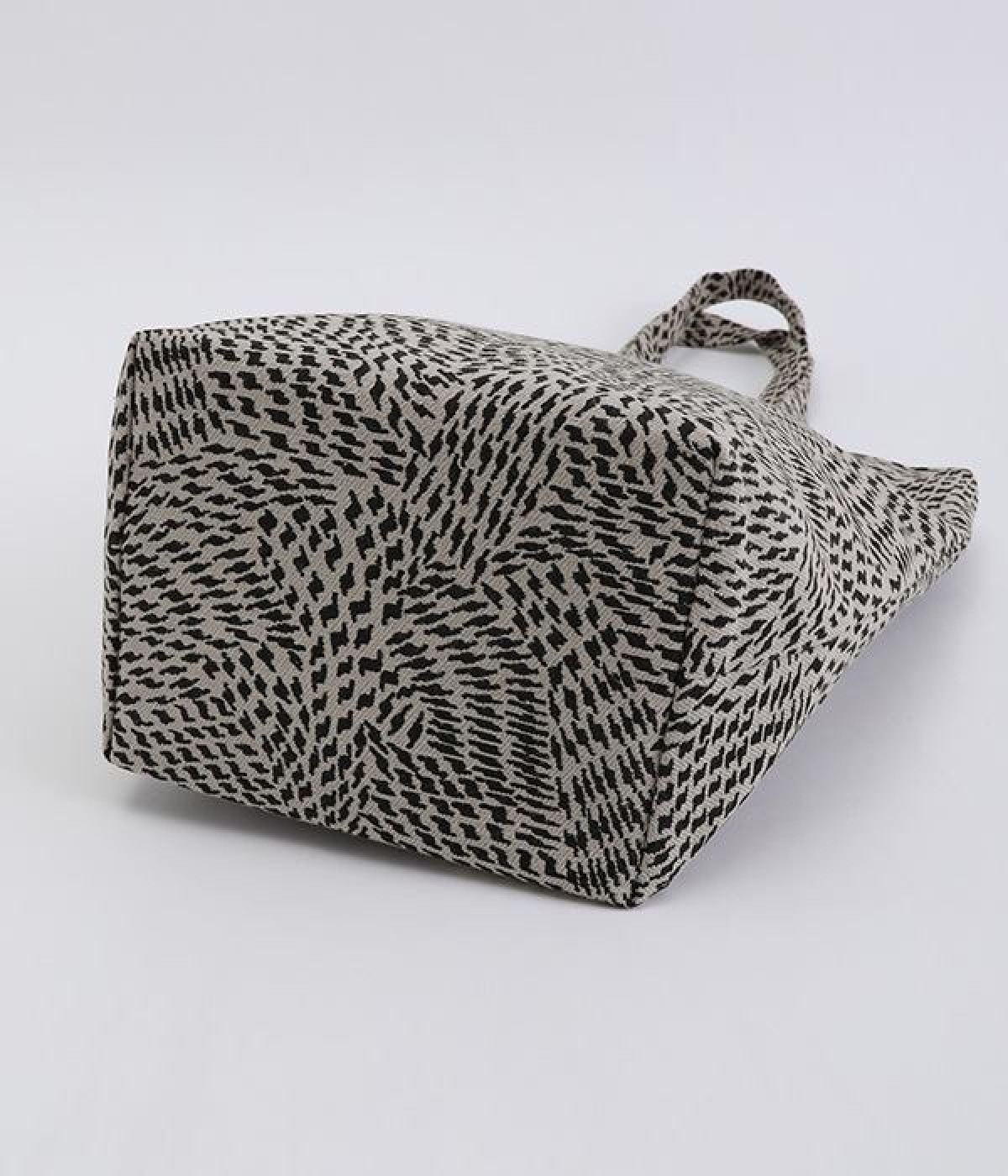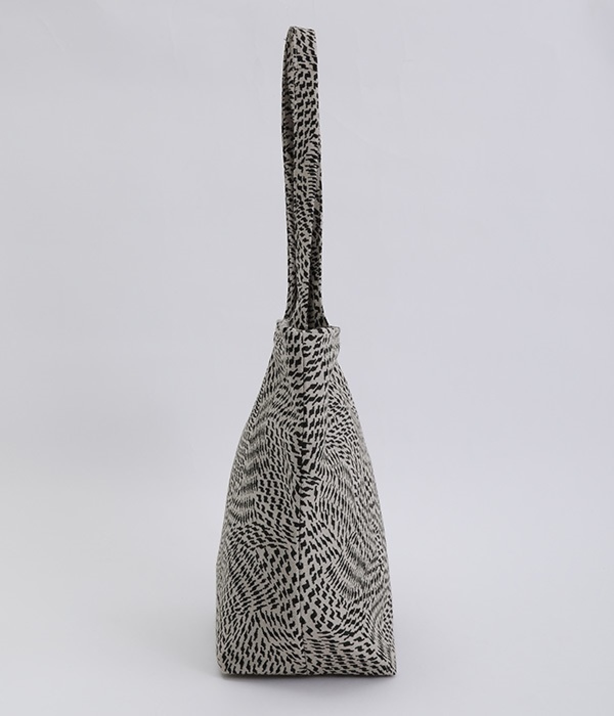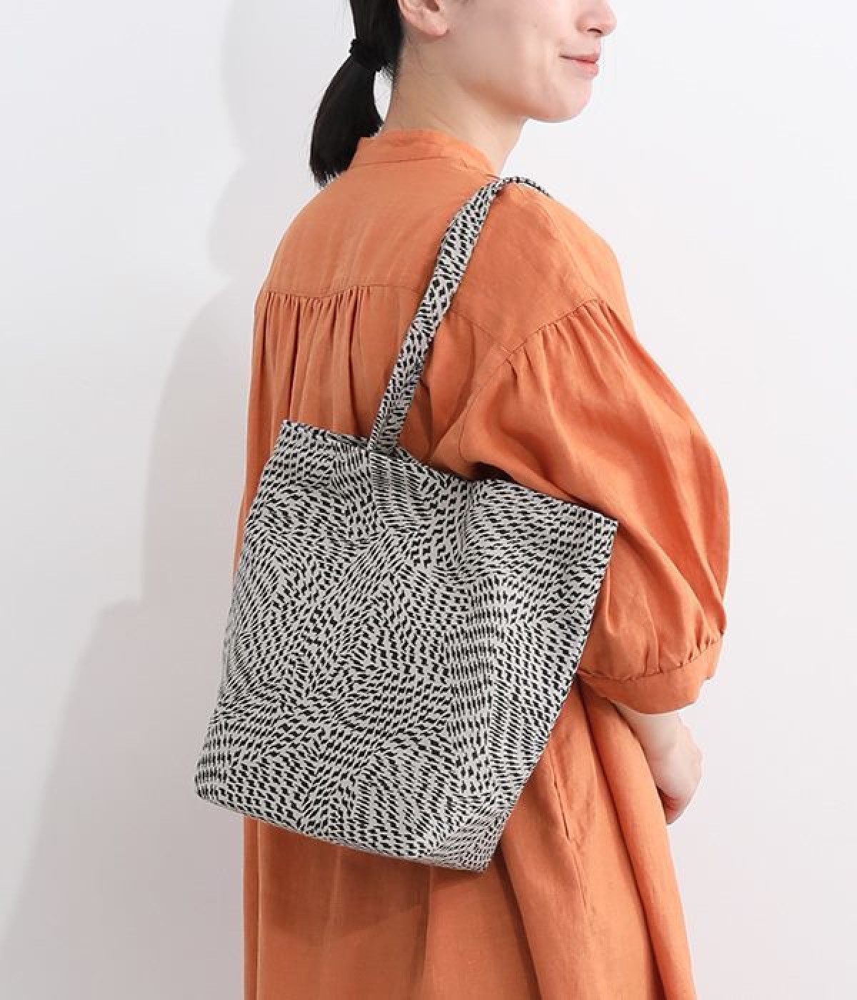 大きなうねりのある幾何学柄が特徴的なトートバッグです。国内で織られたブランドオリジナルのジャカード生地を使用しています。持ち手の取り出し方により、手持ち・肩掛け・クロスボディと三通りで持てるデザイン。安定感のある底マチが収納力を確保し、お出かけの必需品がすっきりと収まります。二つの内ポケットのうちのひとつにはファスナー開きを設け、貴重品の持ち歩きも安心です。