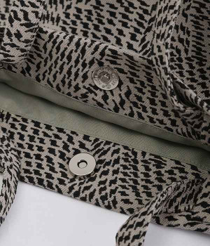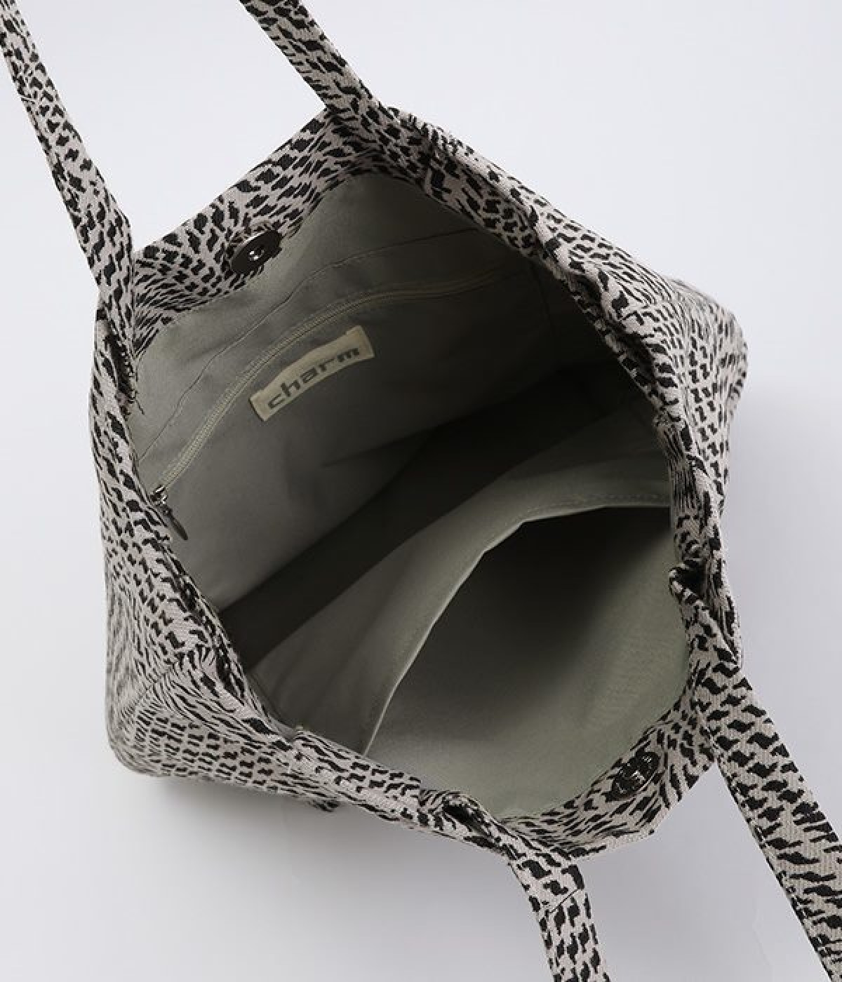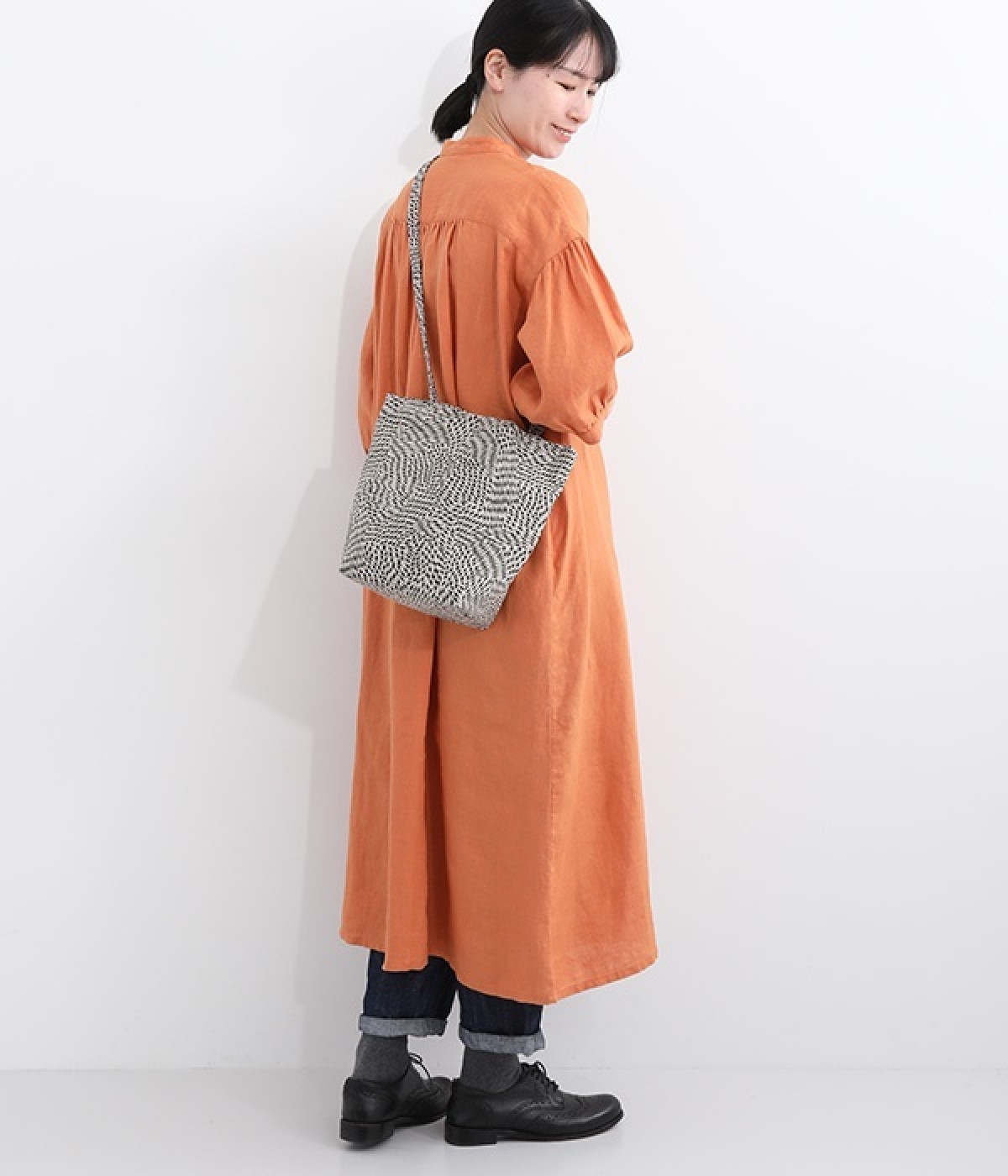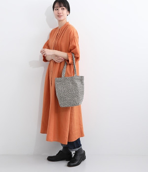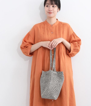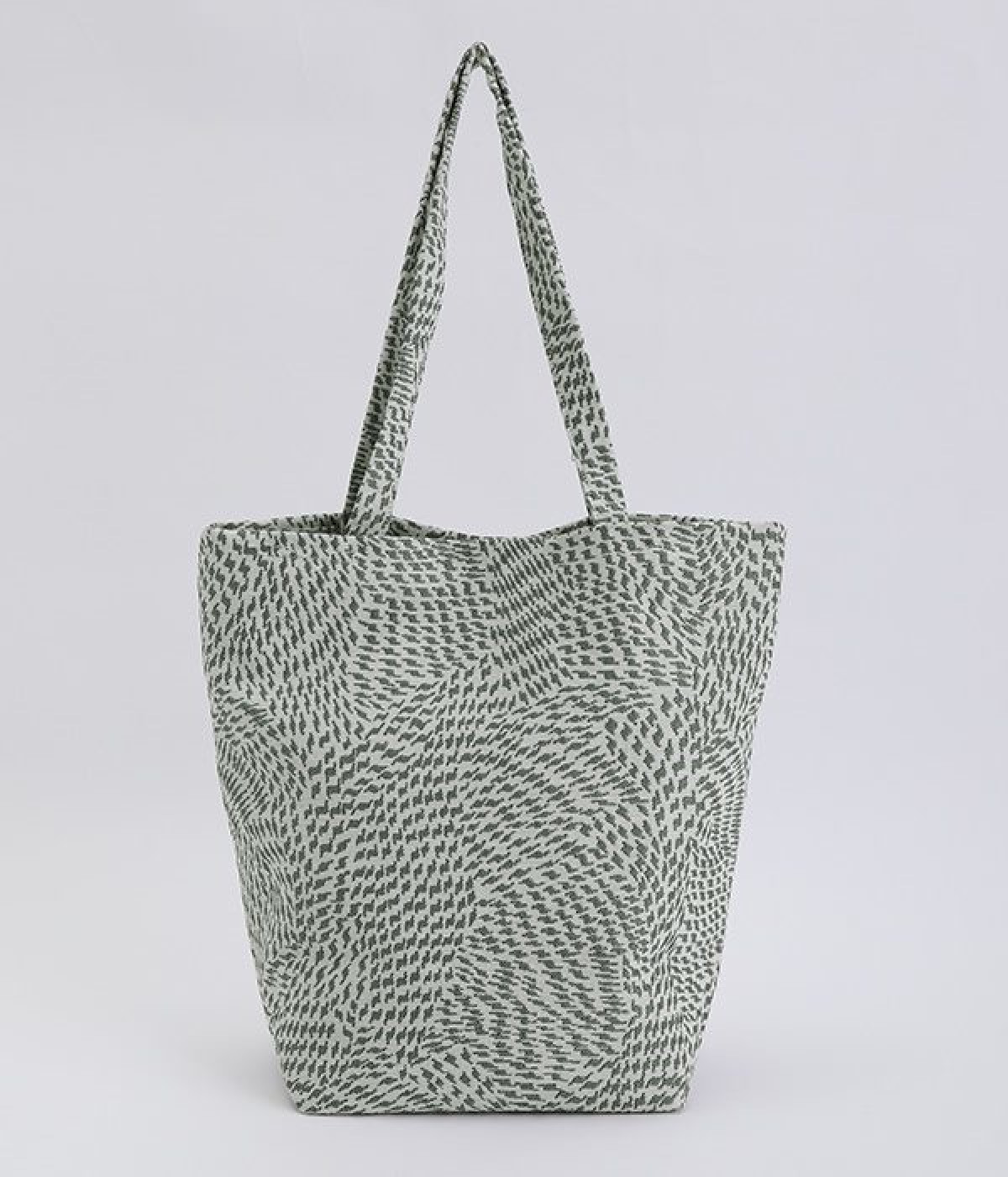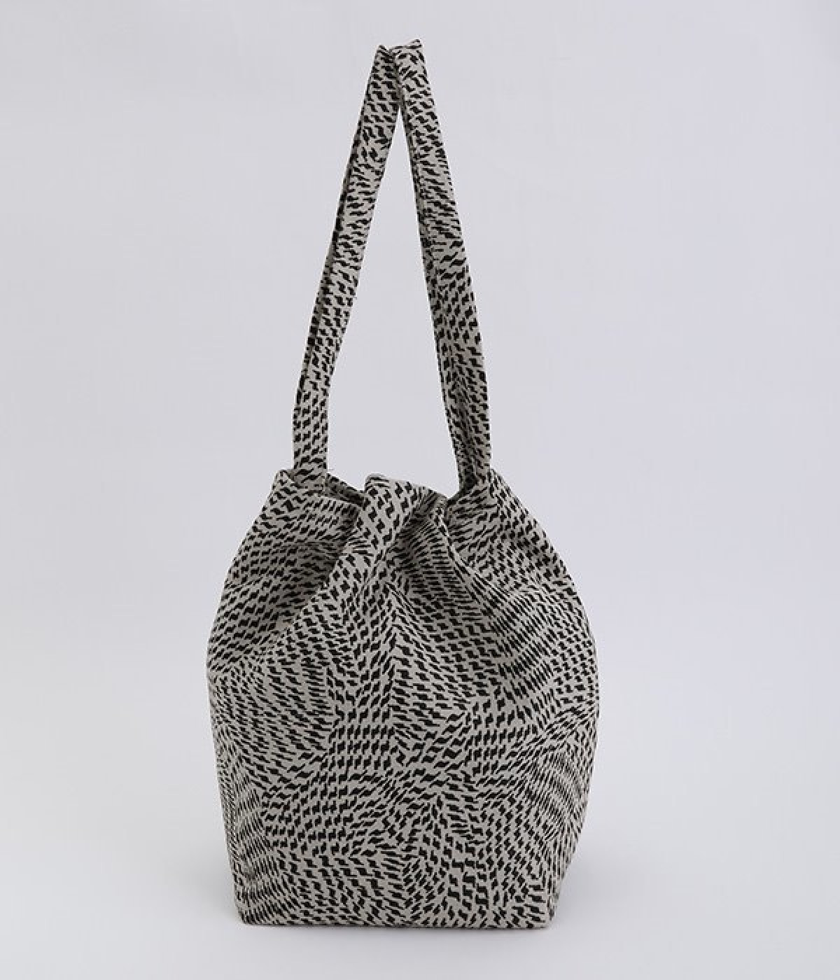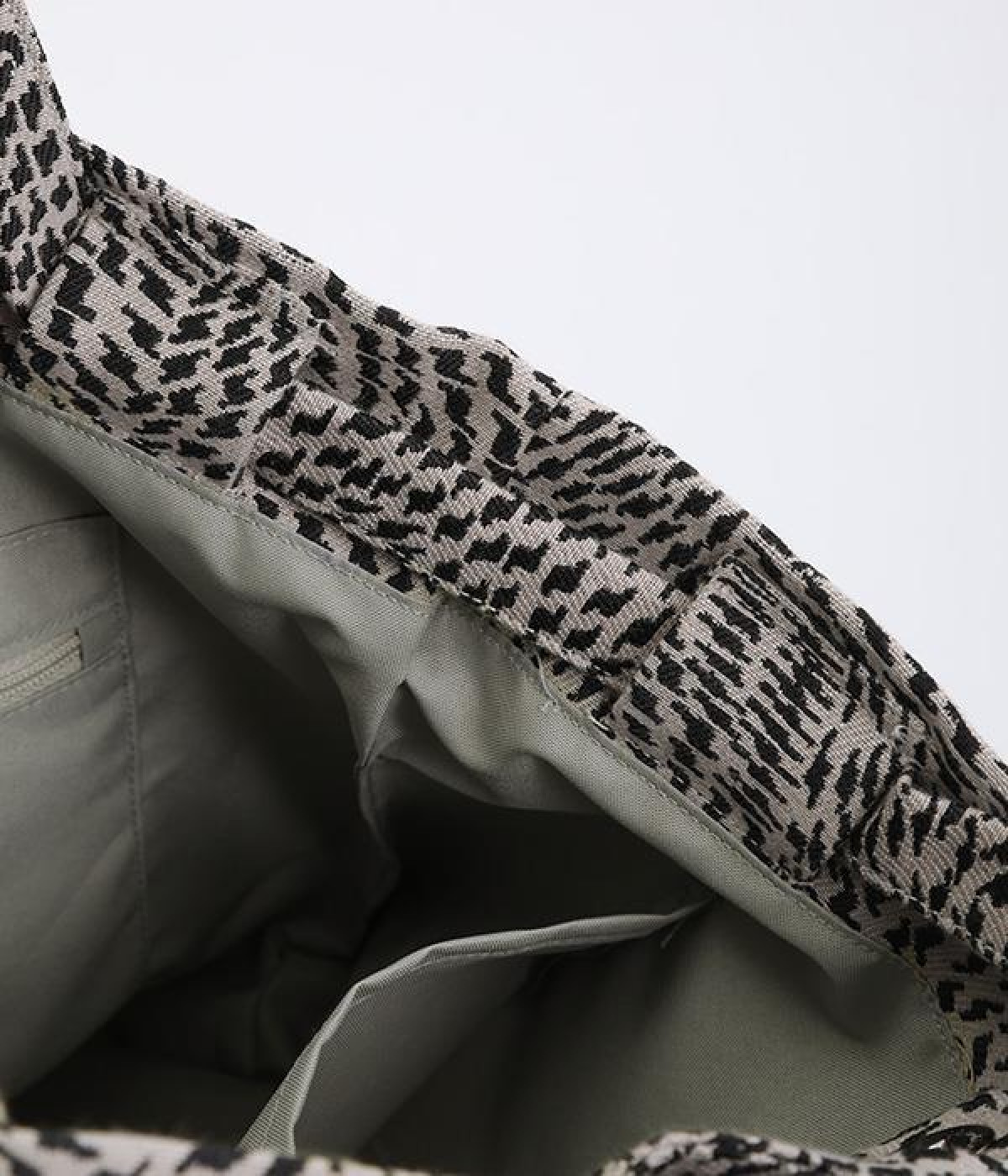 大きなうねりのある幾何学柄が特徴的なトートバッグです。国内で織られたブランドオリジナルのジャカード生地を使用しています。持ち手の取り出し方により、手持ち・肩掛け・クロスボディと三通りで持てるデザイン。安定感のある底マチが収納力を確保し、お出かけの必需品がすっきりと収まります。二つの内ポケットのうちのひとつにはファスナー開きを設け、貴重品の持ち歩きも安心です。