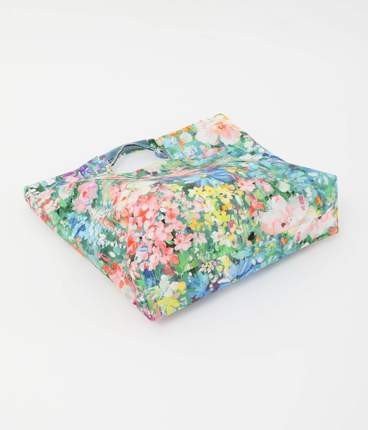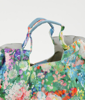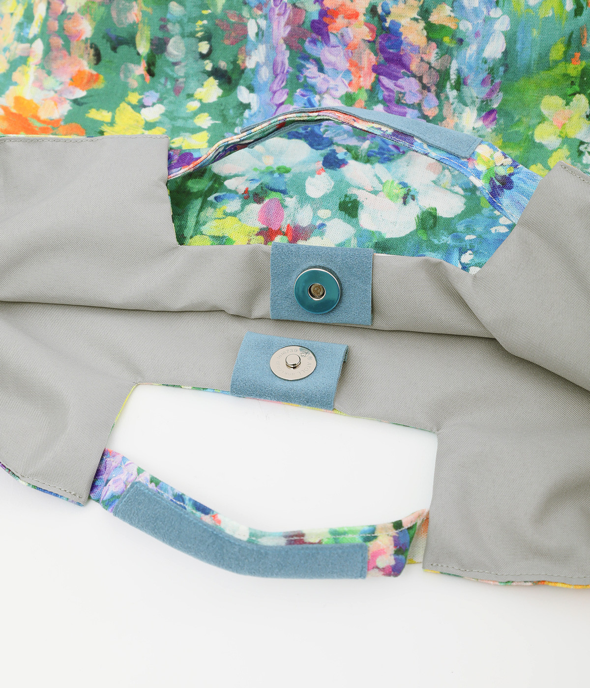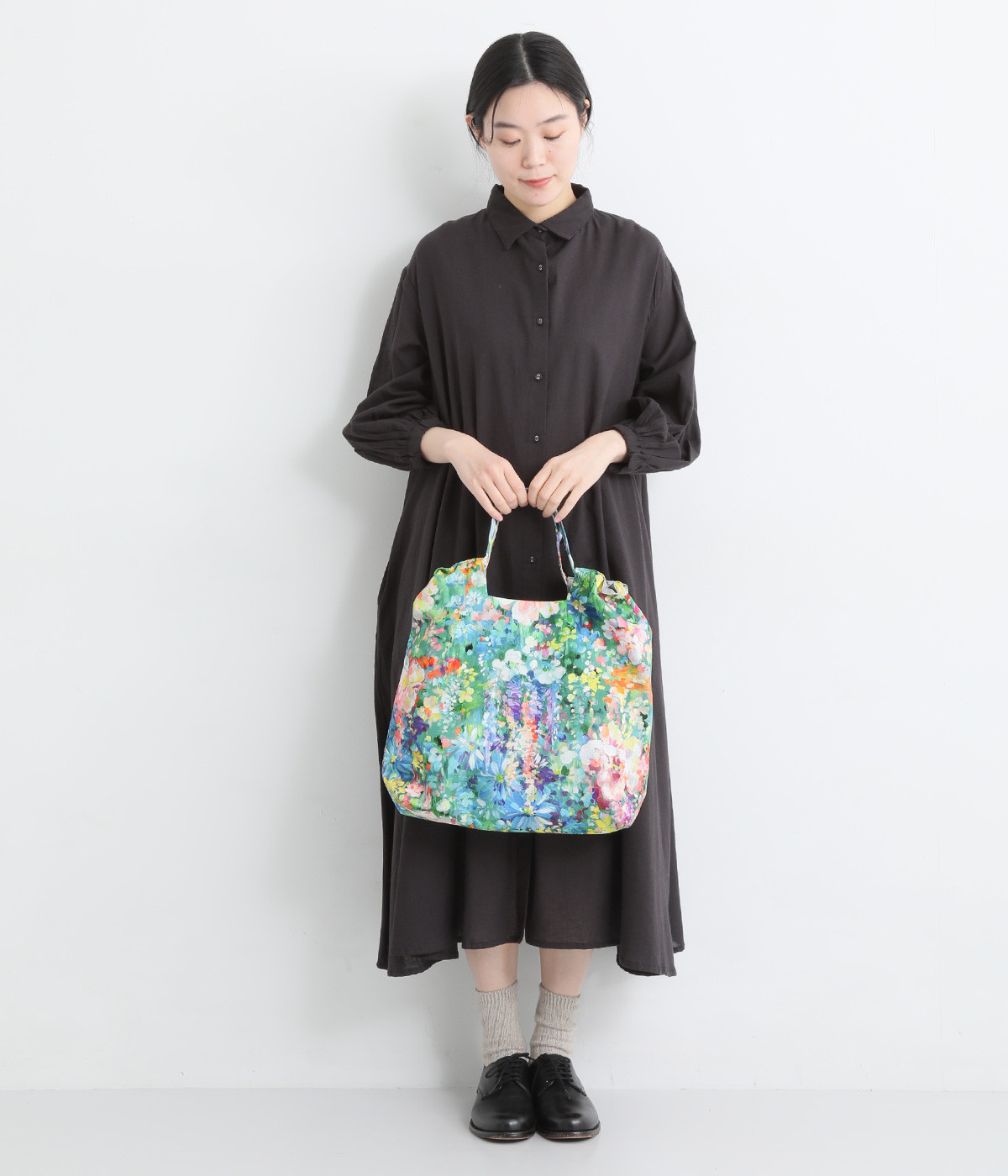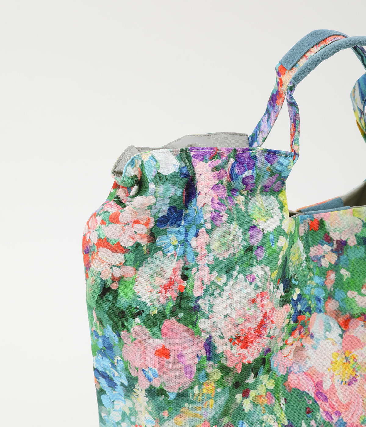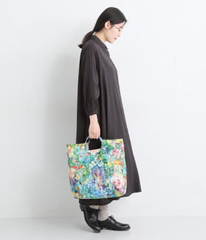 フランスの小さな村ジヴェルニーをモチーフにした油絵のような柄が特徴的なフランスのプリント生地を用い用いました。コットン素材で気兼ねなく合わせられ、軽量なのもポイント高め。A4が入るサイズも◎。