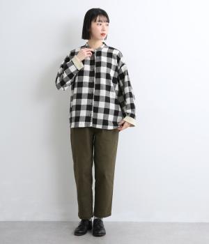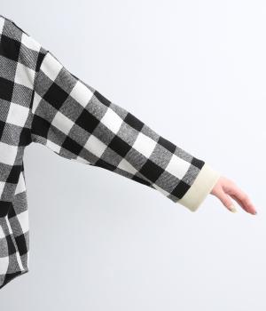 インパクトのあるブロックチェックをバンドカラーと袖口のリブでバランスよくまとめました。丸みのあるラインを描く裾もさりげなく女性らしさをプラスしています。ゆったりとリラックス感のある着心地です。