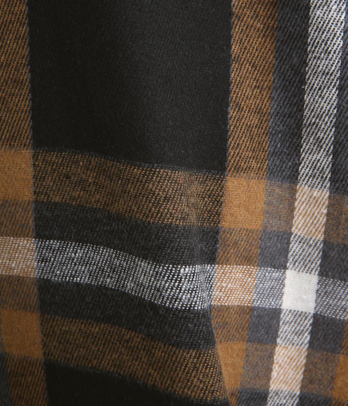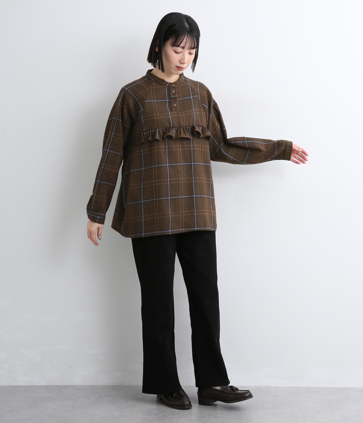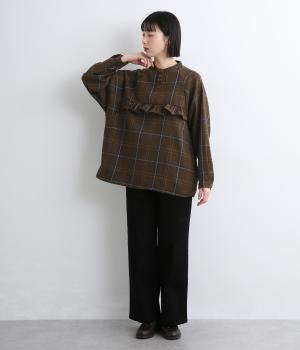 着映えする大きなチェック柄にフリルをあしらいました。カジュアルな雰囲気にほのかに女性らしさをプラスして、スタリングの幅が広がる一枚です。首元はすっきりさせてバランスよく仕上げました。