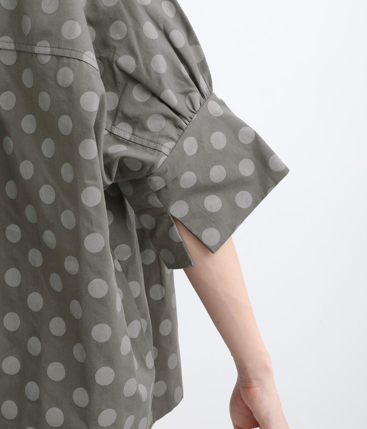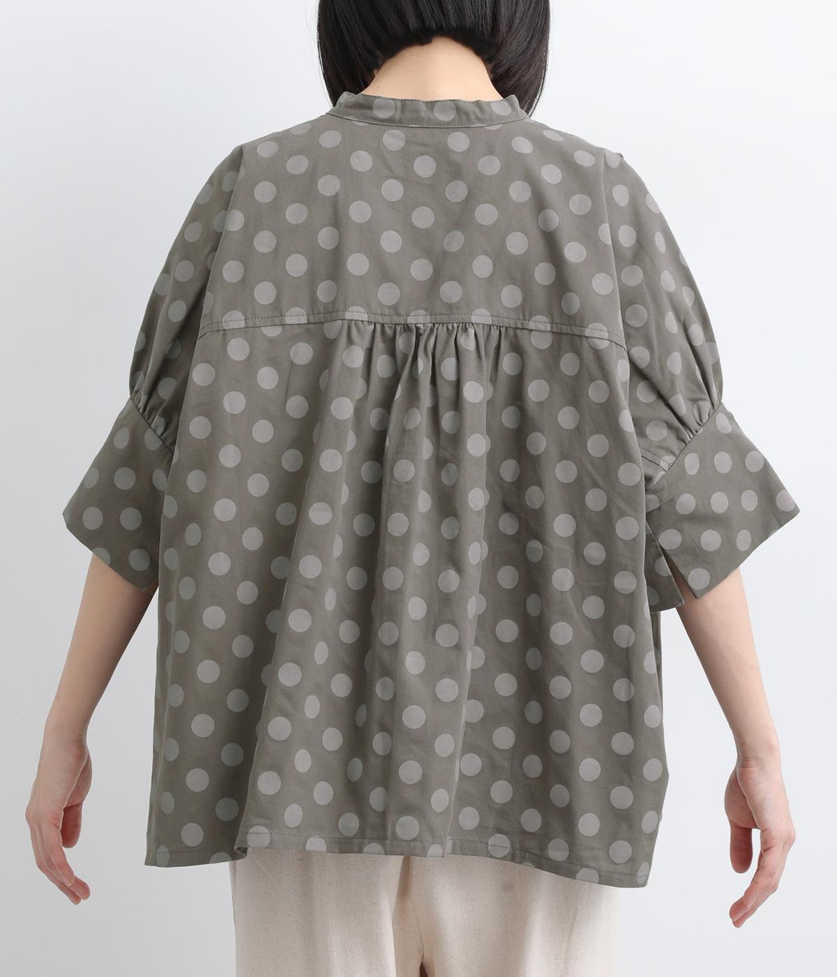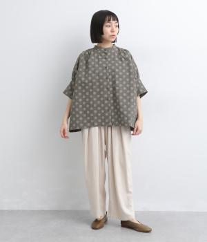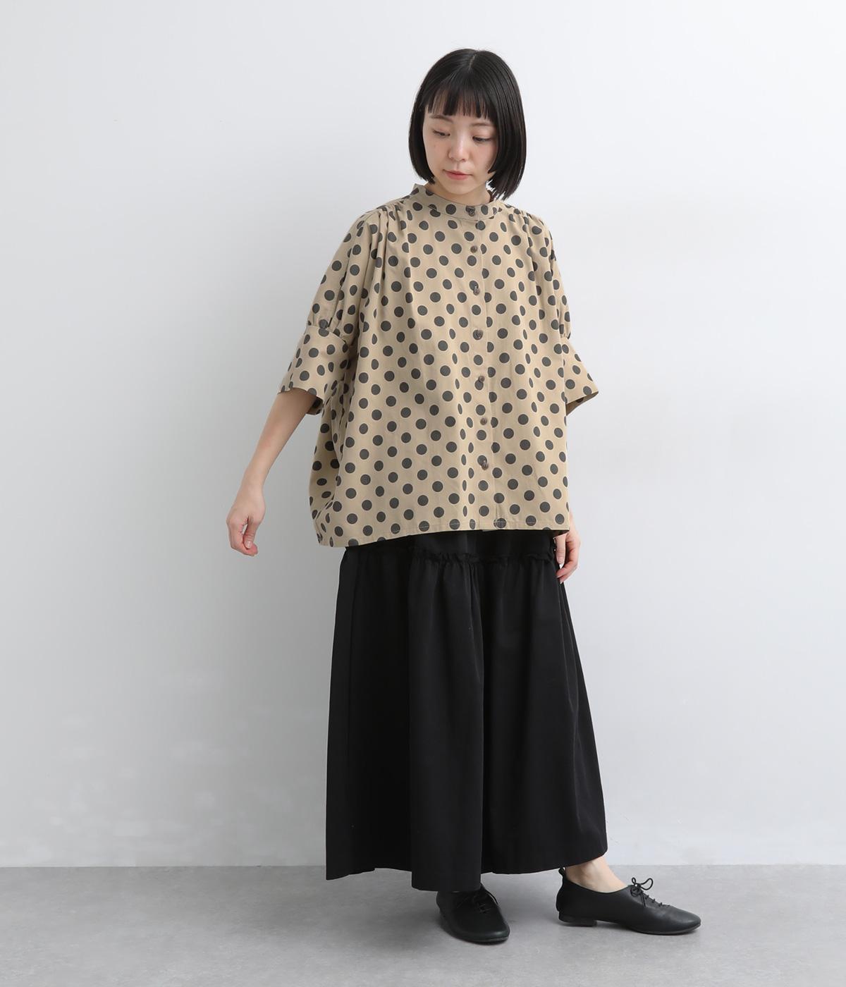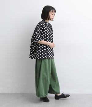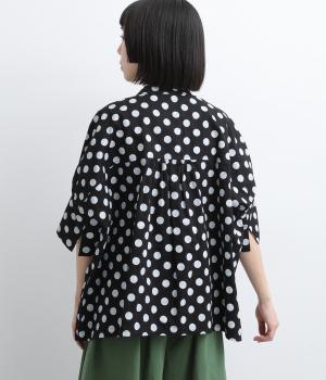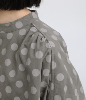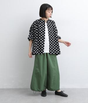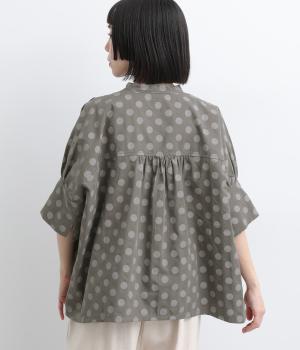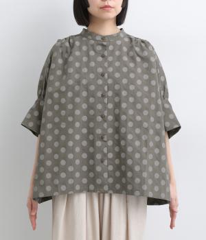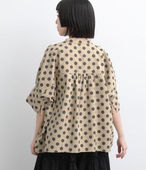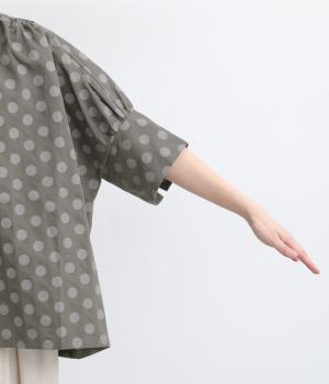 ワイドな身幅にヨークギャザー、ハリのある素材が着映えするブラウス。大きめのドット柄は可愛らしくもモードな雰囲気を運びます。ドルマン袖はスリットが入っているので、ひじも曲げやすく着心地快適です。