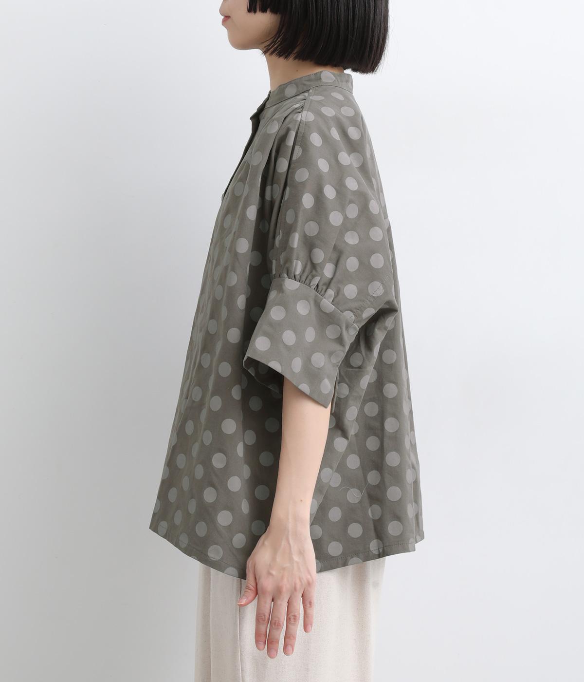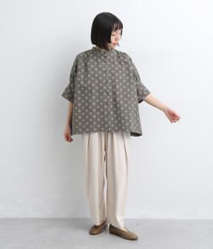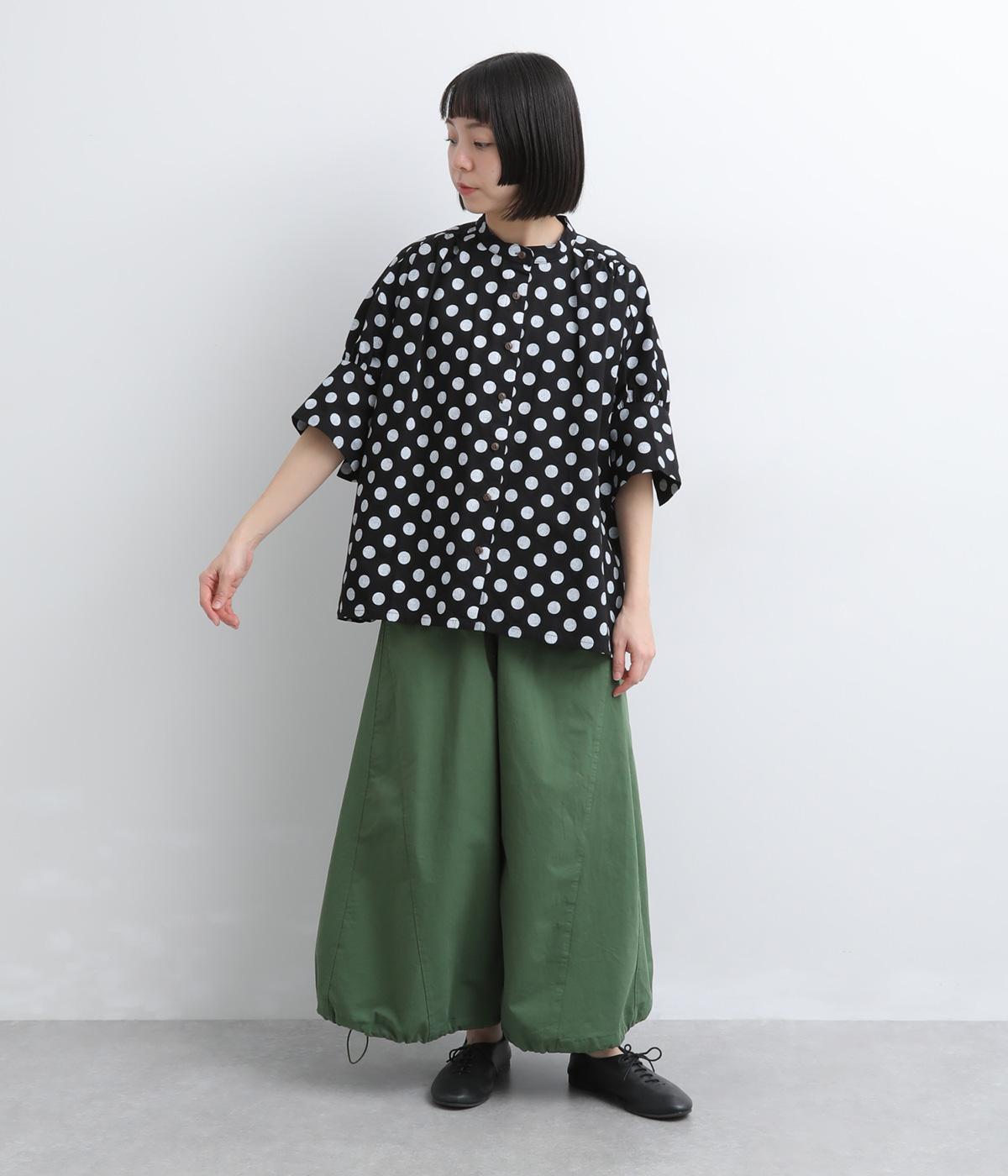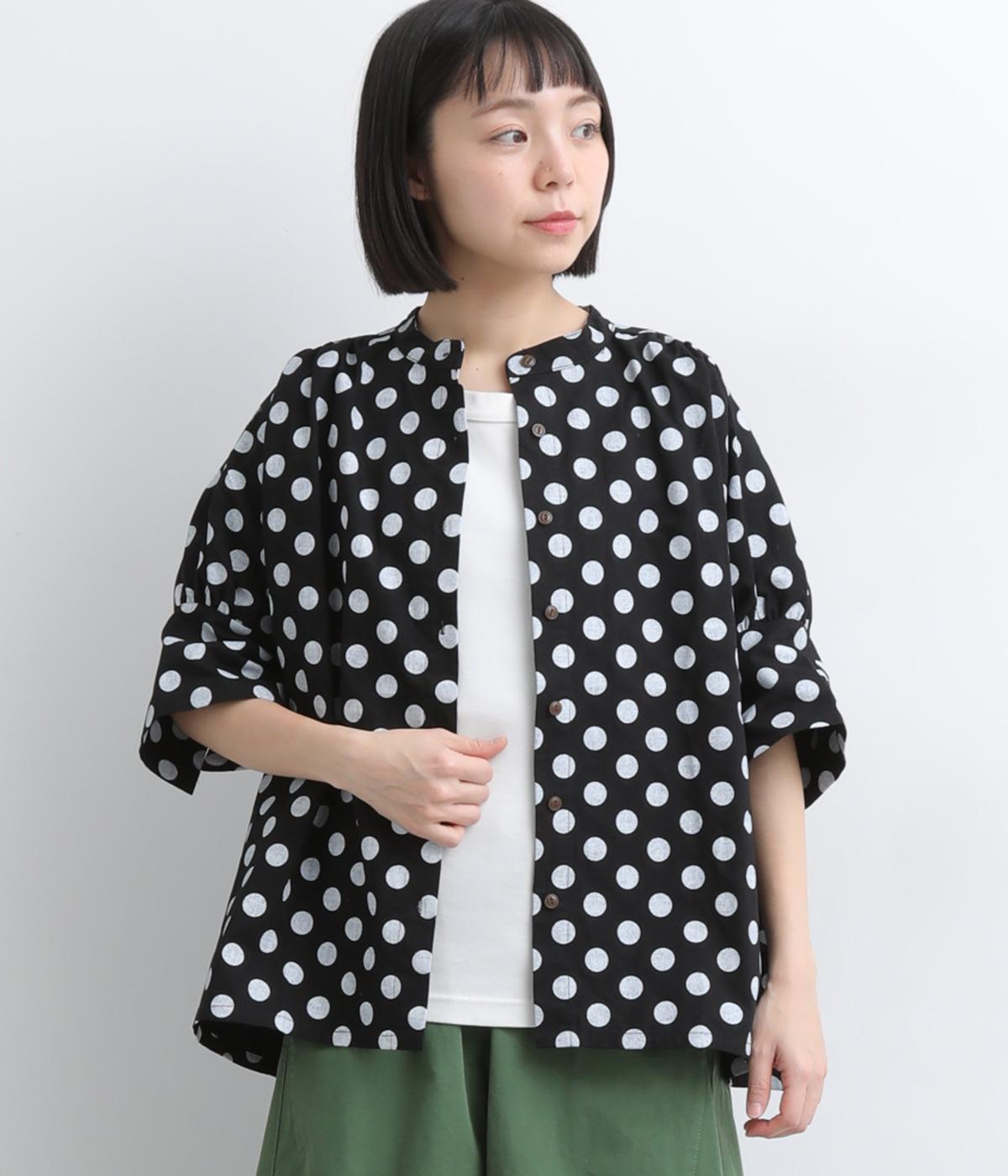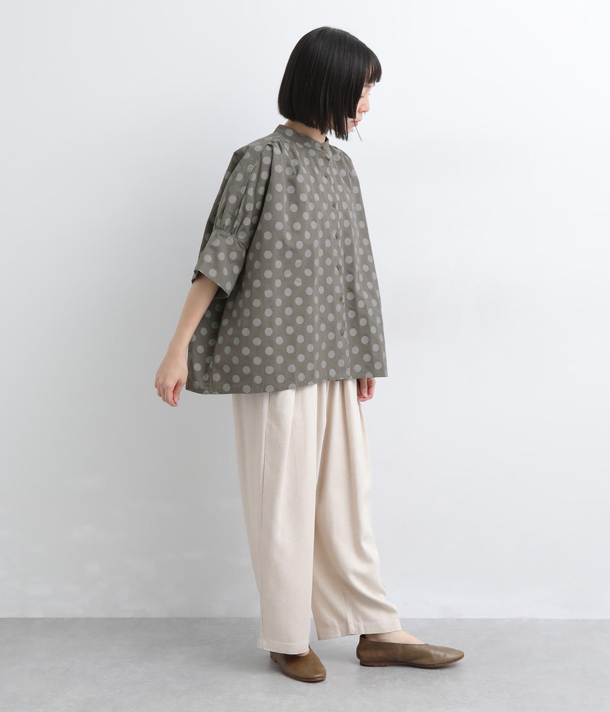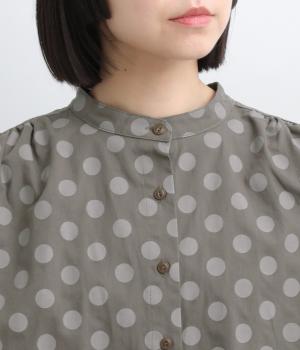 ワイドな身幅にヨークギャザー、ハリのある素材が着映えするブラウス。大きめのドット柄は可愛らしくもモードな雰囲気を運びます。ドルマン袖はスリットが入っているので、ひじも曲げやすく着心地快適です。
