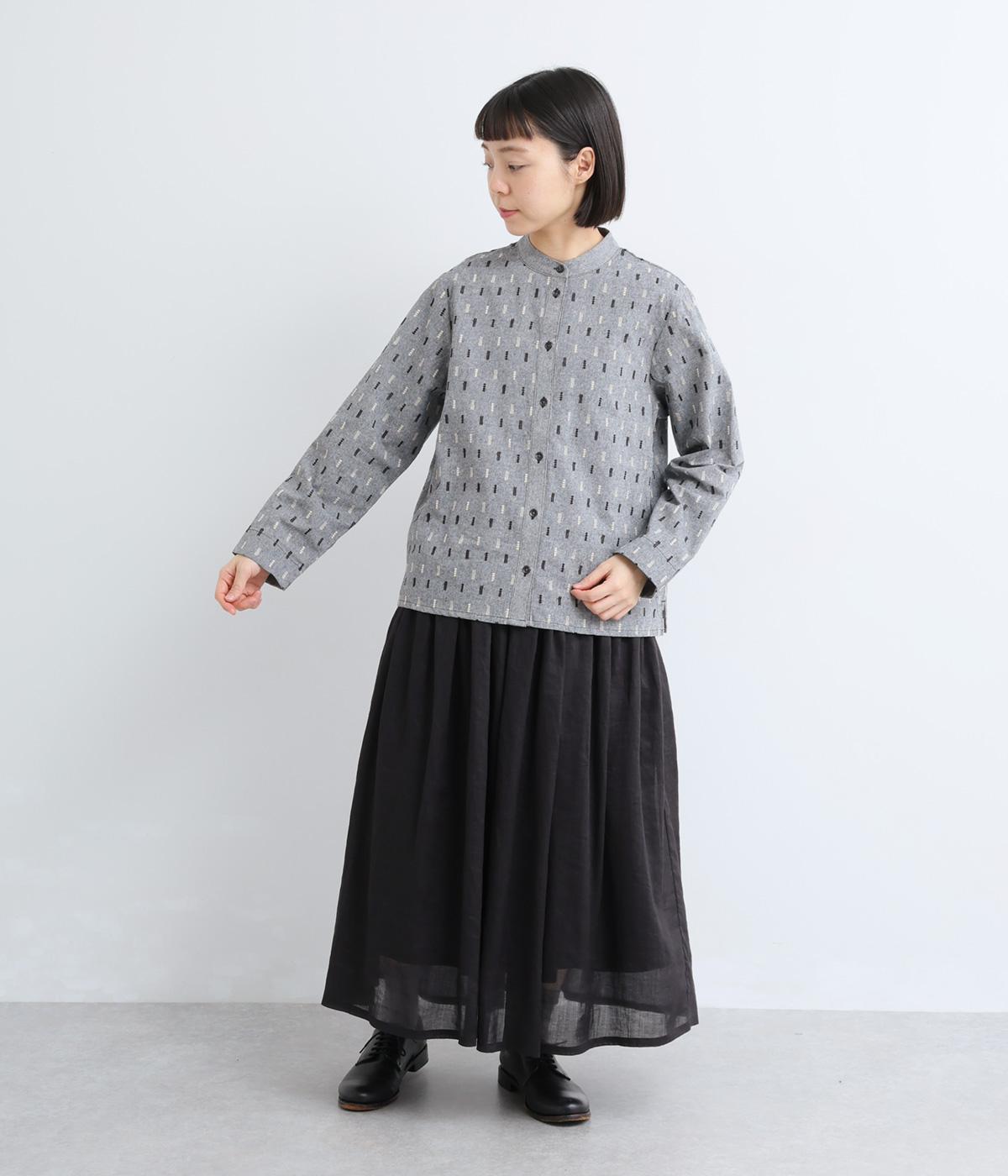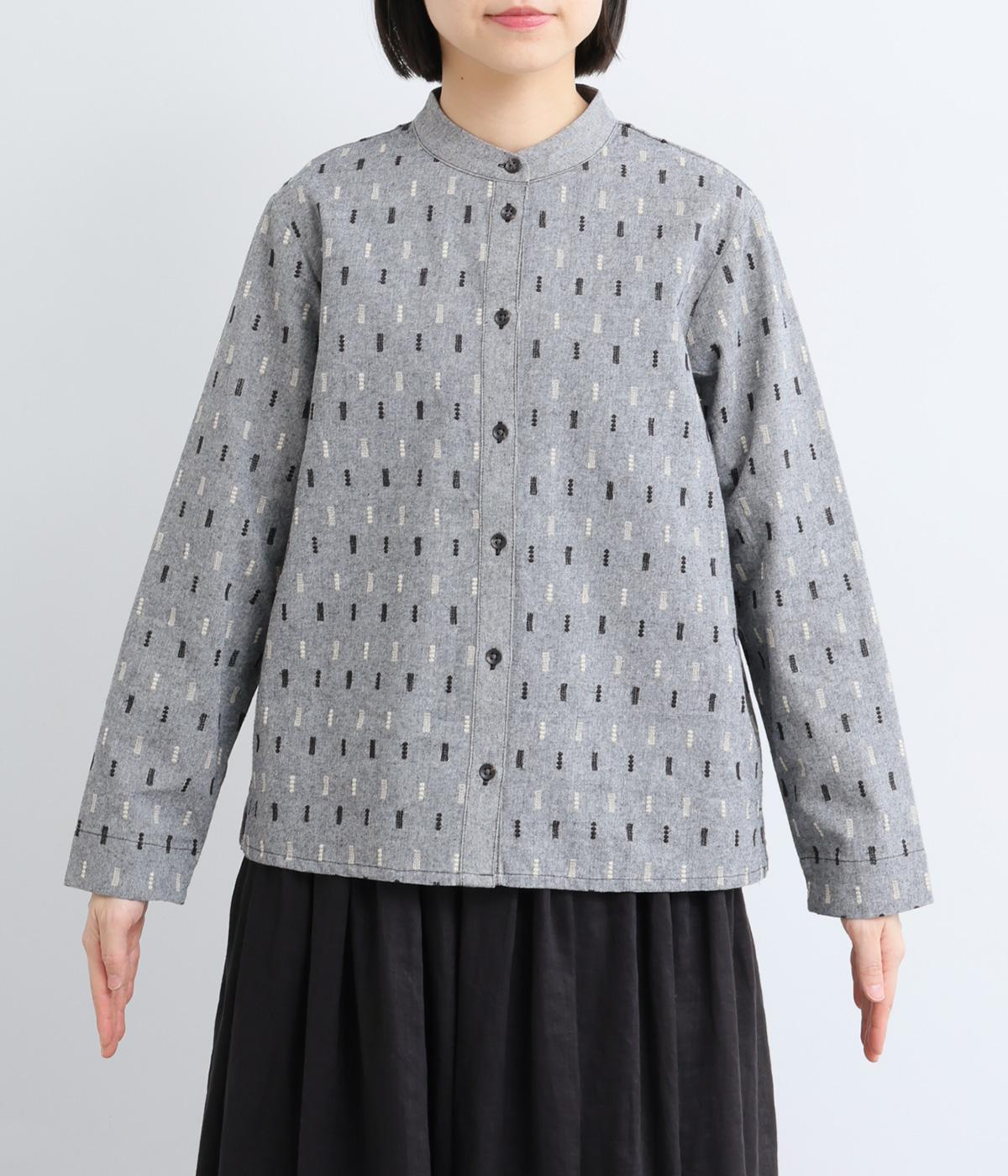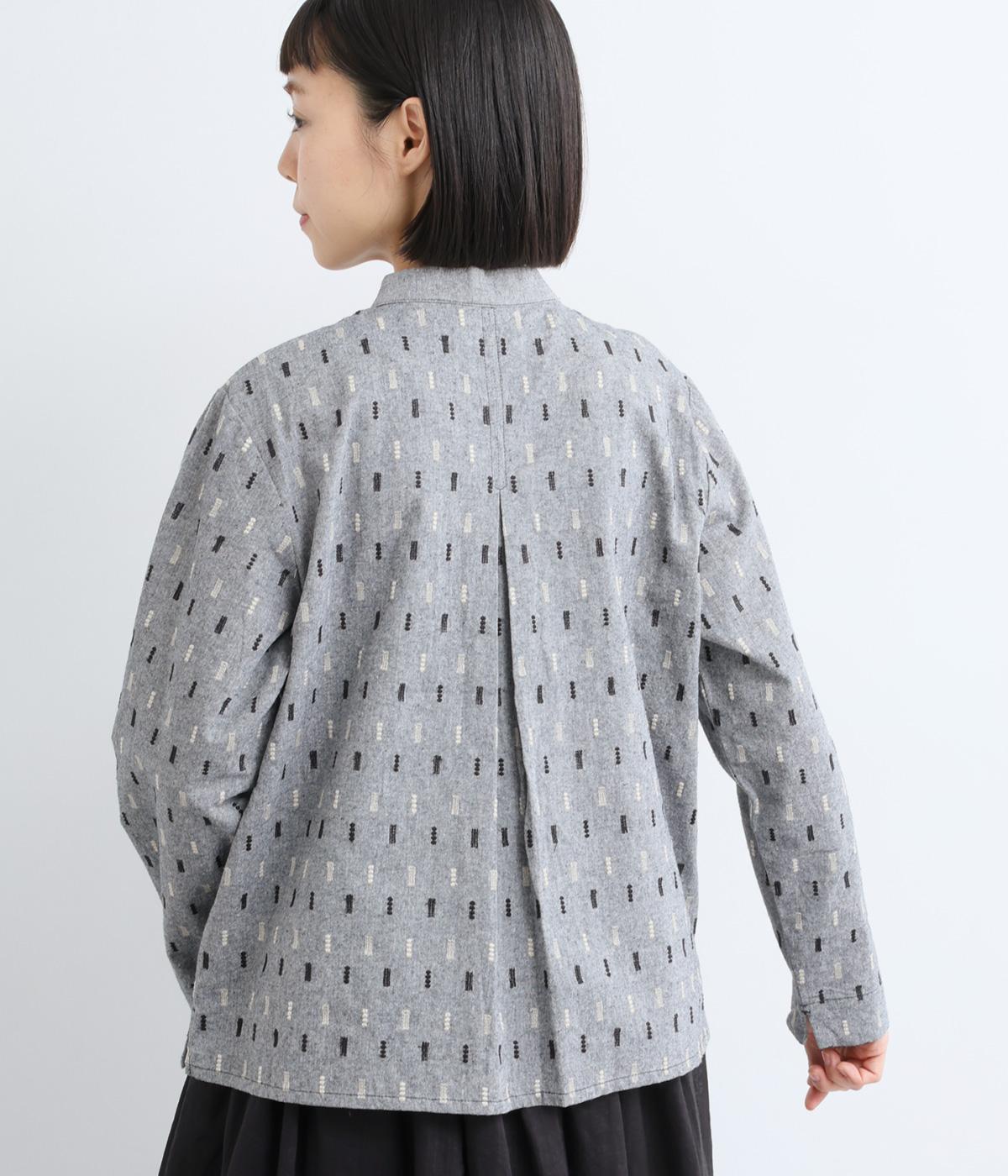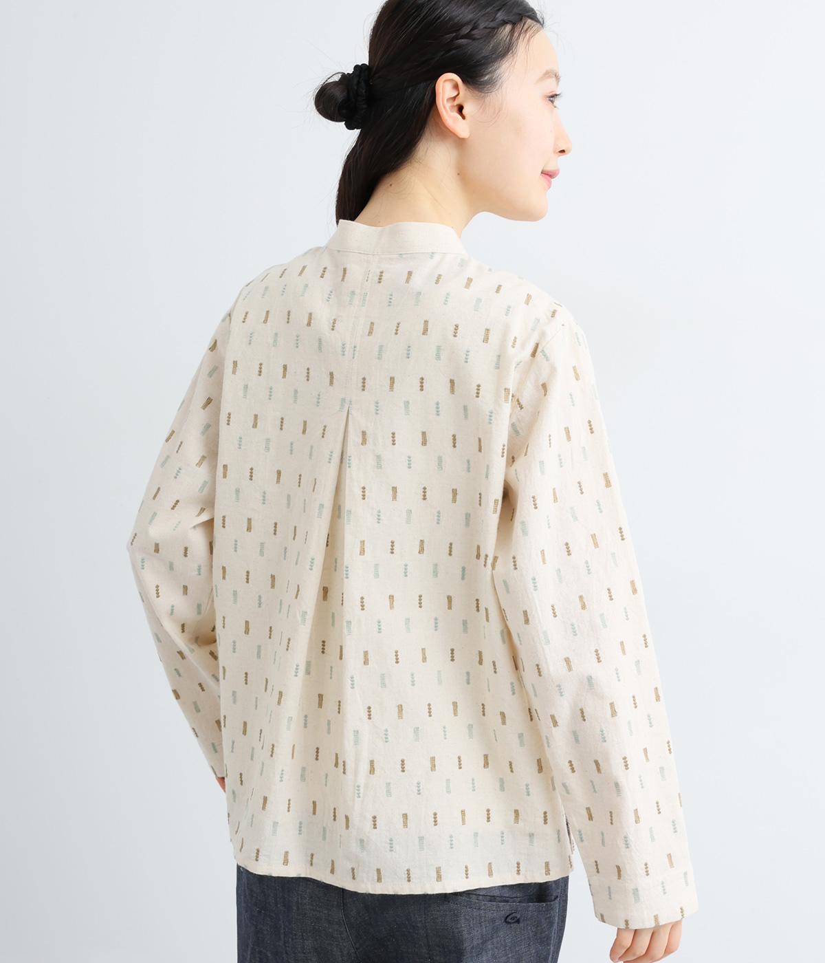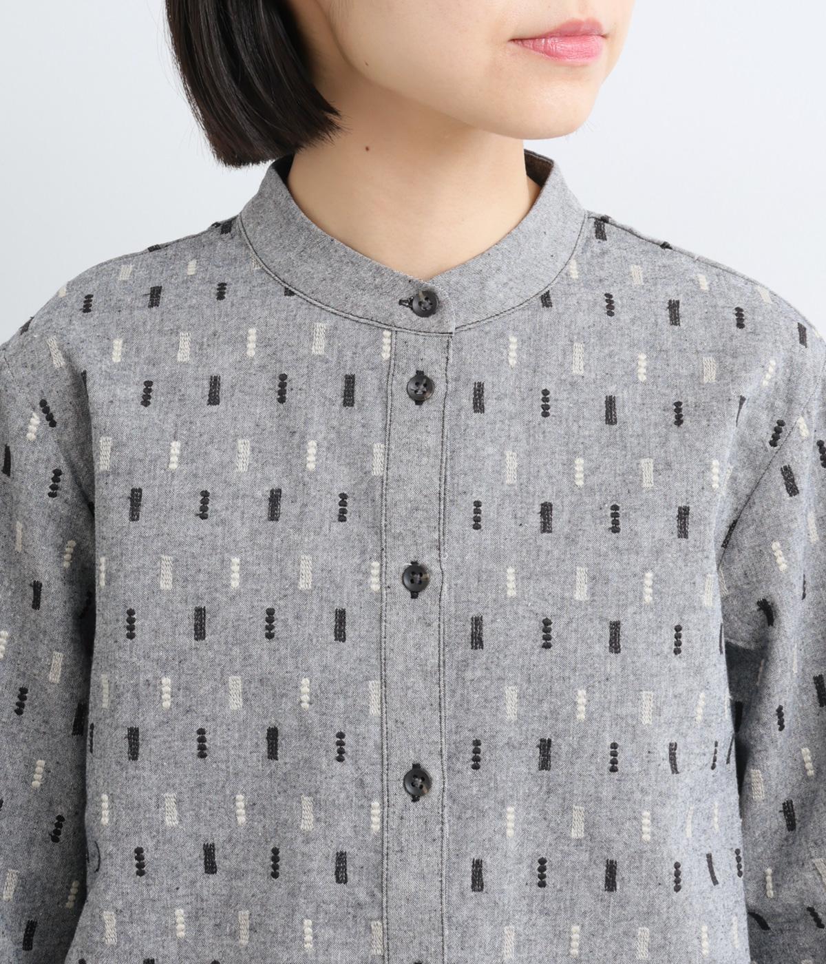端正な印象のバンドカラーブラウスに、オリジナルの刺しゅうをちりばめました。小さなモチーフを規則的に配することで、ナチュラルで落ち着きのある表情に。背面にはボックスタックを施し、ほどよい立体感をプラスしています。スリット入りの袖は折り返しやすく、アレンジの幅が広がる一枚です。