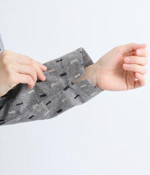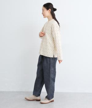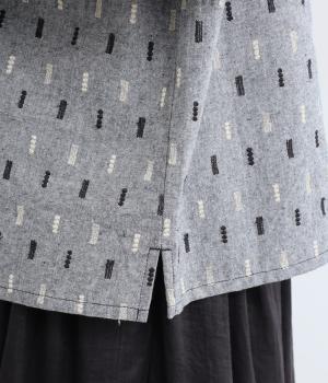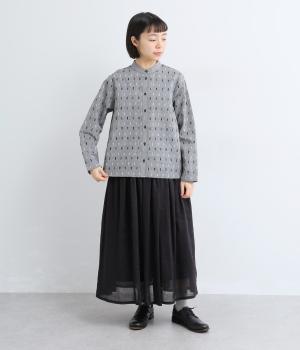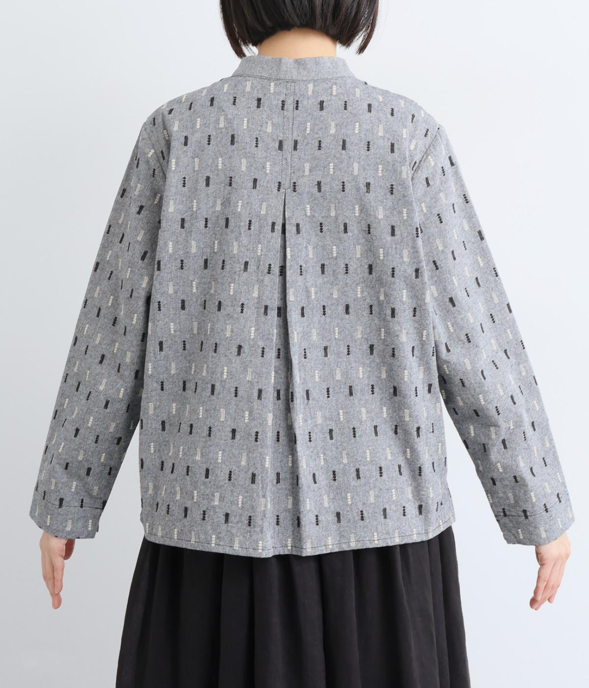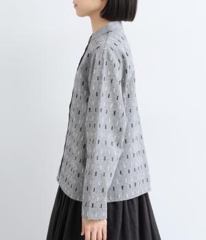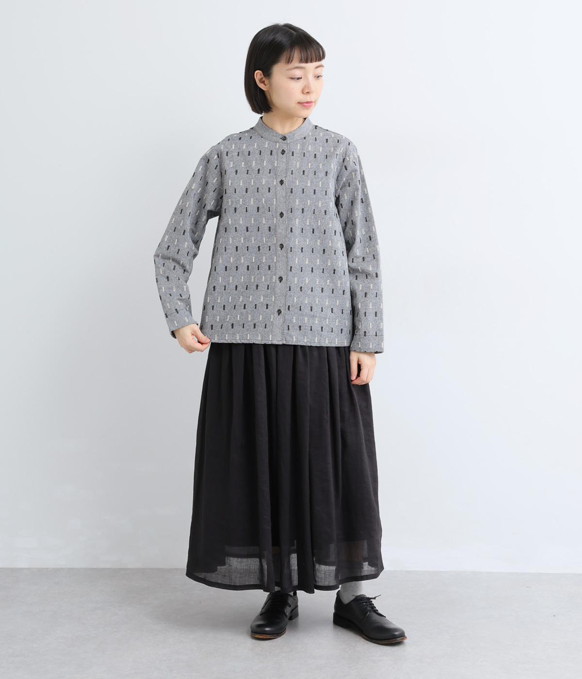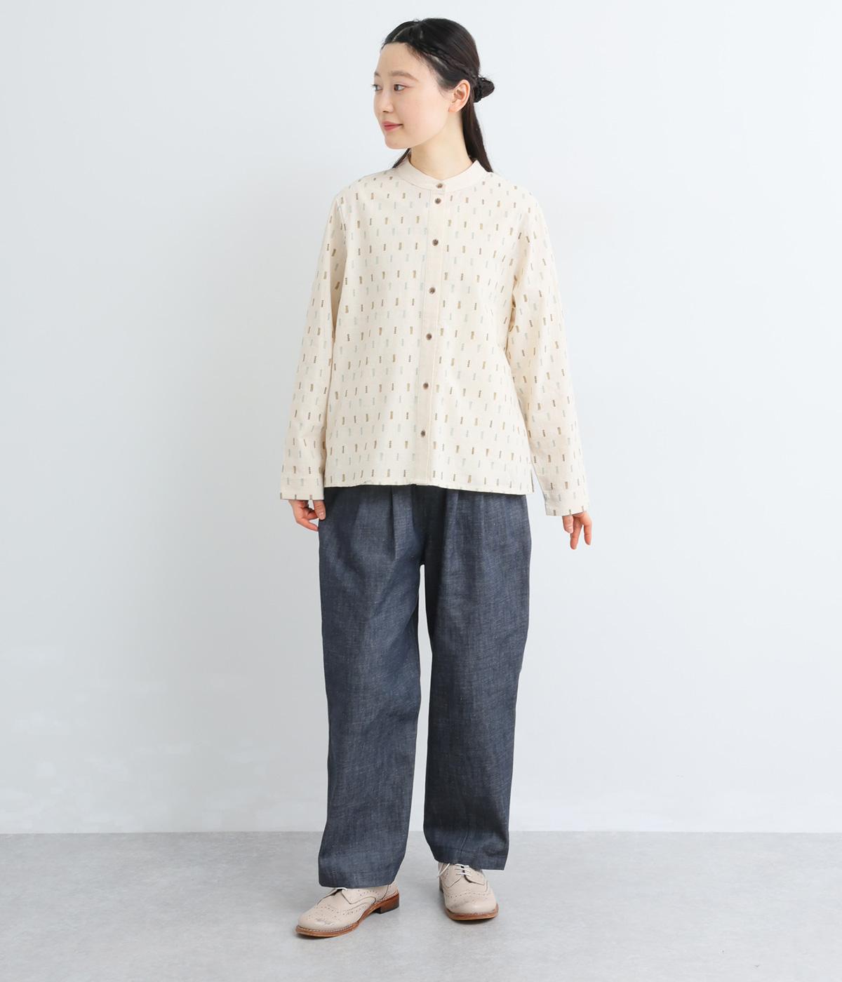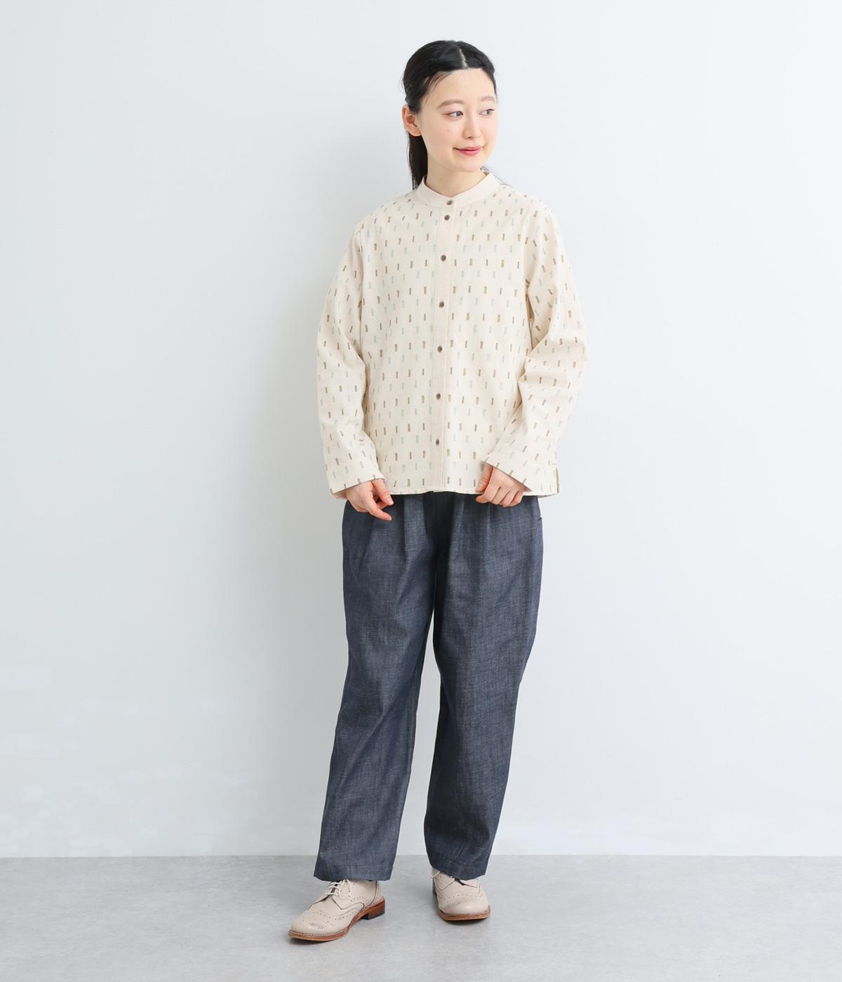 端正な印象のバンドカラーブラウスに、オリジナルの刺しゅうをちりばめました。小さなモチーフを規則的に配することで、ナチュラルで落ち着きのある表情に。背面にはボックスタックを施し、ほどよい立体感をプラスしています。スリット入りの袖は折り返しやすく、アレンジの幅が広がる一枚です。