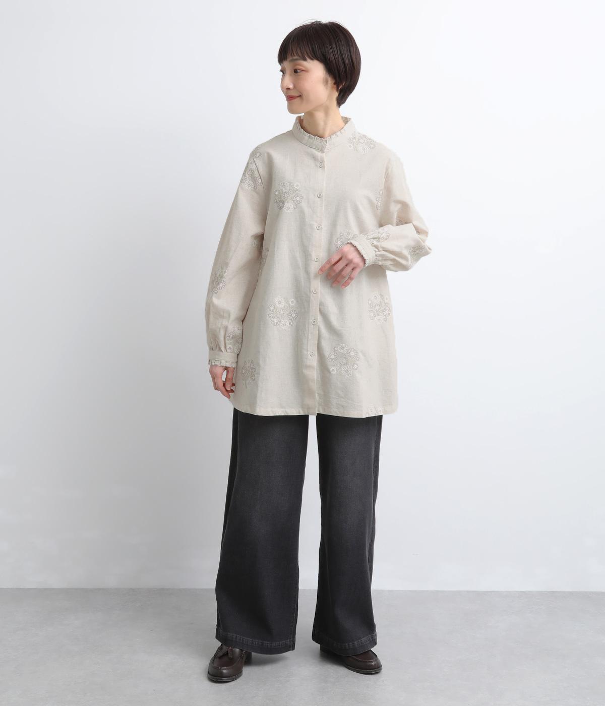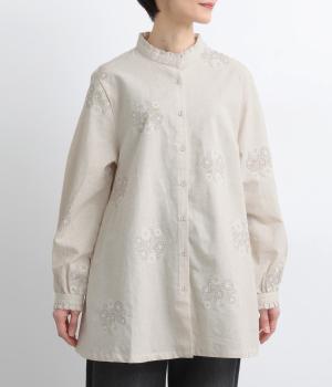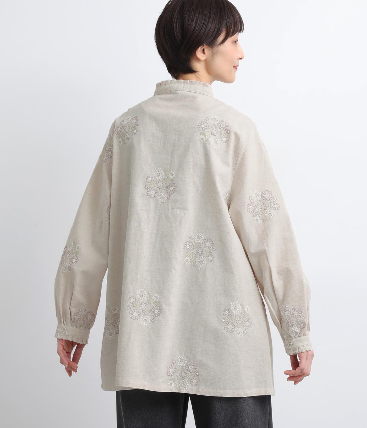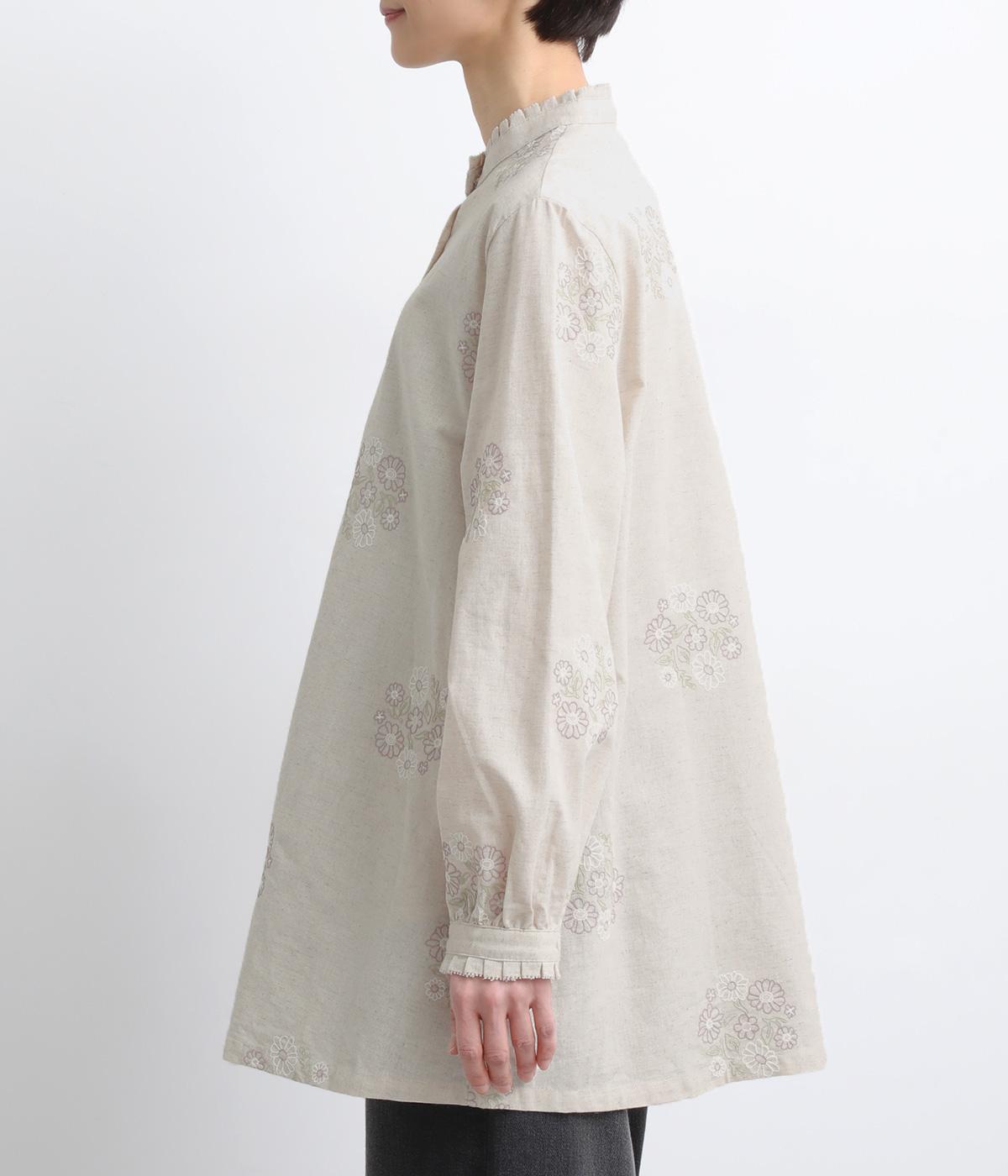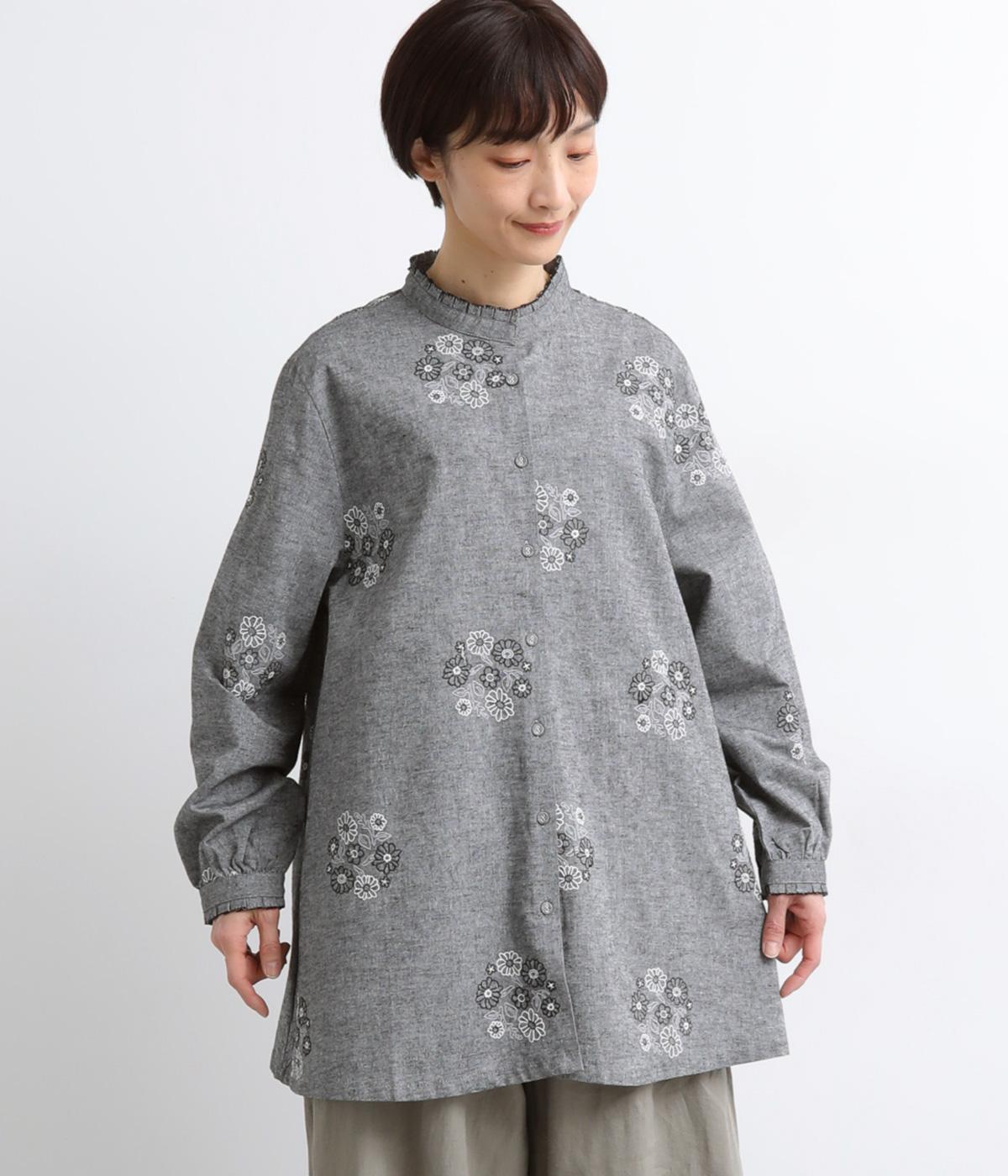 ころんとした丸みのあるフラワー刺しゅうが、やさしい表情を添えるブラウスです。タックフリルの襟元と袖口が、クラシックでフェミニンな印象を引き立てます。チュニック丈なので、腰まわりを自然にカバーしてくれるのもうれしいポイント。前をあけて、羽織りとしての着こなしもおすすめです。