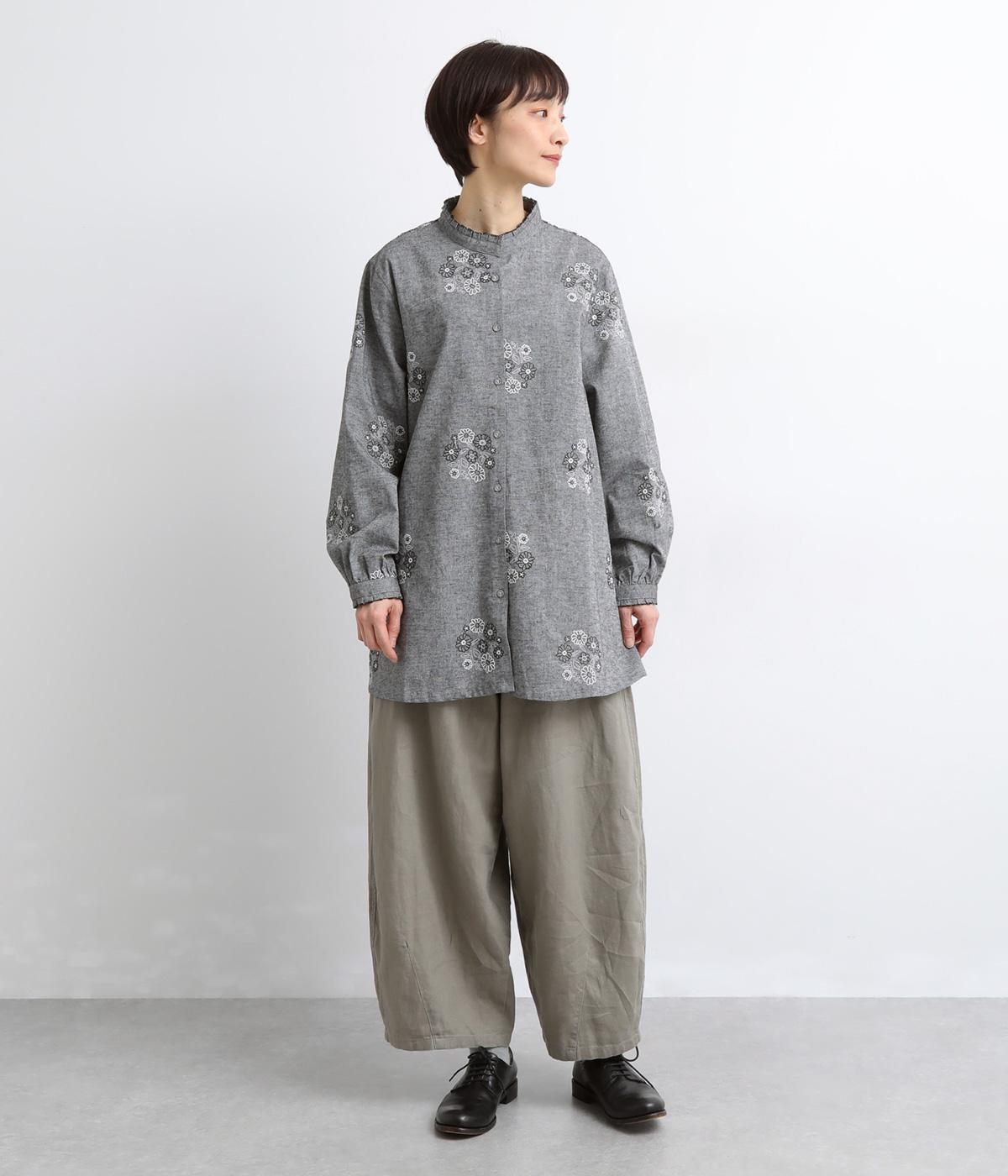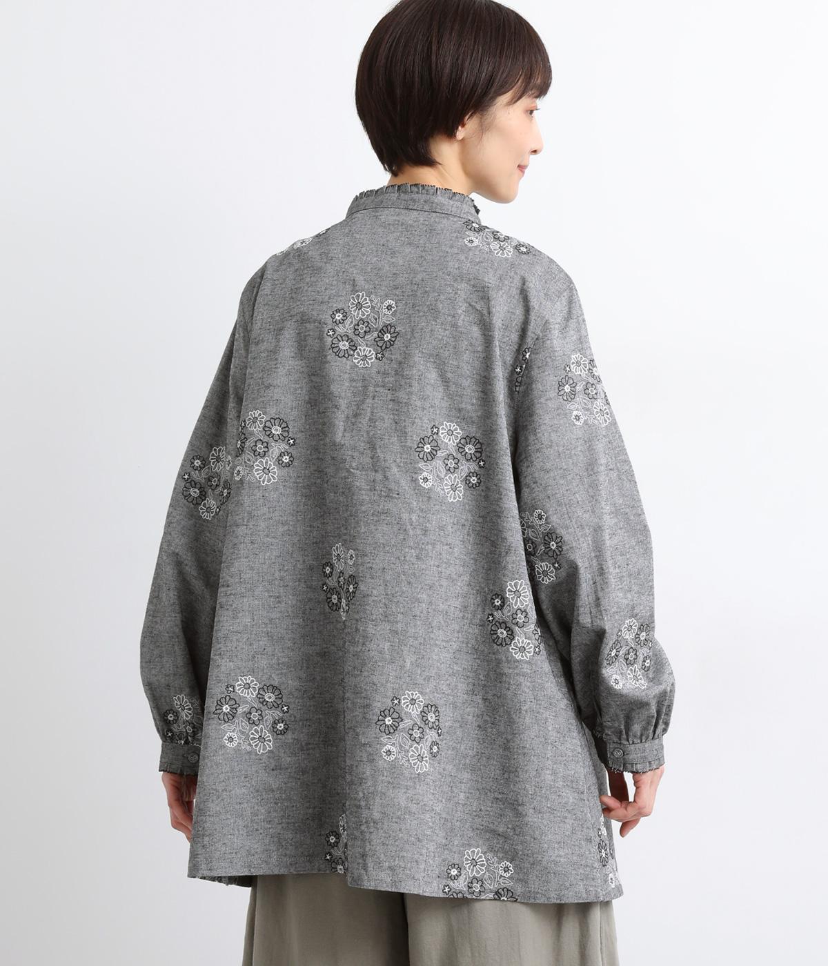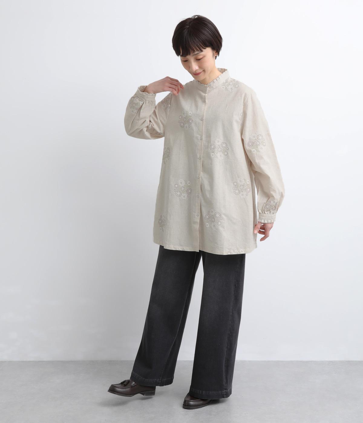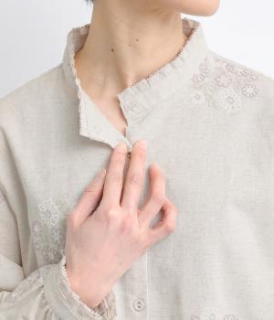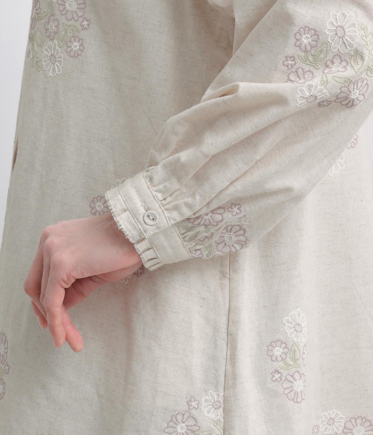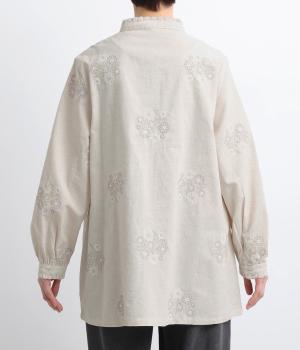 ころんとした丸みのあるフラワー刺しゅうが、やさしい表情を添えるブラウスです。タックフリルの襟元と袖口が、クラシックでフェミニンな印象を引き立てます。チュニック丈なので、腰まわりを自然にカバーしてくれるのもうれしいポイント。前をあけて、羽織りとしての着こなしもおすすめです。