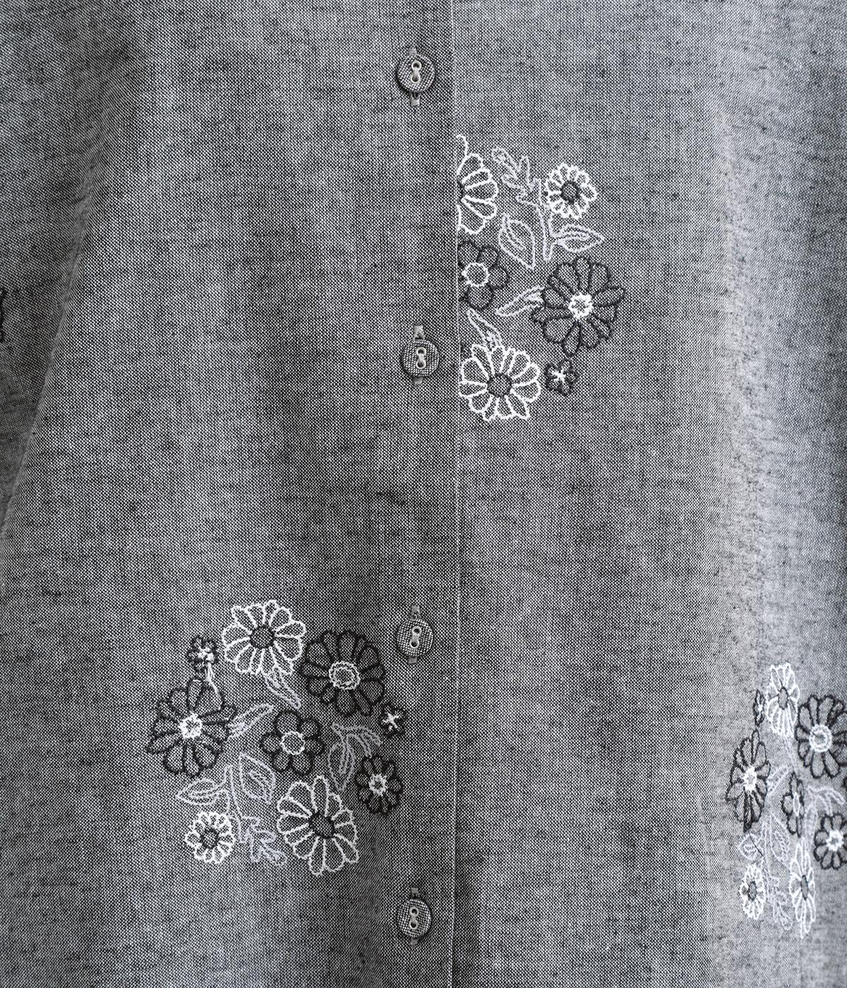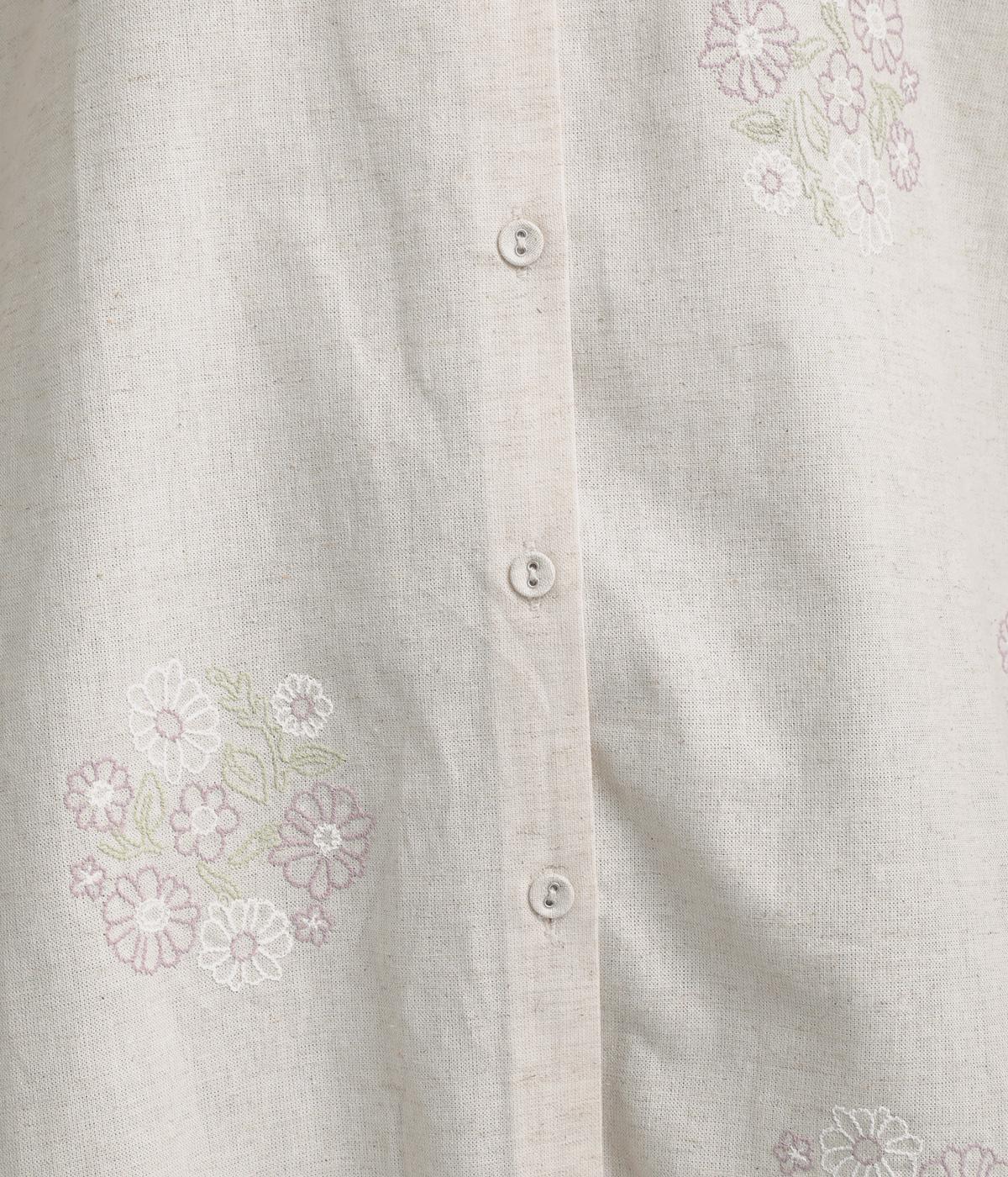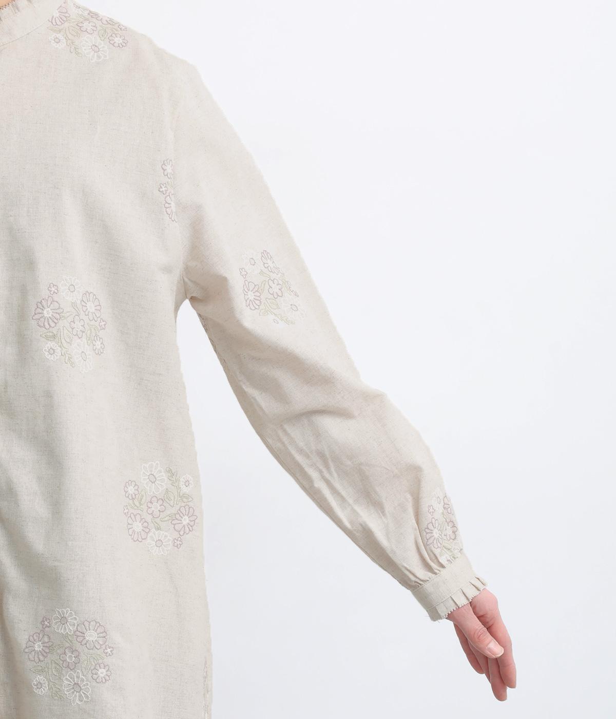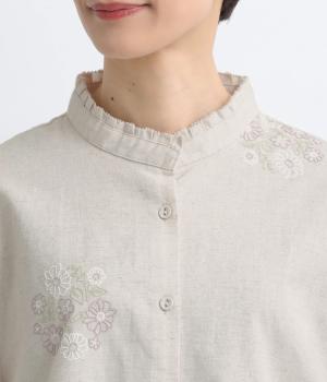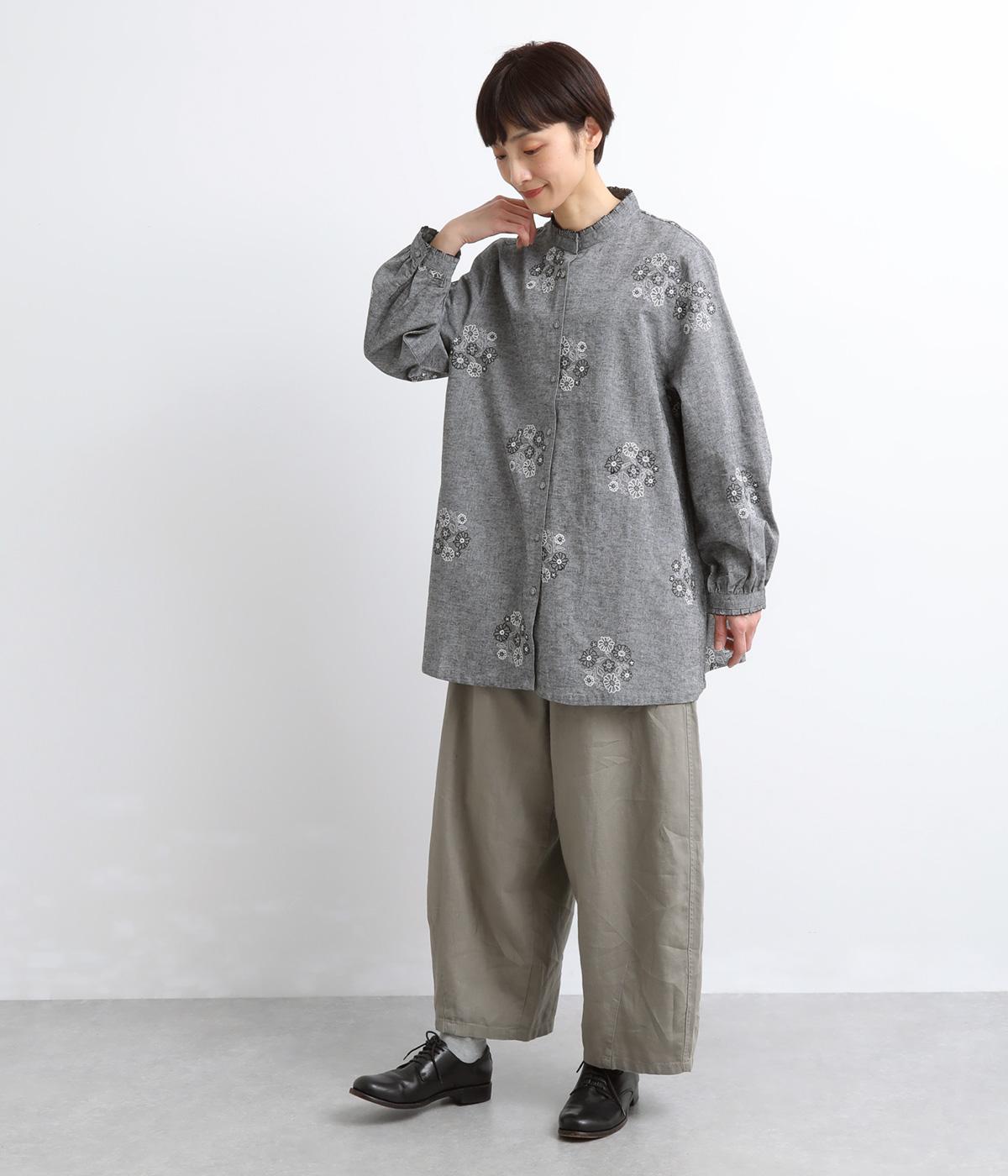 ころんとした丸みのあるフラワー刺しゅうが、やさしい表情を添えるブラウスです。タックフリルの襟元と袖口が、クラシックでフェミニンな印象を引き立てます。チュニック丈なので、腰まわりを自然にカバーしてくれるのもうれしいポイント。前をあけて、羽織りとしての着こなしもおすすめです。