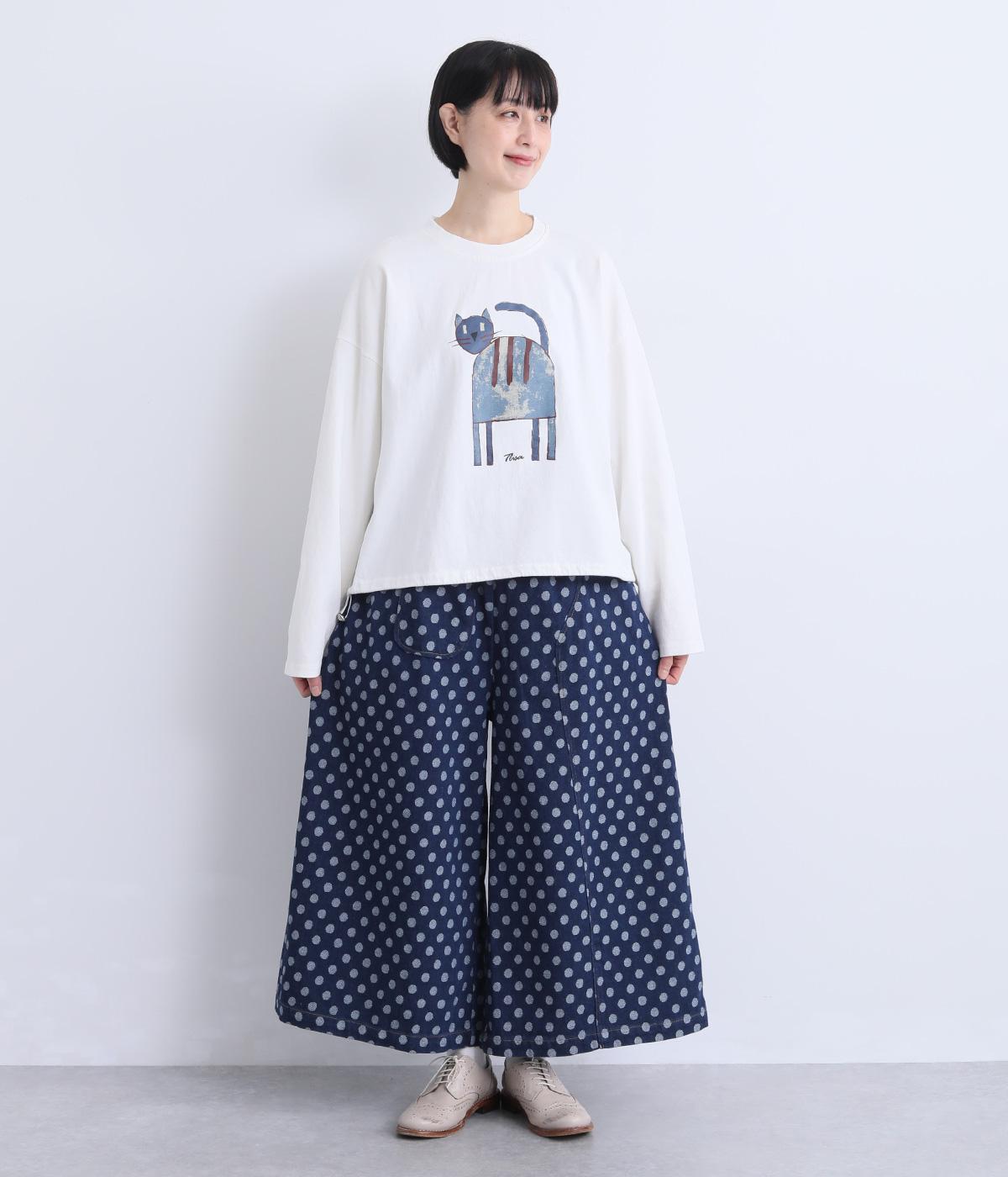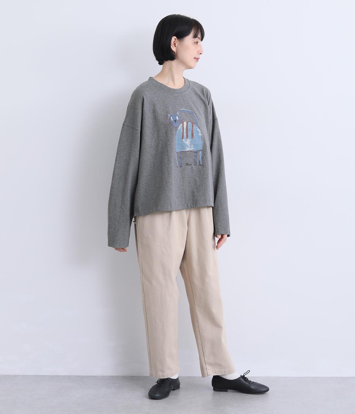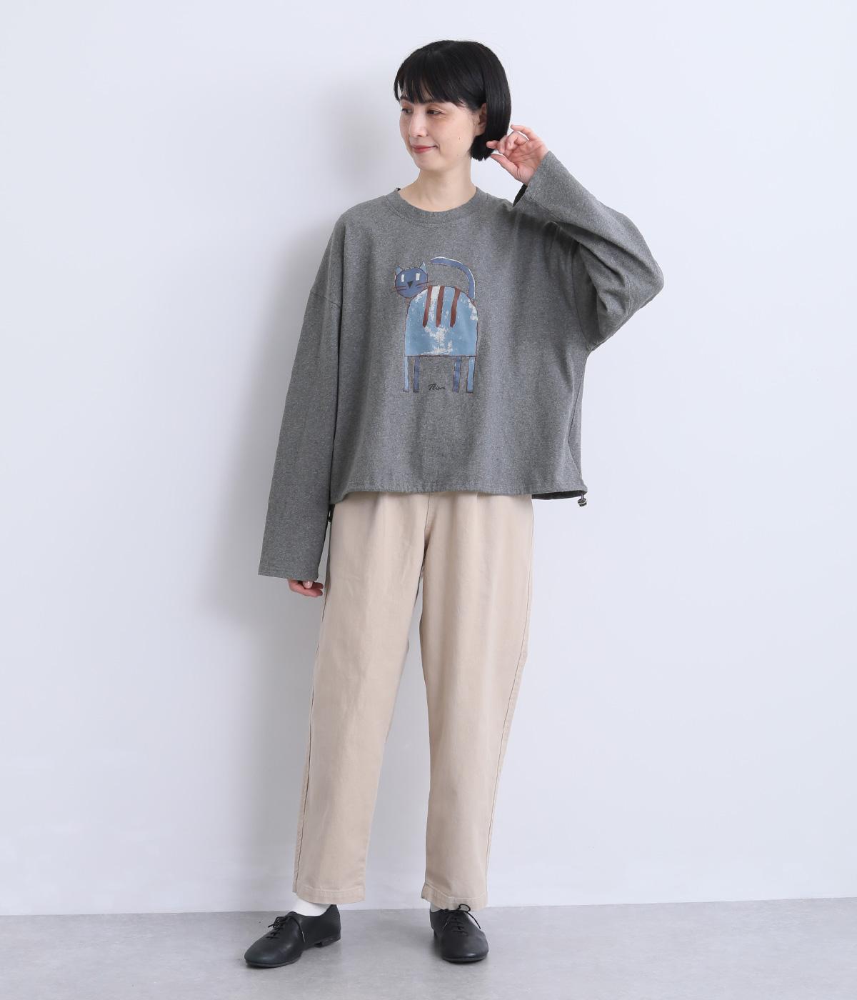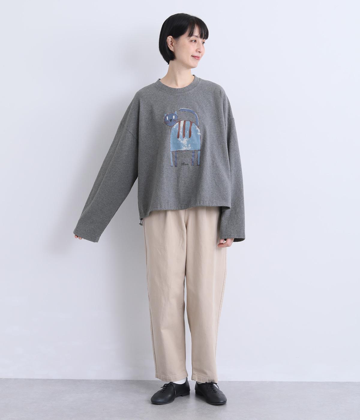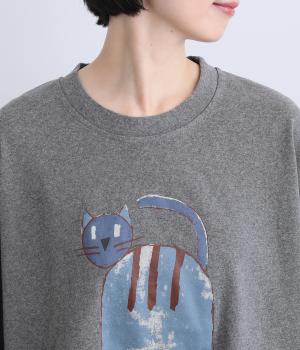 くるりとこちらを向いた猫の姿をユーモアのあるタッチで描きました。アニマル柄だけど可愛らしすぎない絶妙なバランスが◎。肩を落としたゆるめのサイズ感が着心地よく、裾のアジャスターでアレンジも可能です。