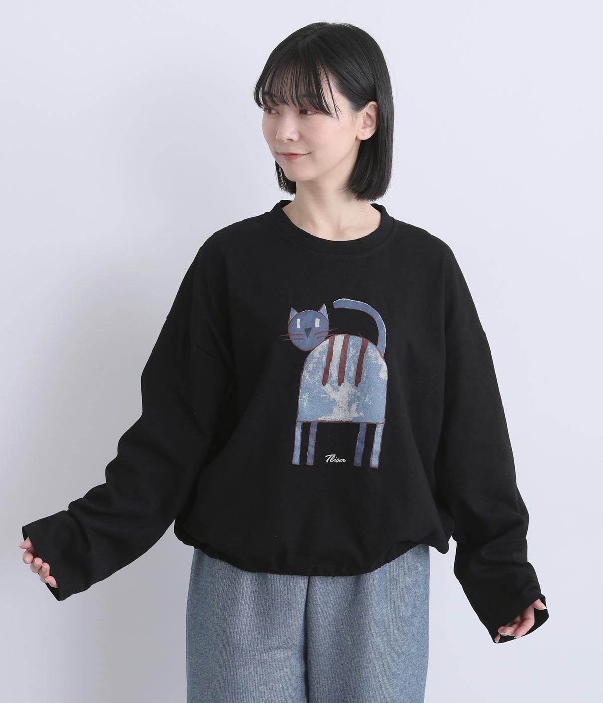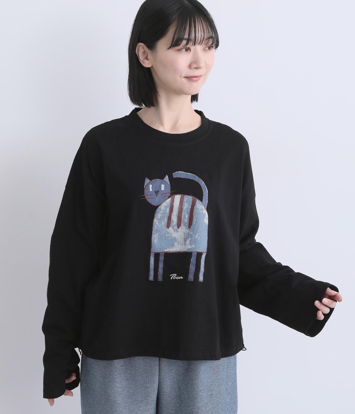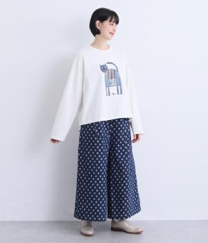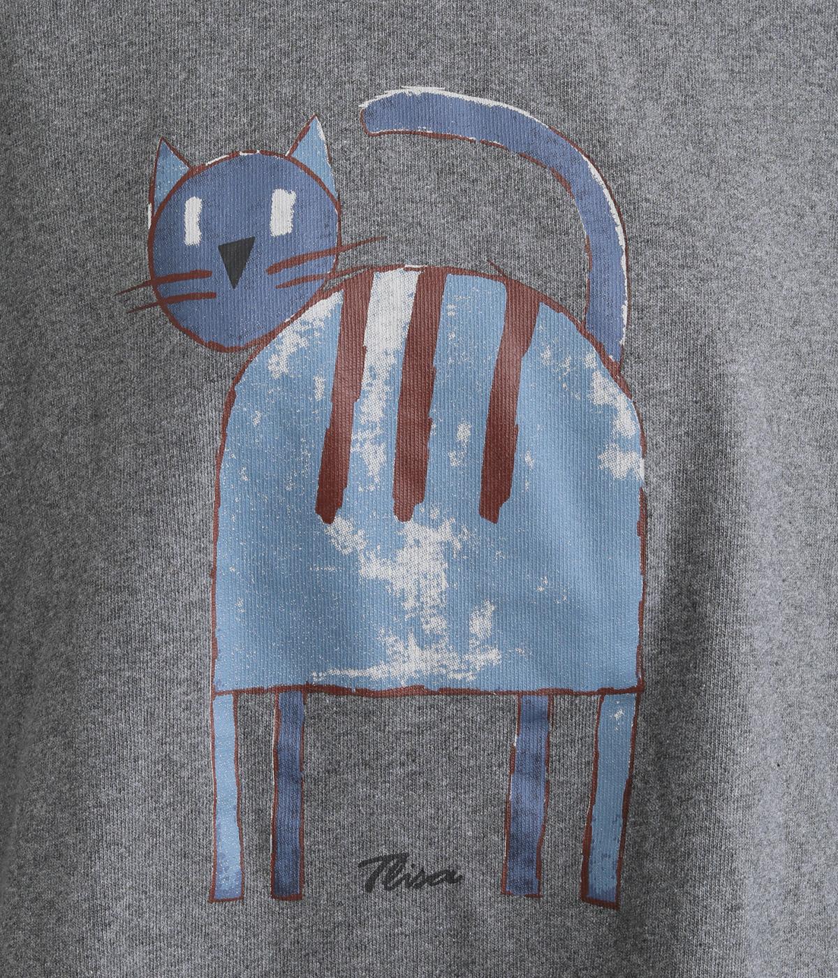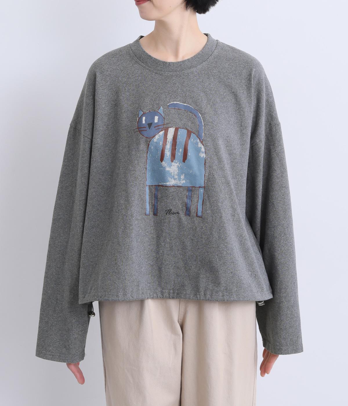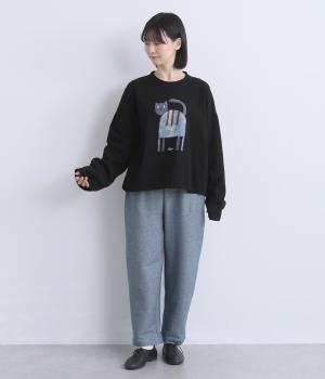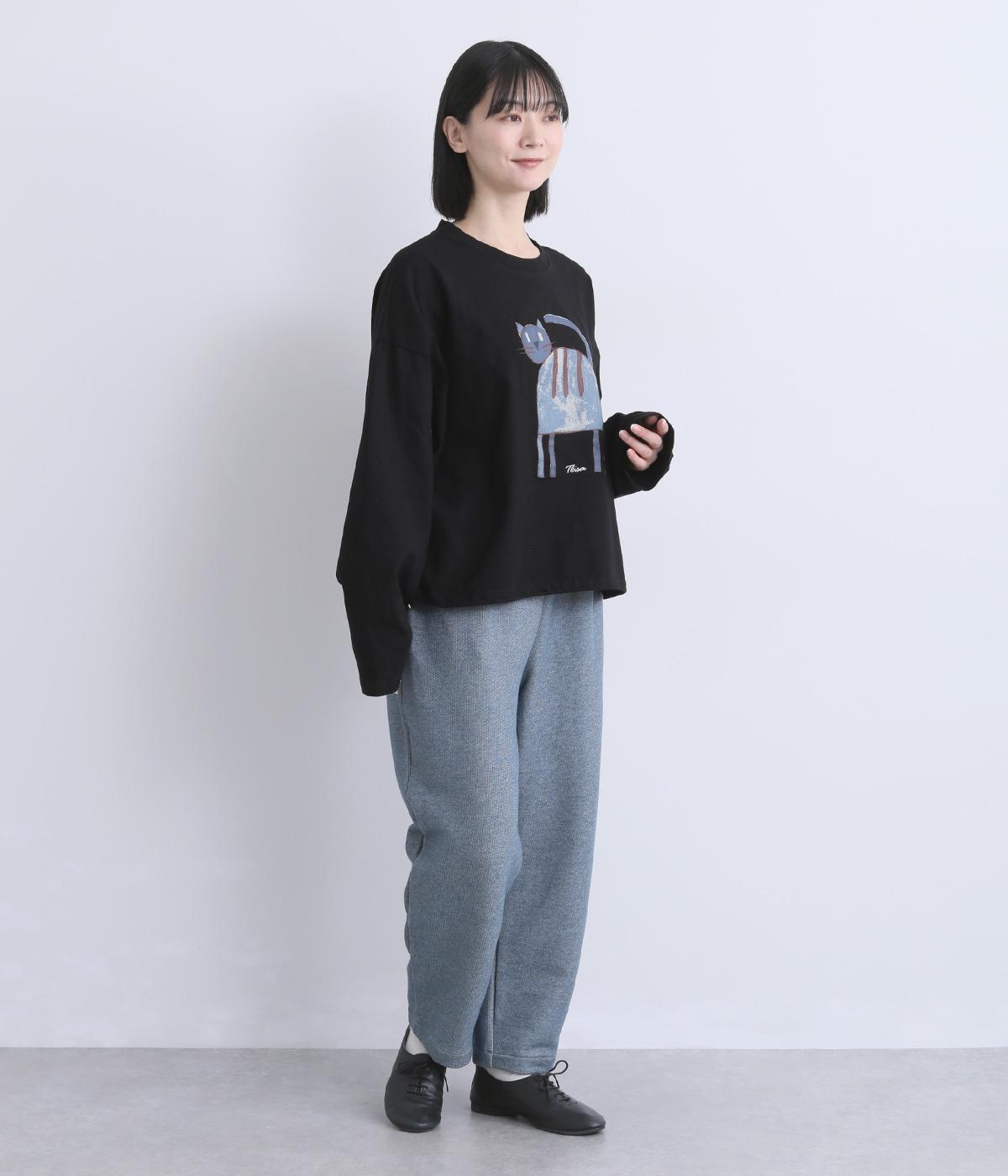 くるりとこちらを向いた猫の姿をユーモアのあるタッチで描きました。アニマル柄だけど可愛らしすぎない絶妙なバランスが◎。肩を落としたゆるめのサイズ感が着心地よく、裾のアジャスターでアレンジも可能です。