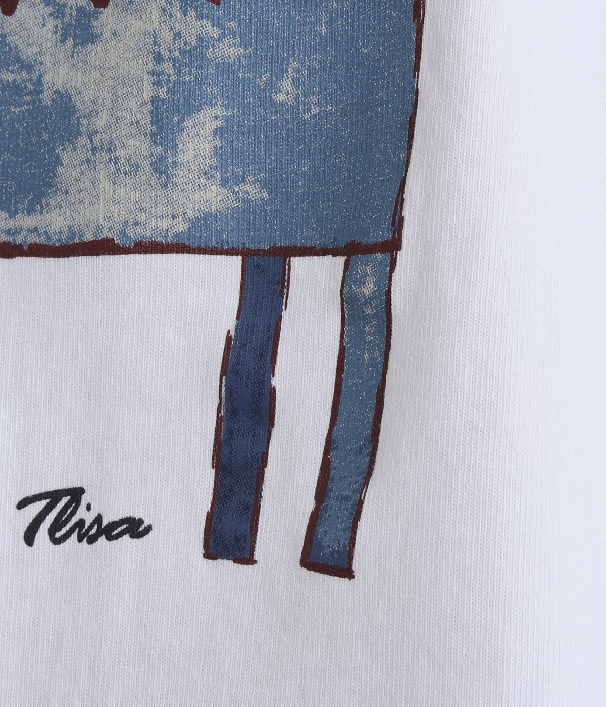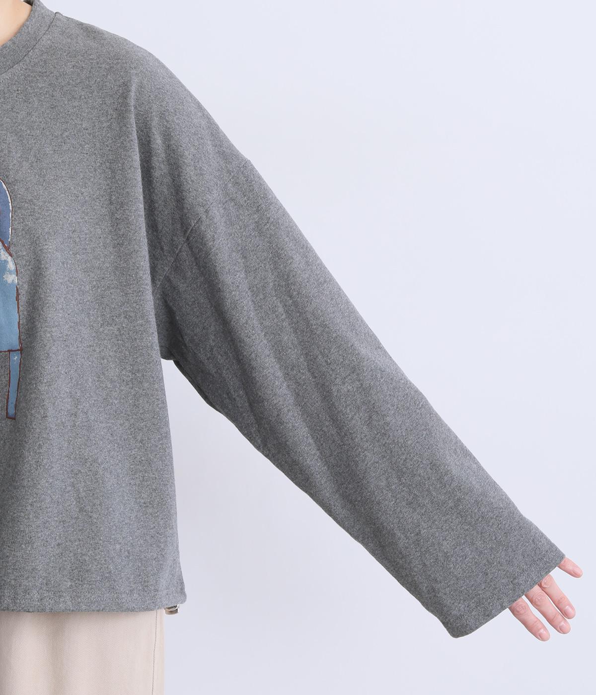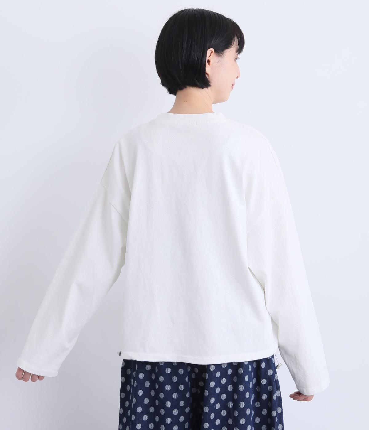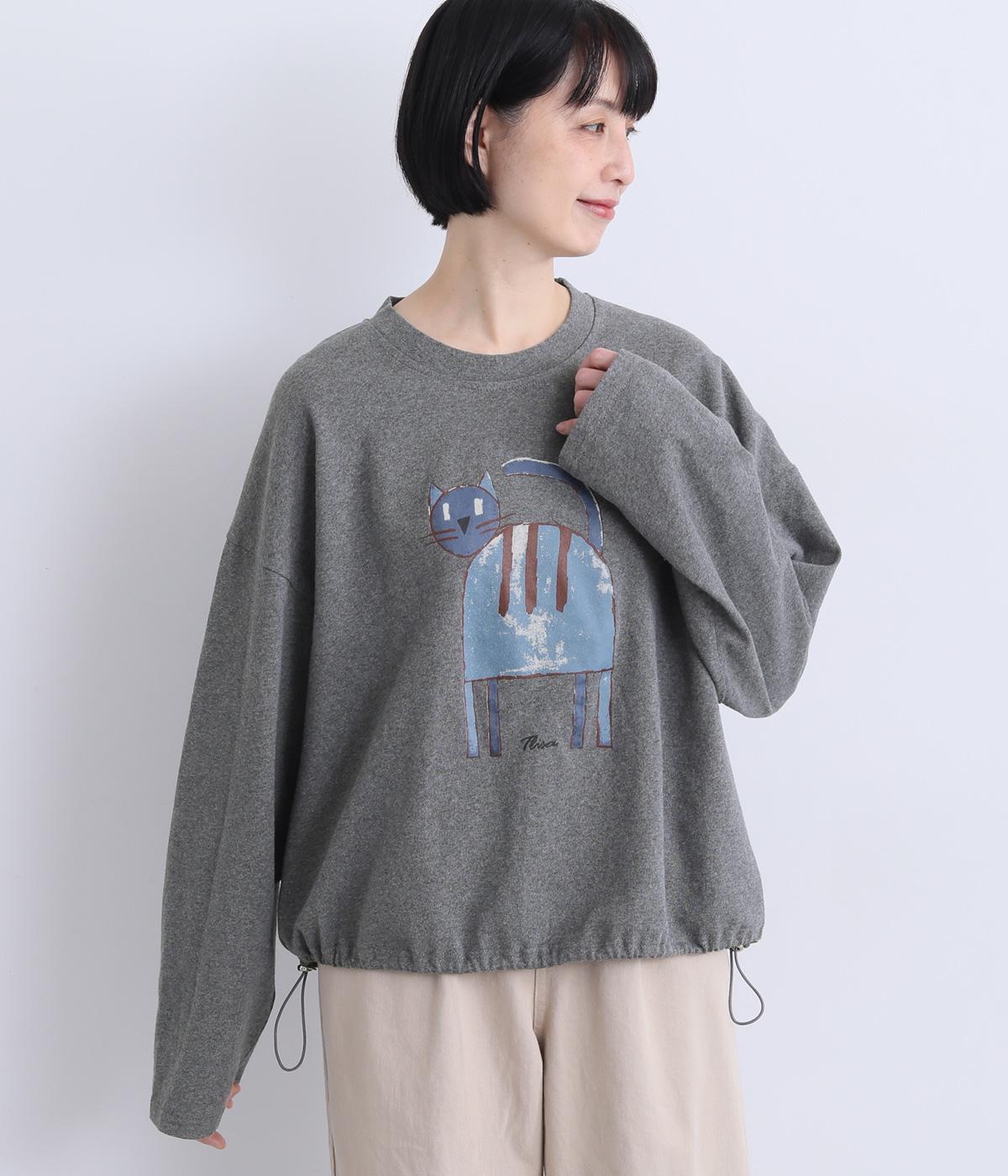 くるりとこちらを向いた猫の姿をユーモアのあるタッチで描きました。アニマル柄だけど可愛らしすぎない絶妙なバランスが◎。肩を落としたゆるめのサイズ感が着心地よく、裾のアジャスターでアレンジも可能です。