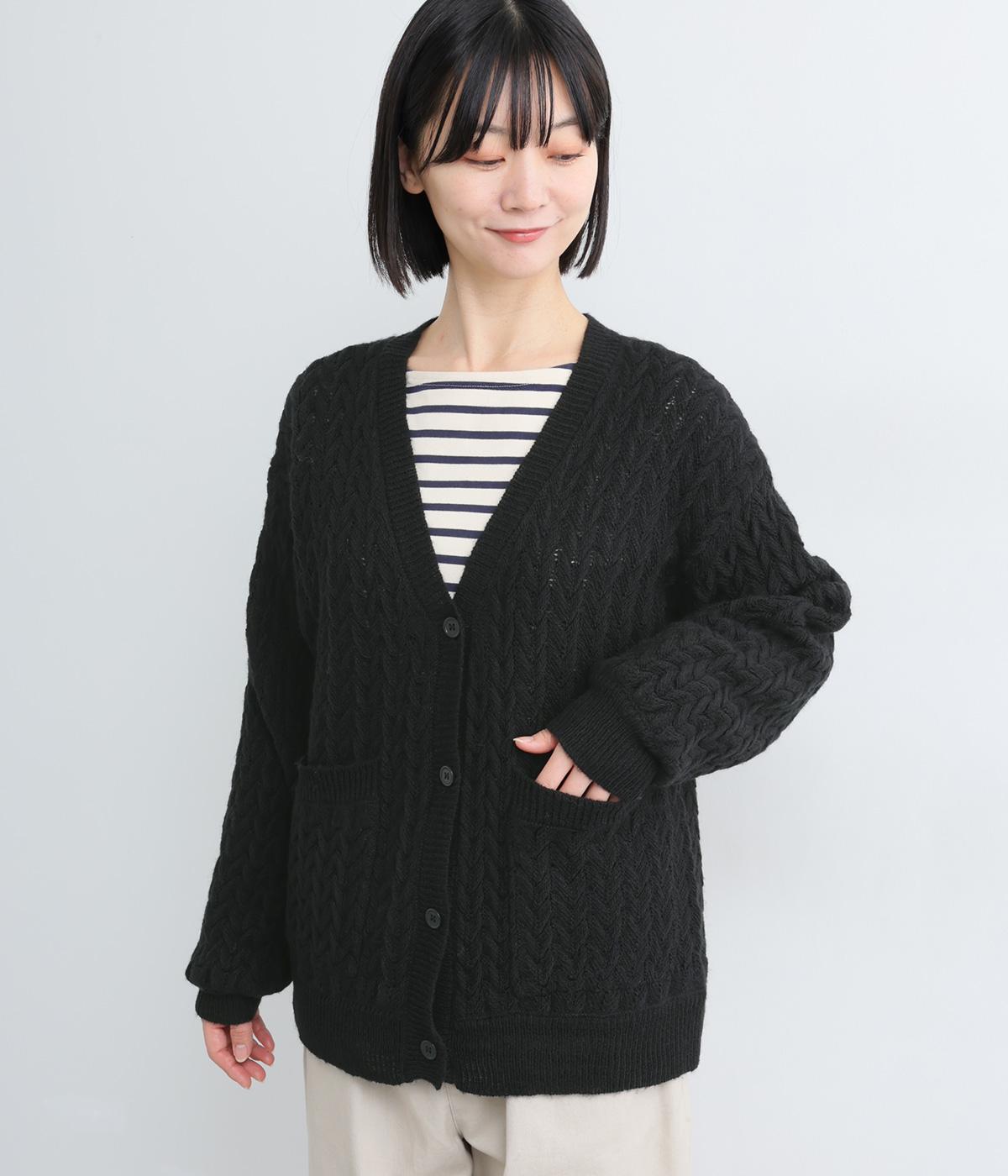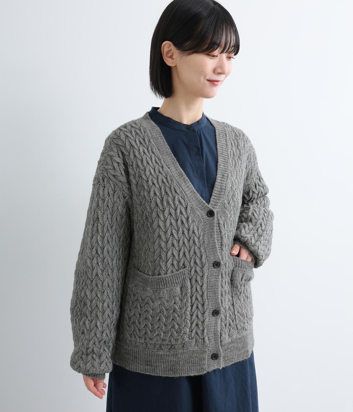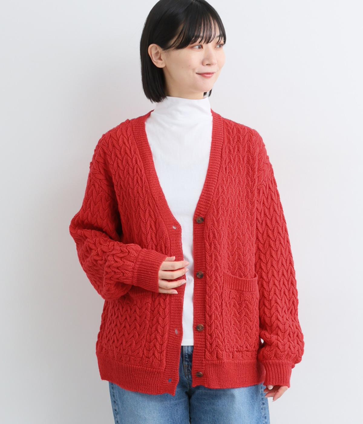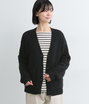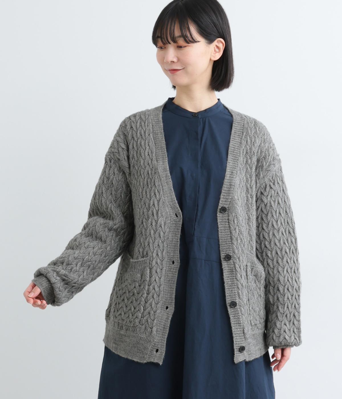ざっくりとしたケーブル編みが魅力のニットカーディガン。深めのVネックからインナーをのぞかせたコーディネートを楽しめます。さっと手を入れやすい大きめのポケットもアクセントに。厚すぎず薄すぎない生地で、季節を問わず着まわしやすい一着です。