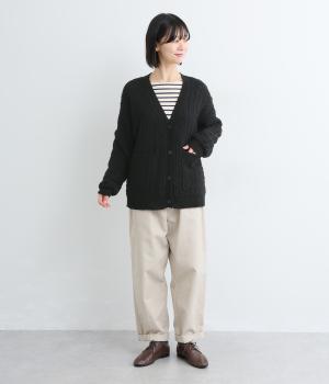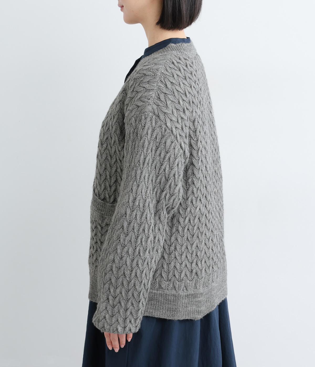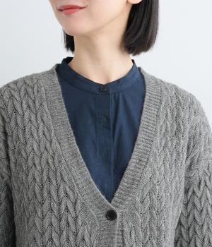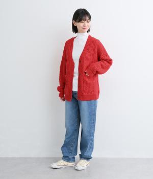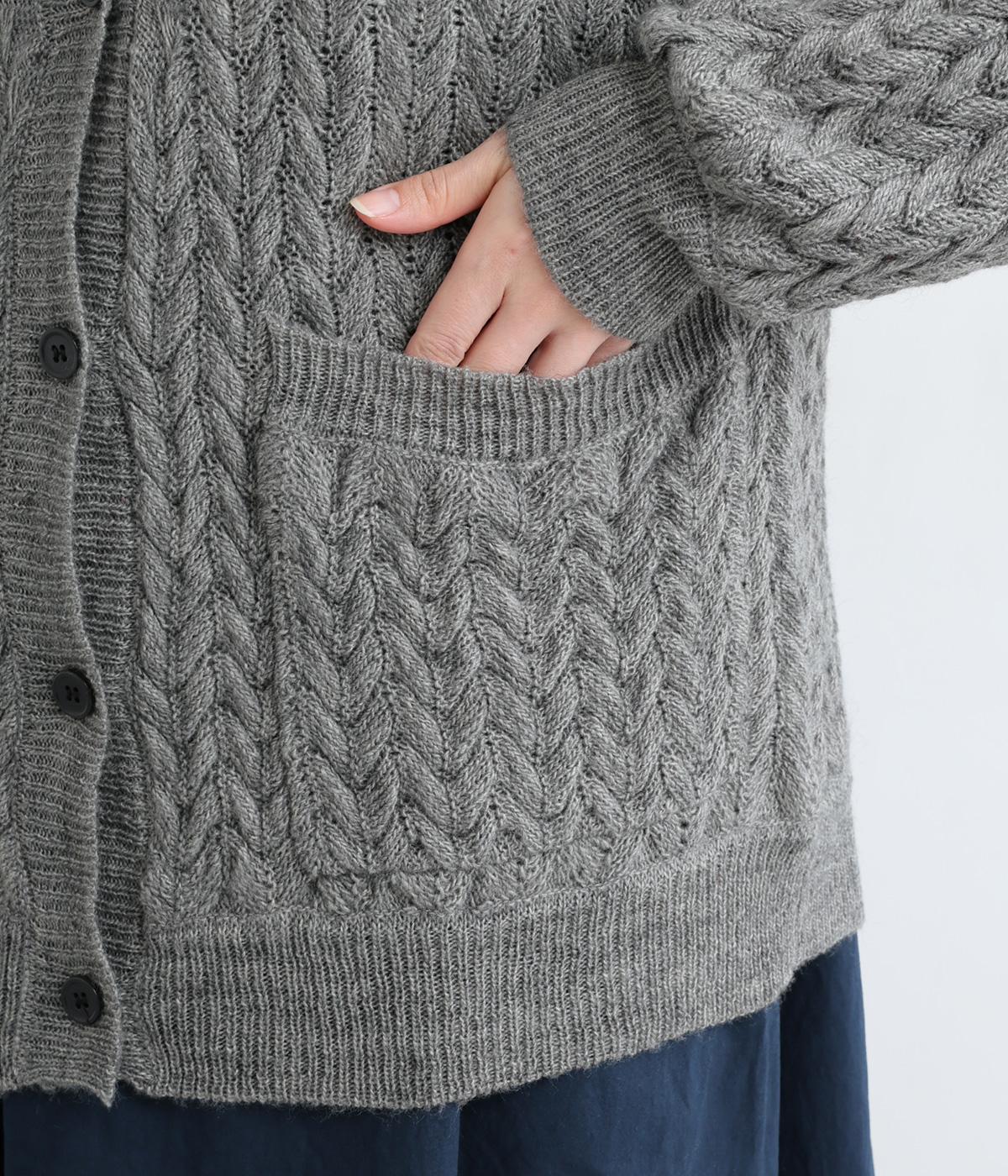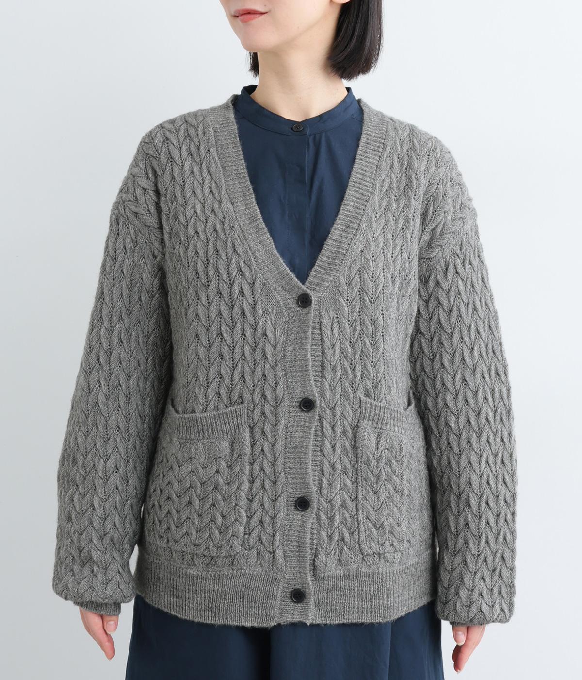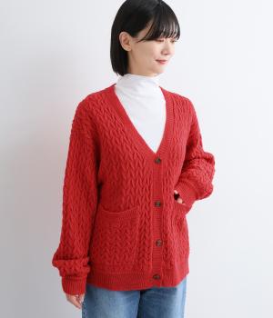 ざっくりとしたケーブル編みが魅力のニットカーディガン。深めのVネックからインナーをのぞかせたコーディネートを楽しめます。さっと手を入れやすい大きめのポケットもアクセントに。厚すぎず薄すぎない生地で、季節を問わず着まわしやすい一着です。