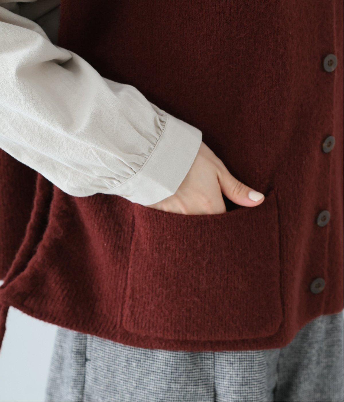 肩を覆うゆったりシルエットのニットベスト。脇下から裾にかけてドローコードを通した、抜け感のある横姿が素敵です。紐を絞ってサイドをくしゅっと短くしてもお洒落。前身頃の右裾につけたポケットもアクセントにしています。