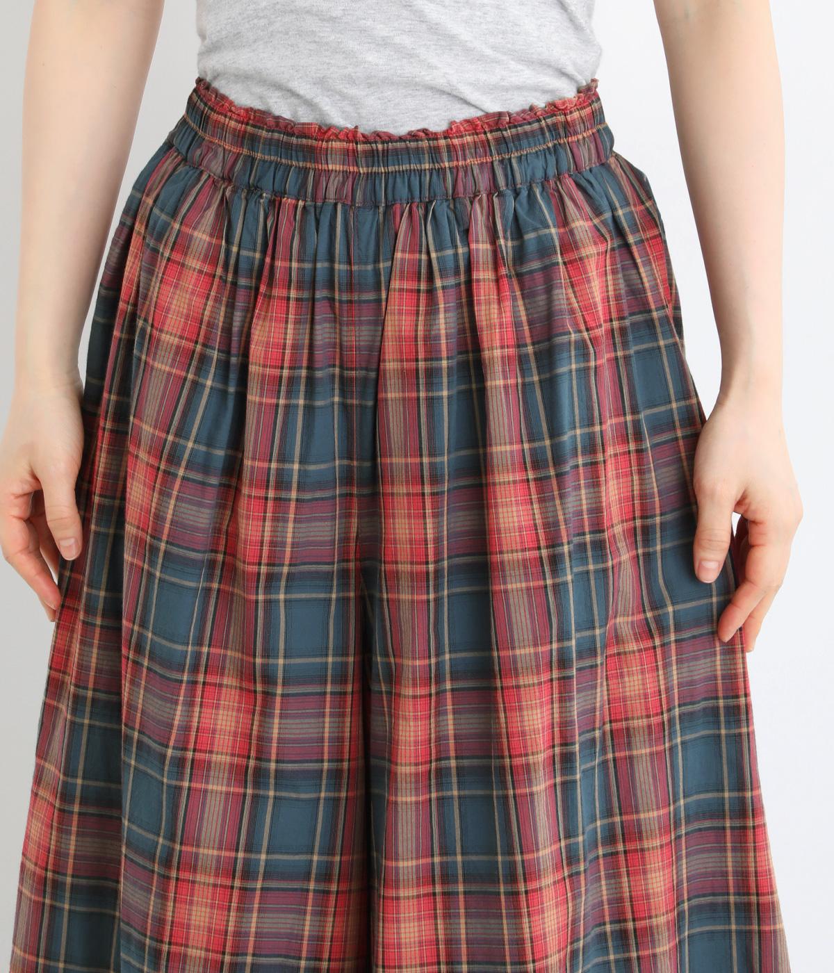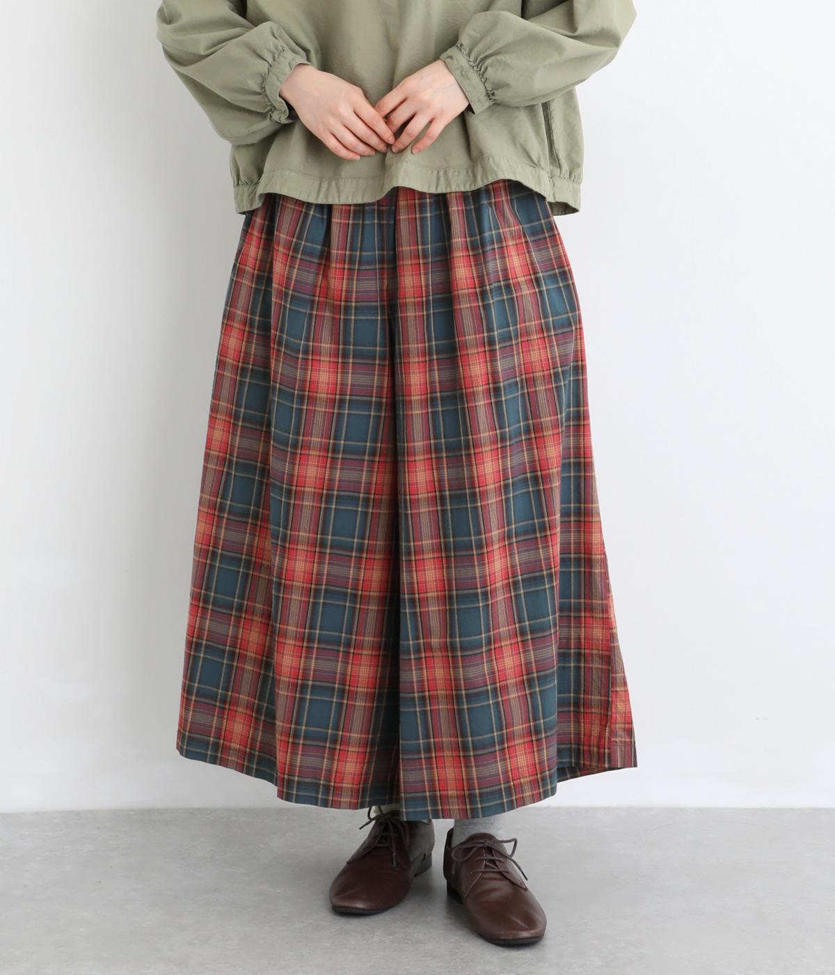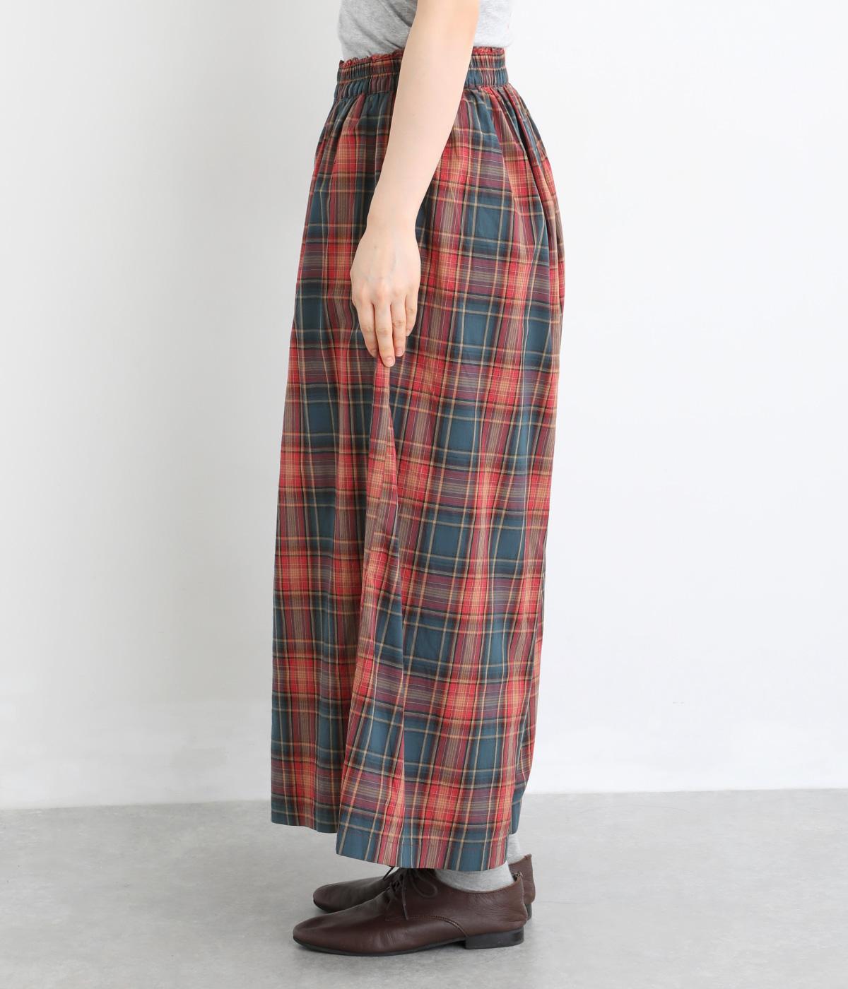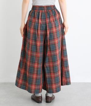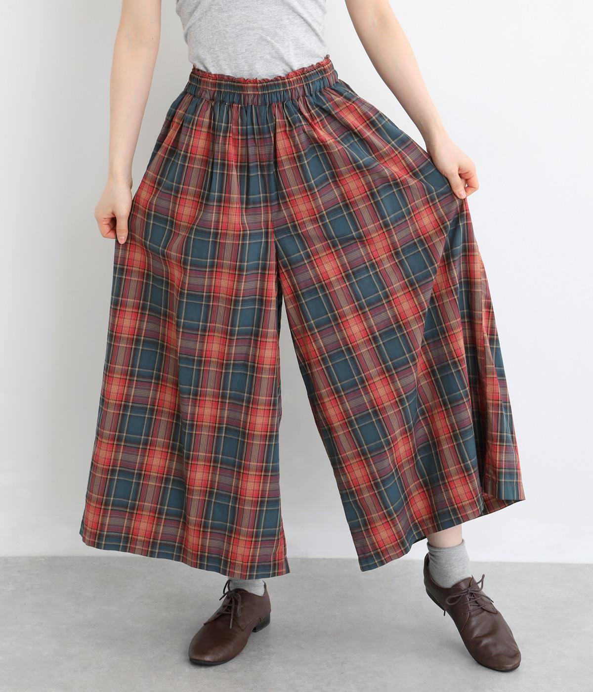 ボリュームたっぷりのワイドシルエットで、スカートのように見えるパンツ仕様です。たっぷりと入ったギャザーが生む丸みが、女性らしい印象を演出。深みのあるチェック柄がコーディネートのアクセントとなり、シンプルなトップスとも好相性です。裏地つきなので安心して着用できます。