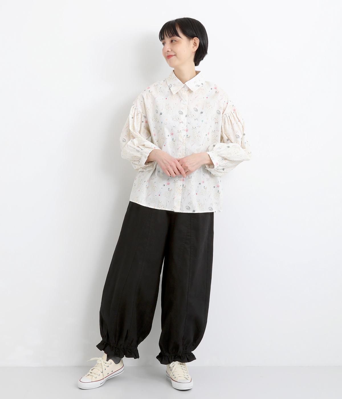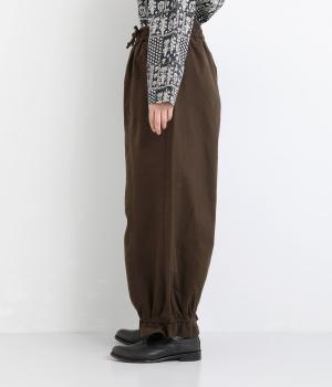 裾にフリルをほどこしたデザイン性のあるパンツです。ゆとりのあるシルエットを、縦の切り替えラインがすっきりと見せてくれます。ほどよいストレッチで動きやすさも確保しました。ウエストは総ゴム仕様で紐で調節できます。