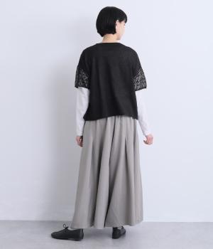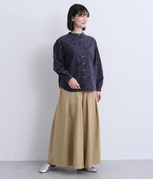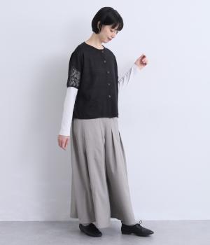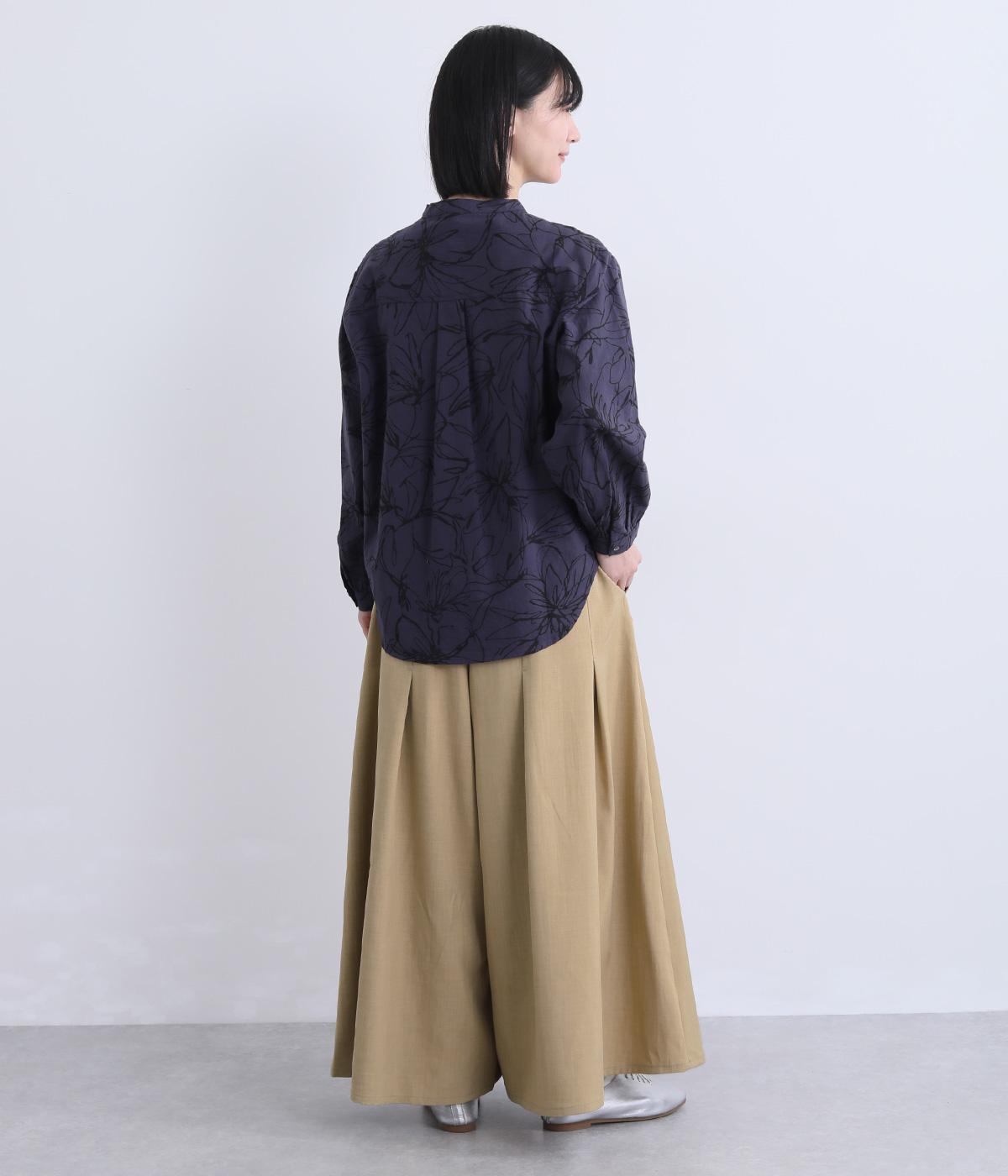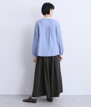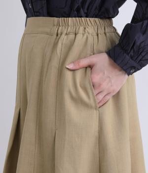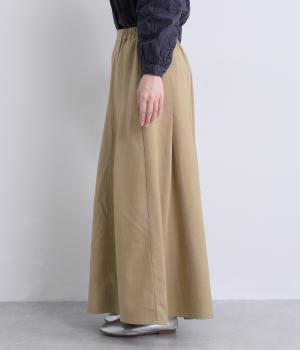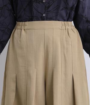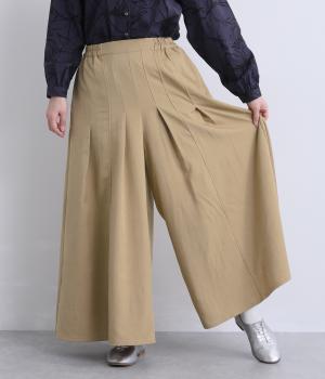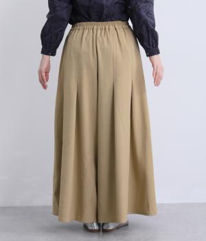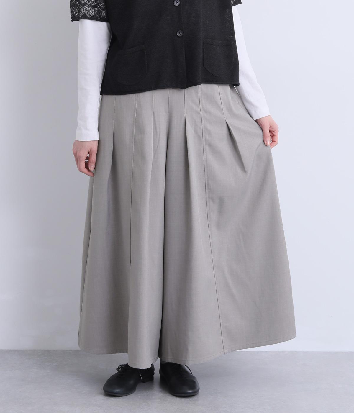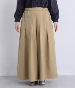 生地を贅沢にたっぷりと使用したスカート見えするワイドパンツ。タックを入れているので腰まわりは広がりをおさえてすっきり見え。ウエストはサイドから後ろにかけてゴムを通し、トップスインのきれいめな着こなしも◎。
