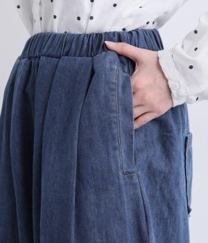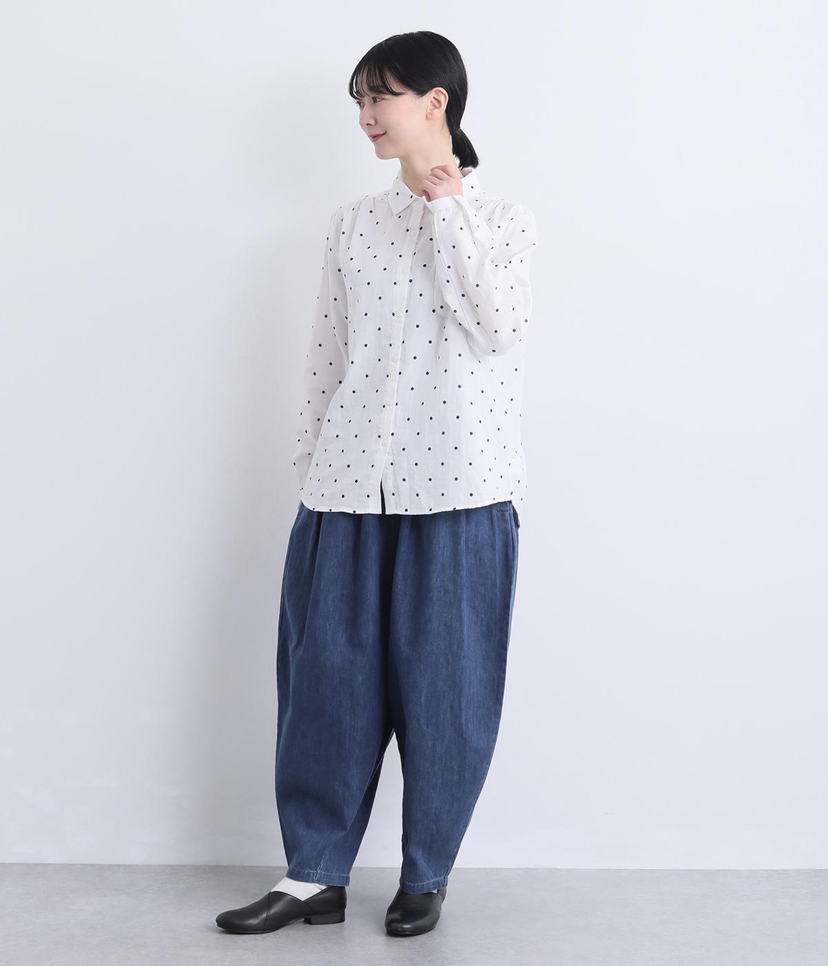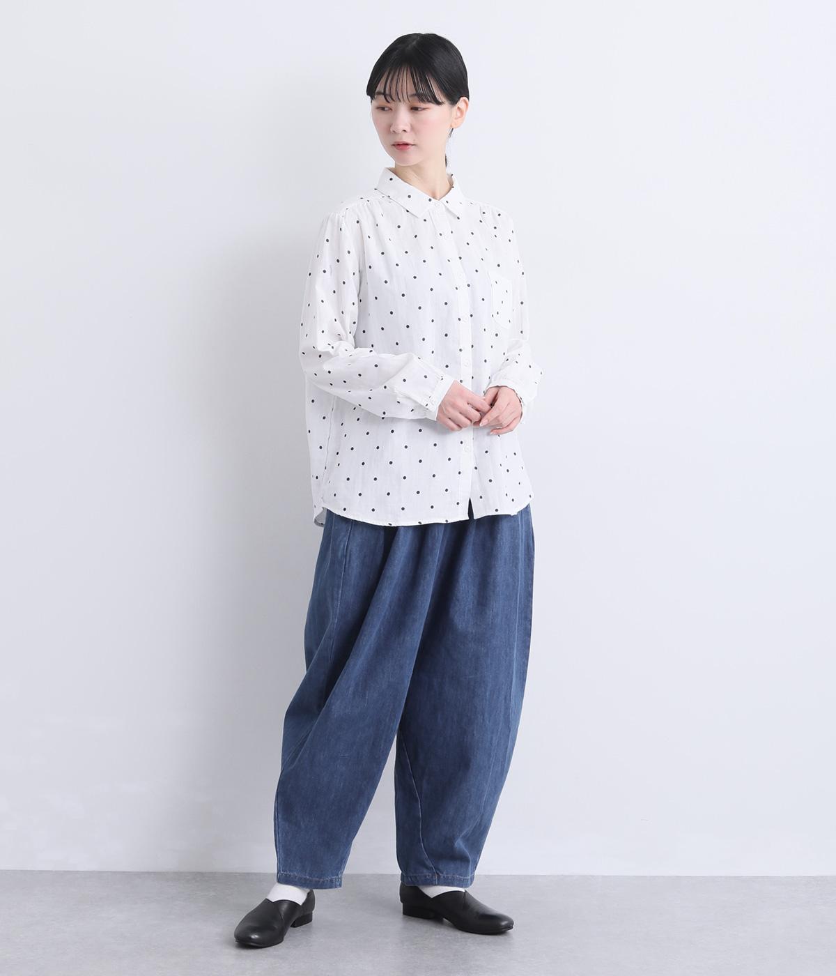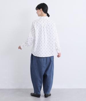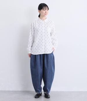タックを取ってボリュームをもたせたサルエル調のゆったりシルエットが魅力のパンツ。ヒップポケットもやや下げて気負いのないリラックス感を表現。ウエスト総ゴムに内紐入りで着用感もストレスフリーに仕上げました。