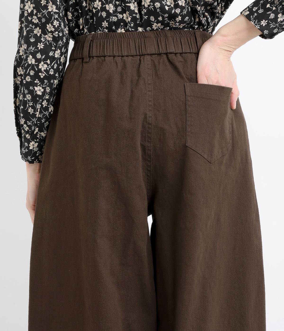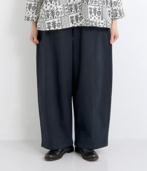 ゆとりのあるシルエットを、縦の切り替えラインがすっきりと見せてくれます。ほどよいストレッチで動きやすさも確保しました。ウエストはベルトループ付きのゴム仕様で、トップスインのスタイリングもおすすめです。
