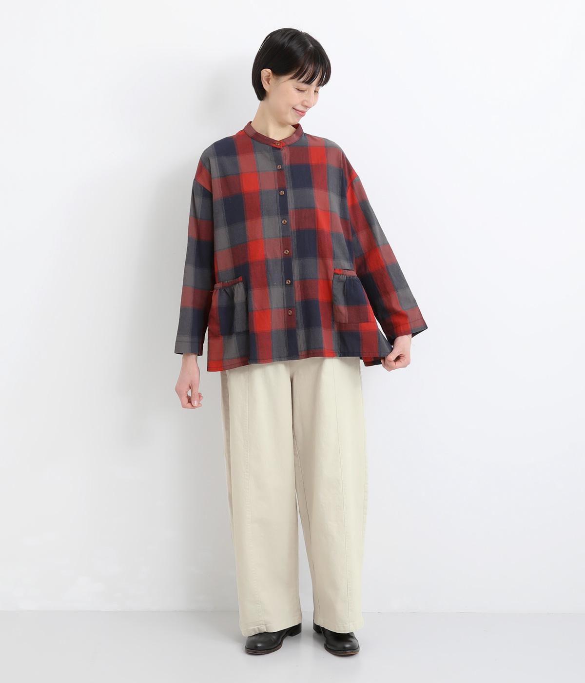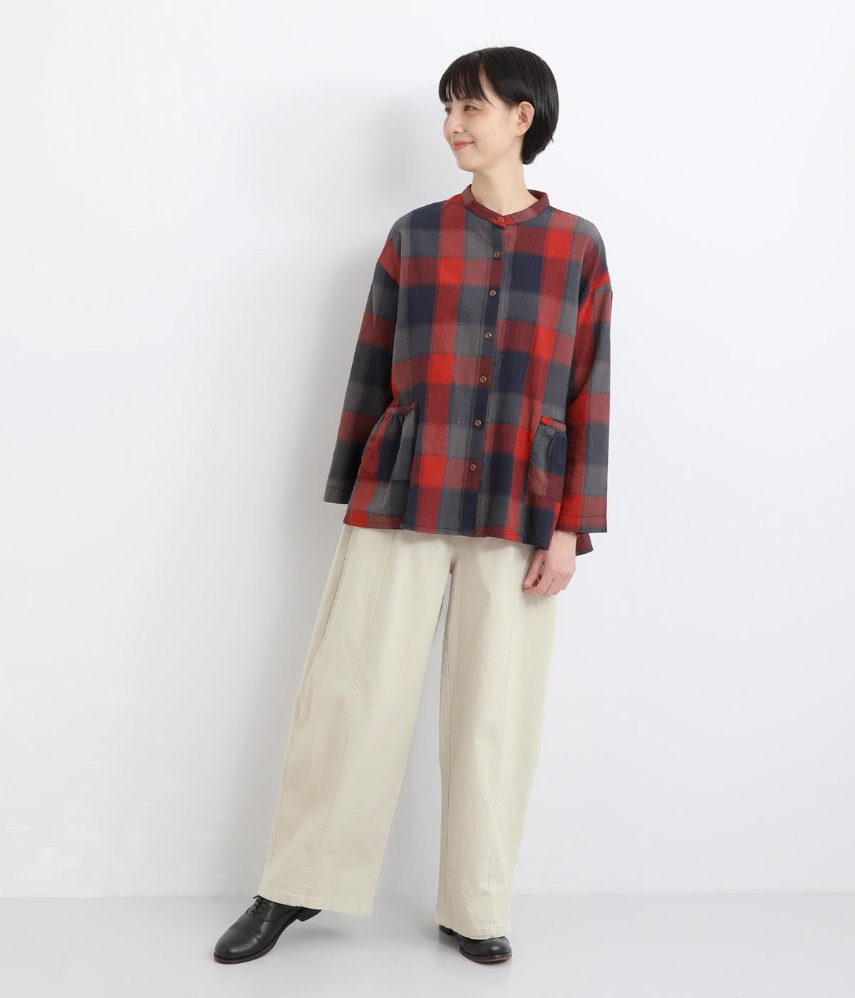 ほどよい厚みのコットンツイル生地を使用しました。しなやかな肌ざわりとナチュラルな風合いが魅力です。やわらかなハリがシルエットをきれいに保ちます。