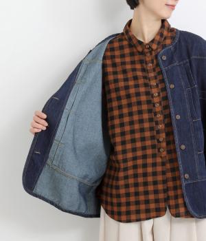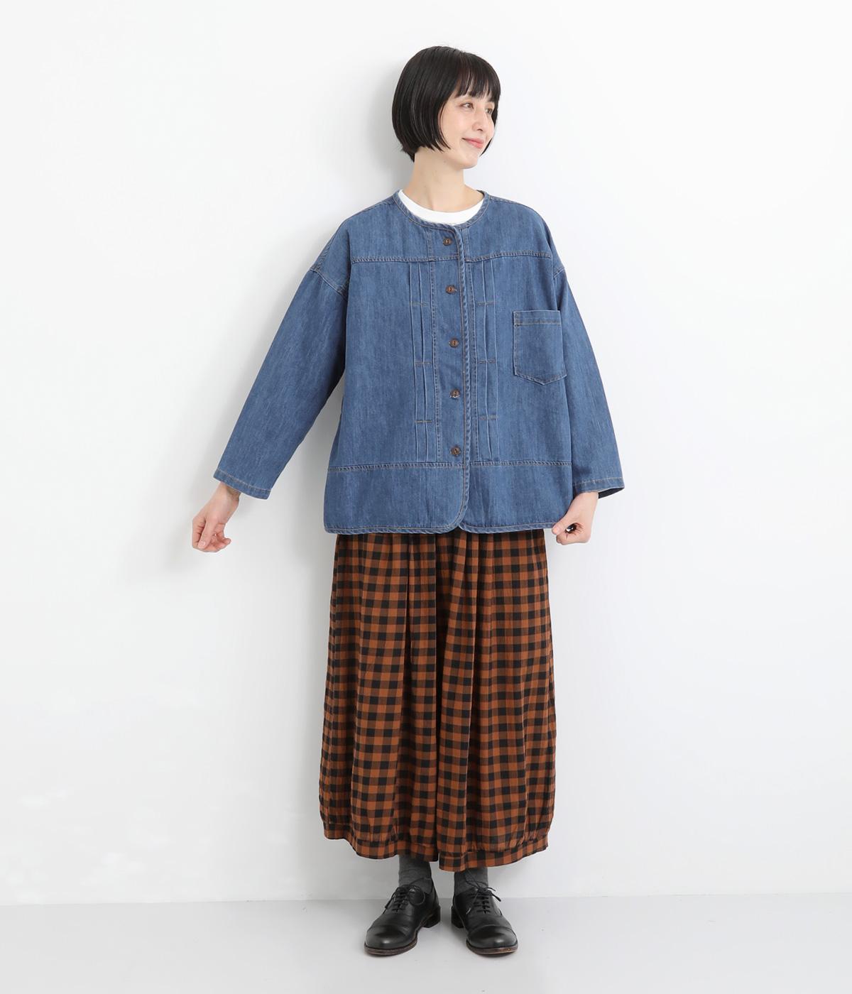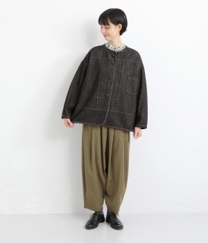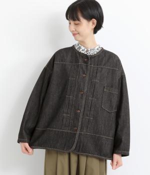 やさしい着心地で軽やかに羽織れるジャケットです。前立てのタックがアクセントを添え、裾の曲線がやわらかい雰囲気を与えます。ノーカラーで顔まわりをすっきり見せ、インナーとも合わせやすく仕立てました。