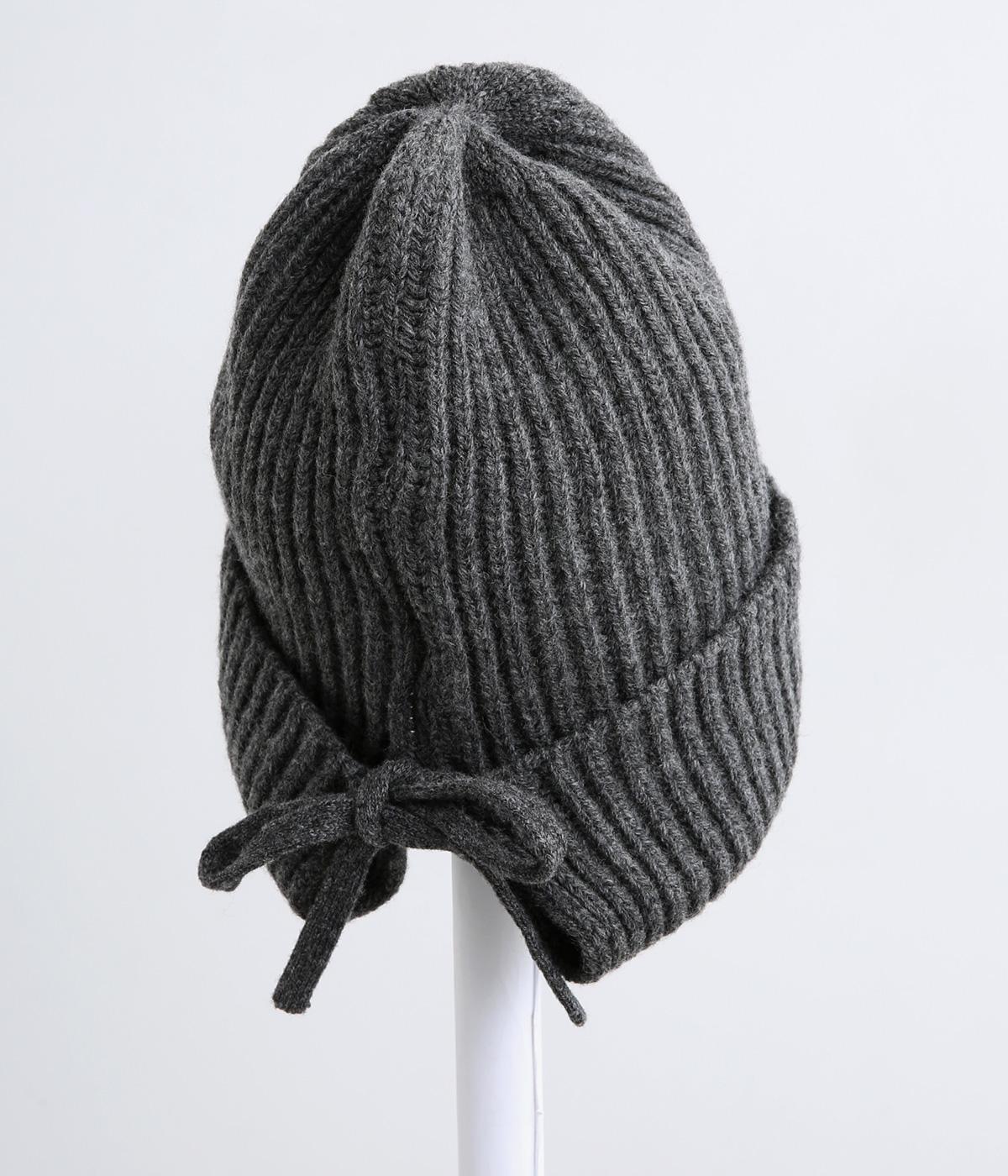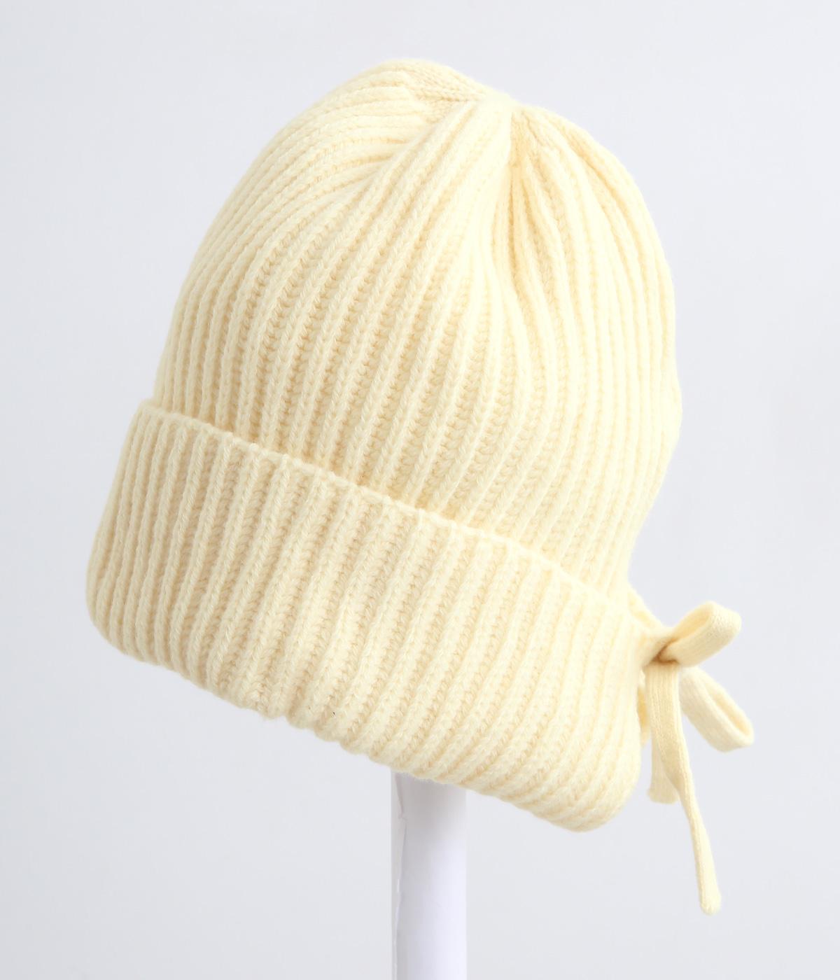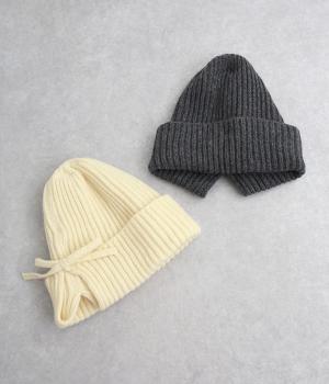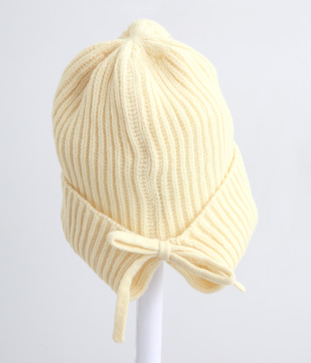 後ろのリボンが愛らしいポイントとなった、ニットキャップです。前から見るとベーシックなニットキャップに見えますが、後ろのリボンを外すことでニットフードのようにも使用できる2way仕様となっています。