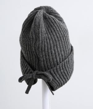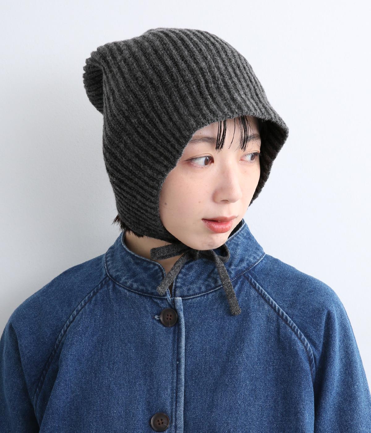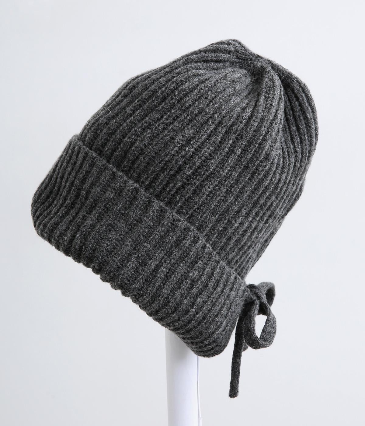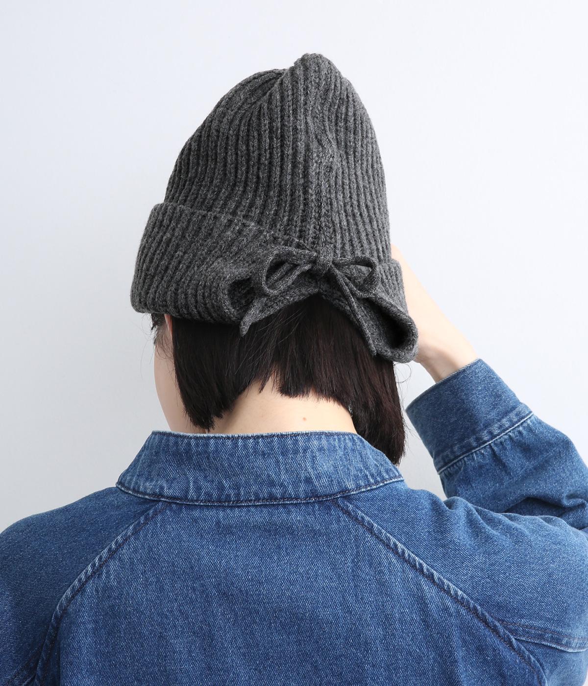 後ろのリボンが愛らしいポイントとなった、ニットキャップです。前から見るとベーシックなニットキャップに見えますが、後ろのリボンを外すことでニットフードのようにも使用できる2way仕様となっています。