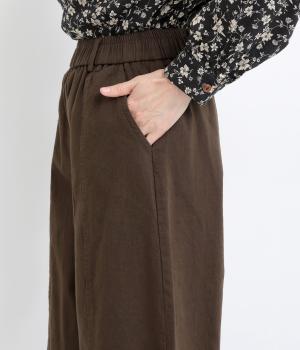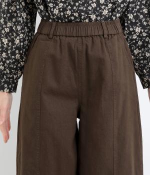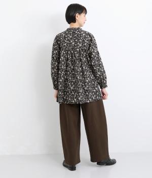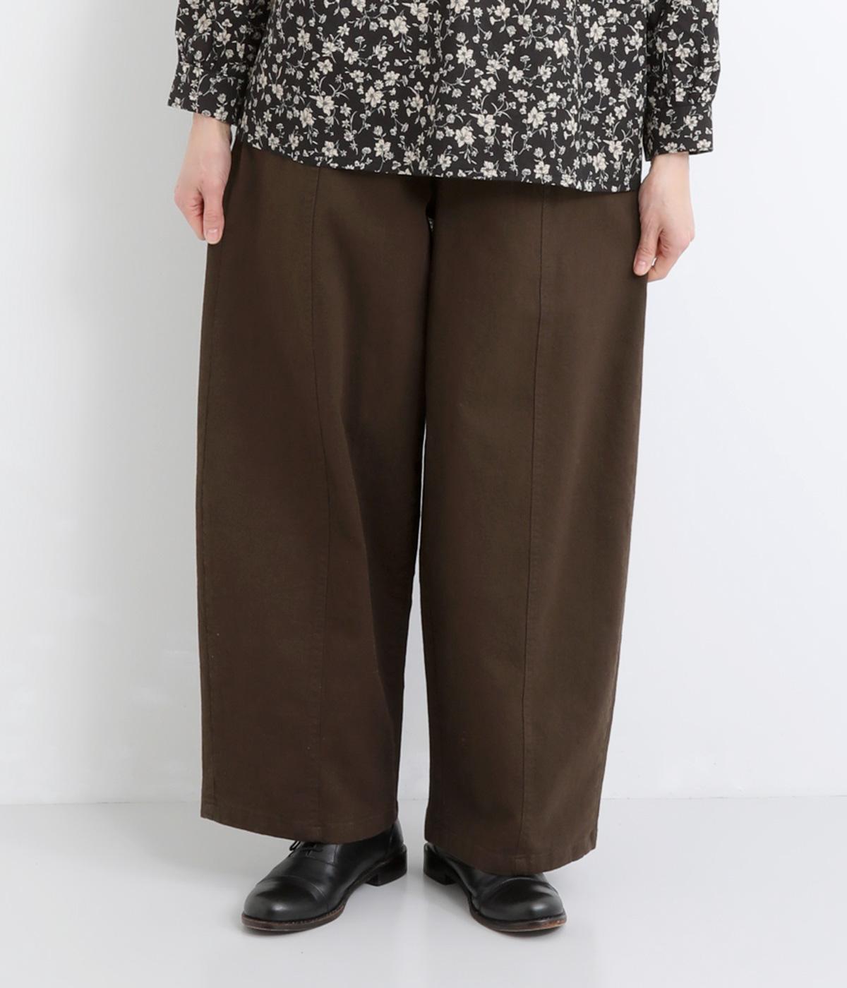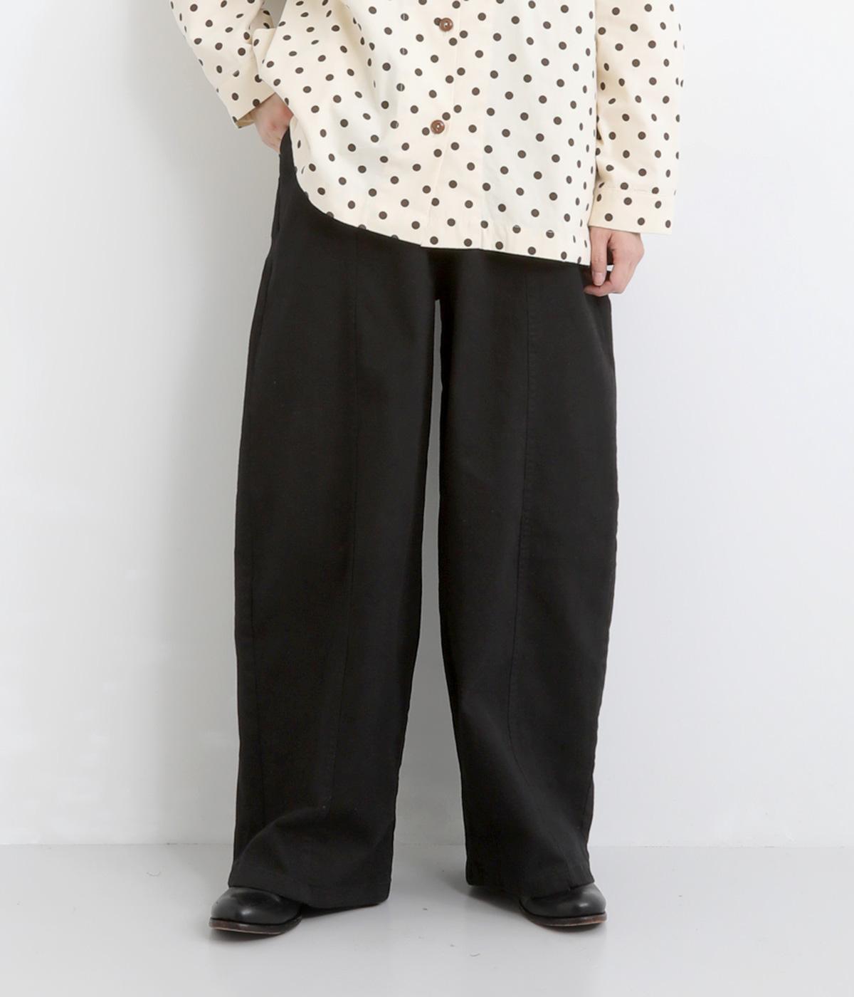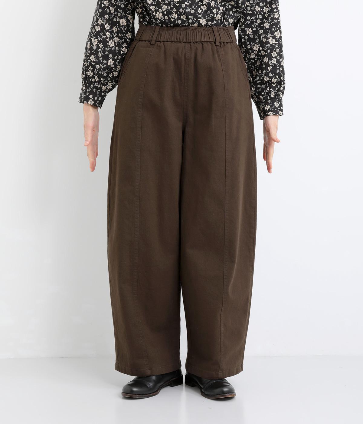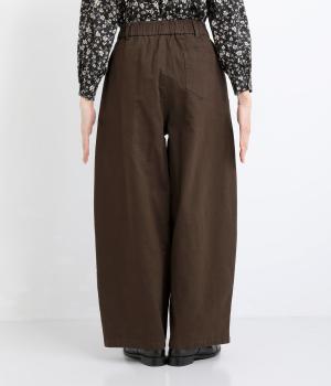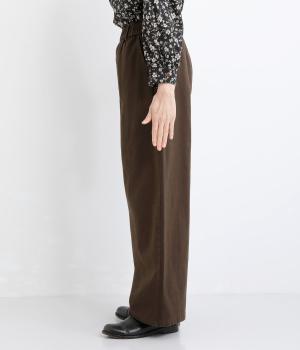 ゆとりのあるシルエットを、縦の切り替えラインがすっきりと見せてくれます。ほどよいストレッチで動きやすさも確保しました。ウエストはベルトループ付きのゴム仕様で、トップスインのスタイリングもおすすめです。