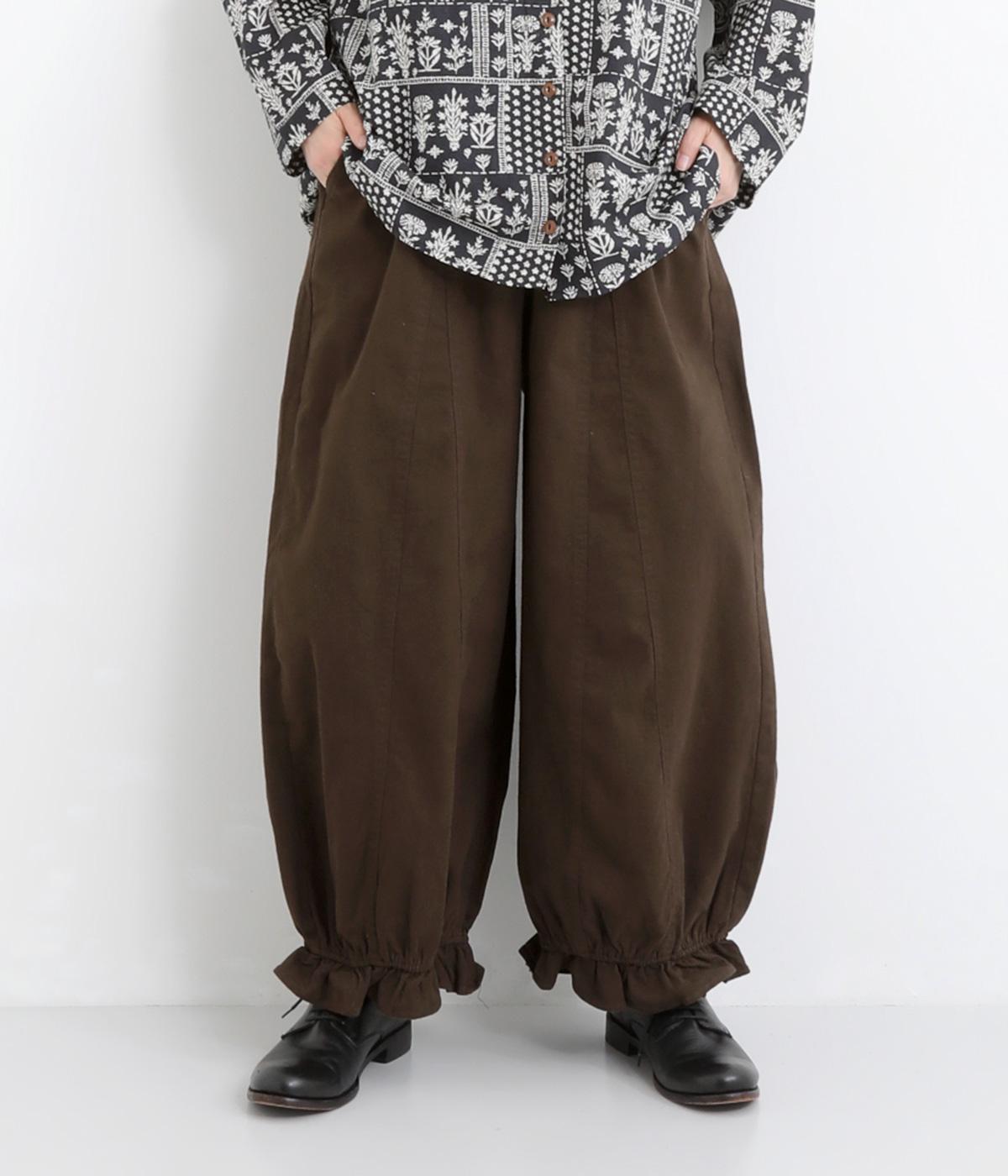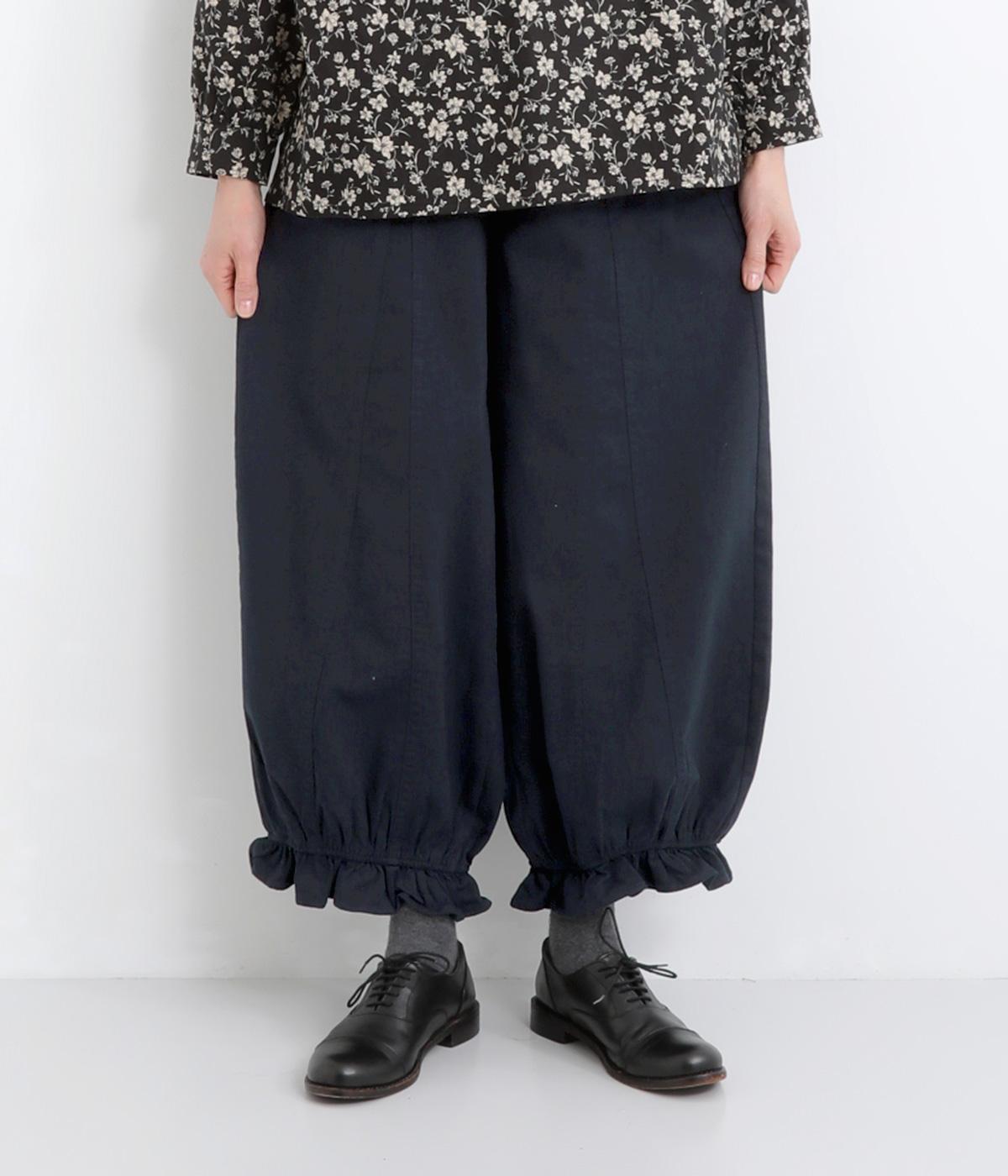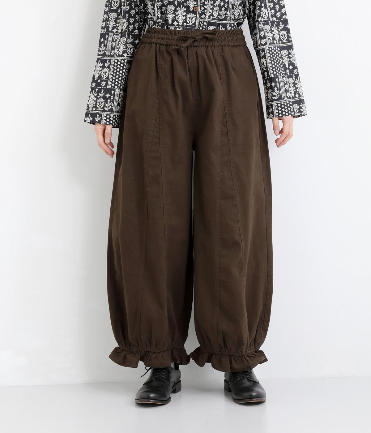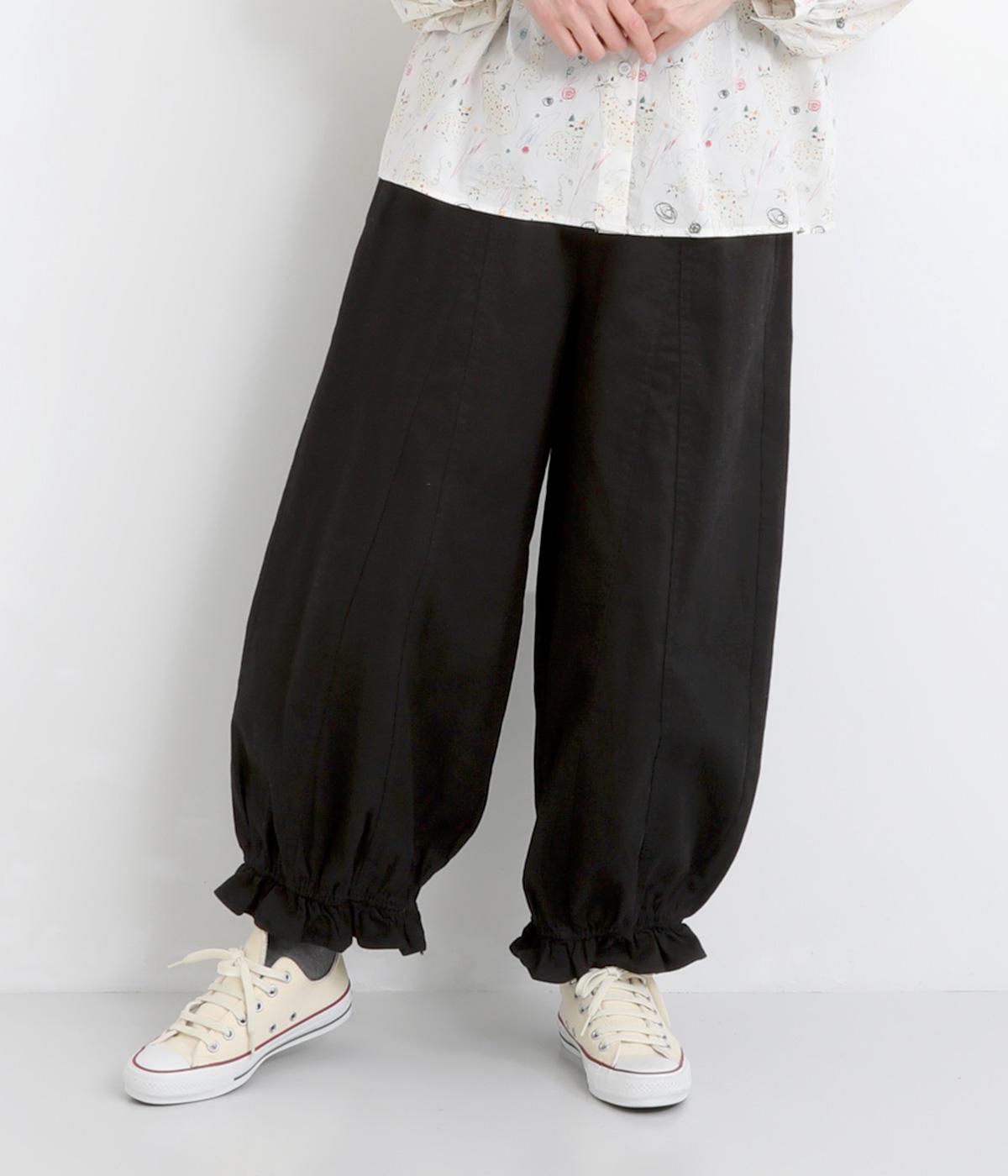 裾にフリルをほどこしたデザイン性のあるパンツです。ゆとりのあるシルエットを、縦の切り替えラインがすっきりと見せてくれます。ほどよいストレッチで動きやすさも確保しました。ウエストは総ゴム仕様で紐で調節できます。