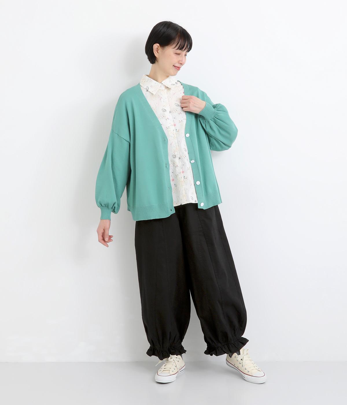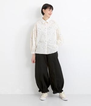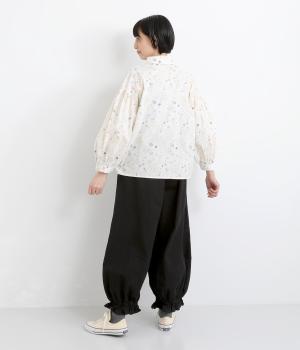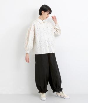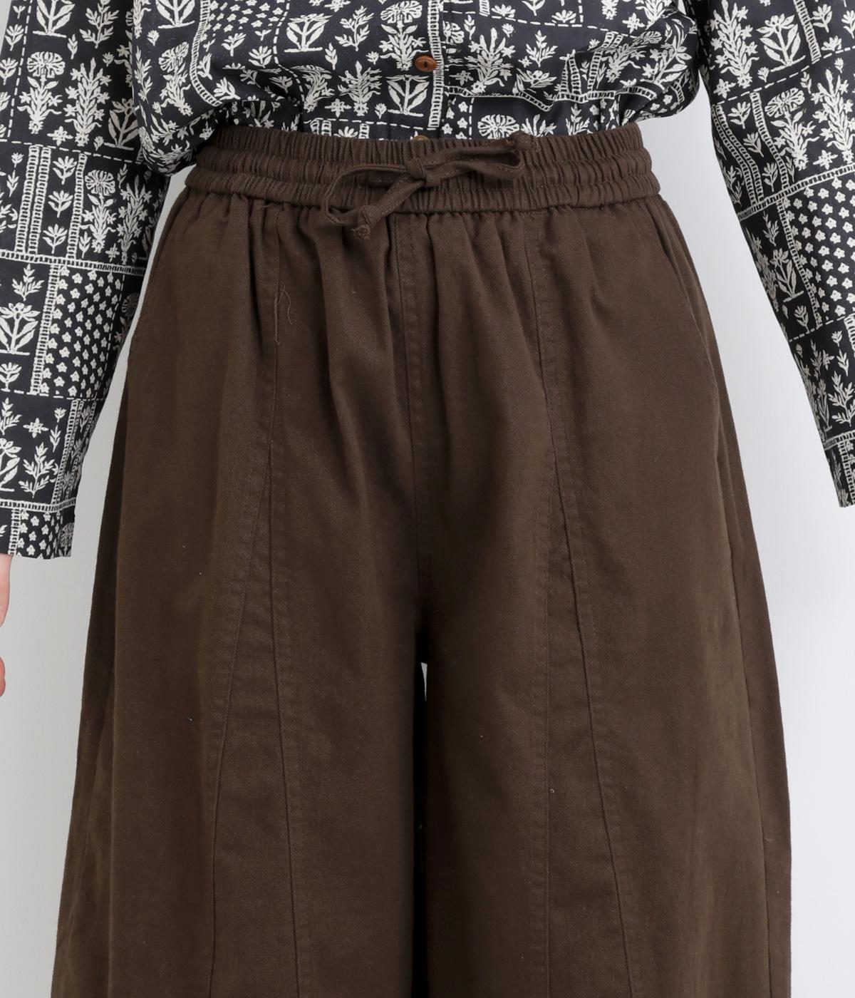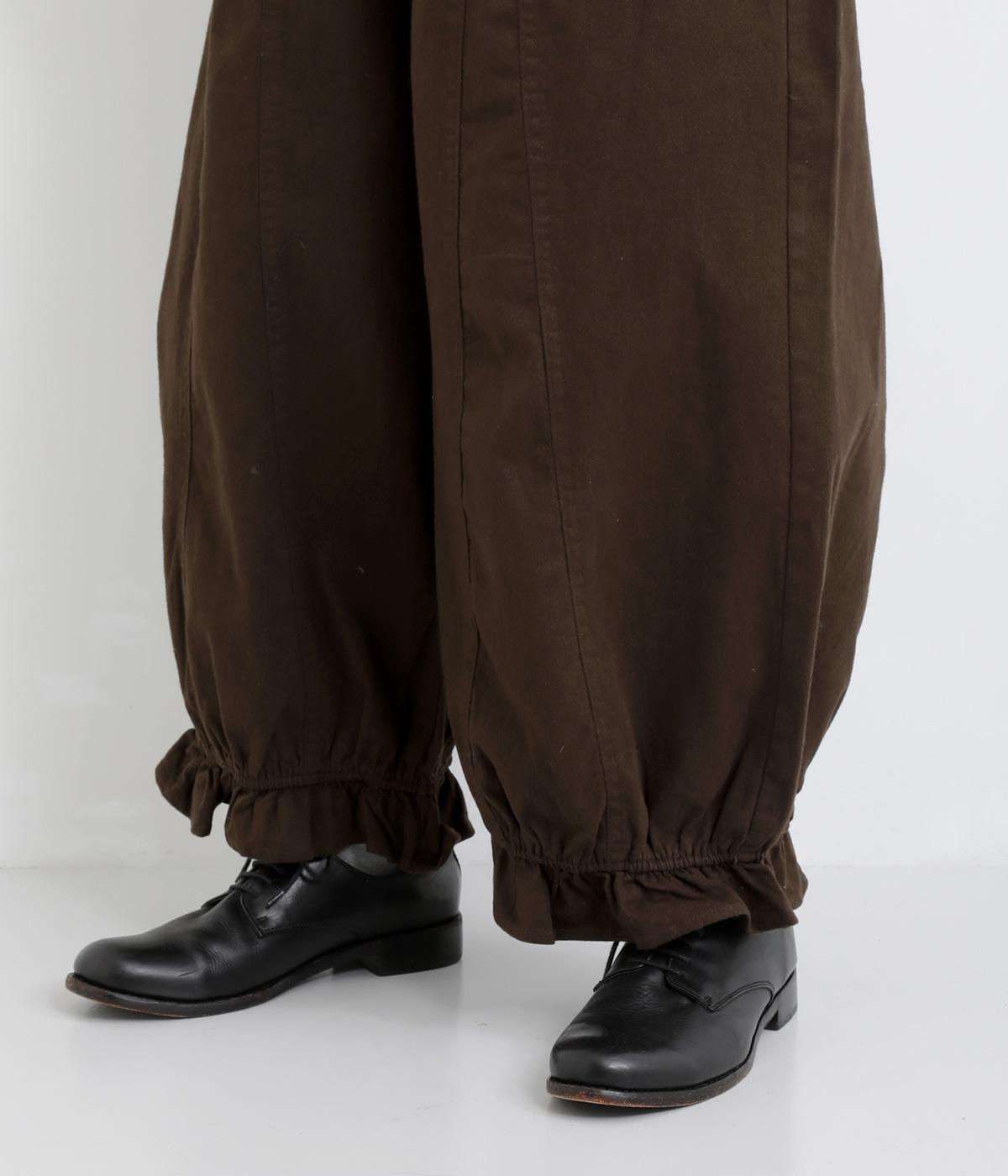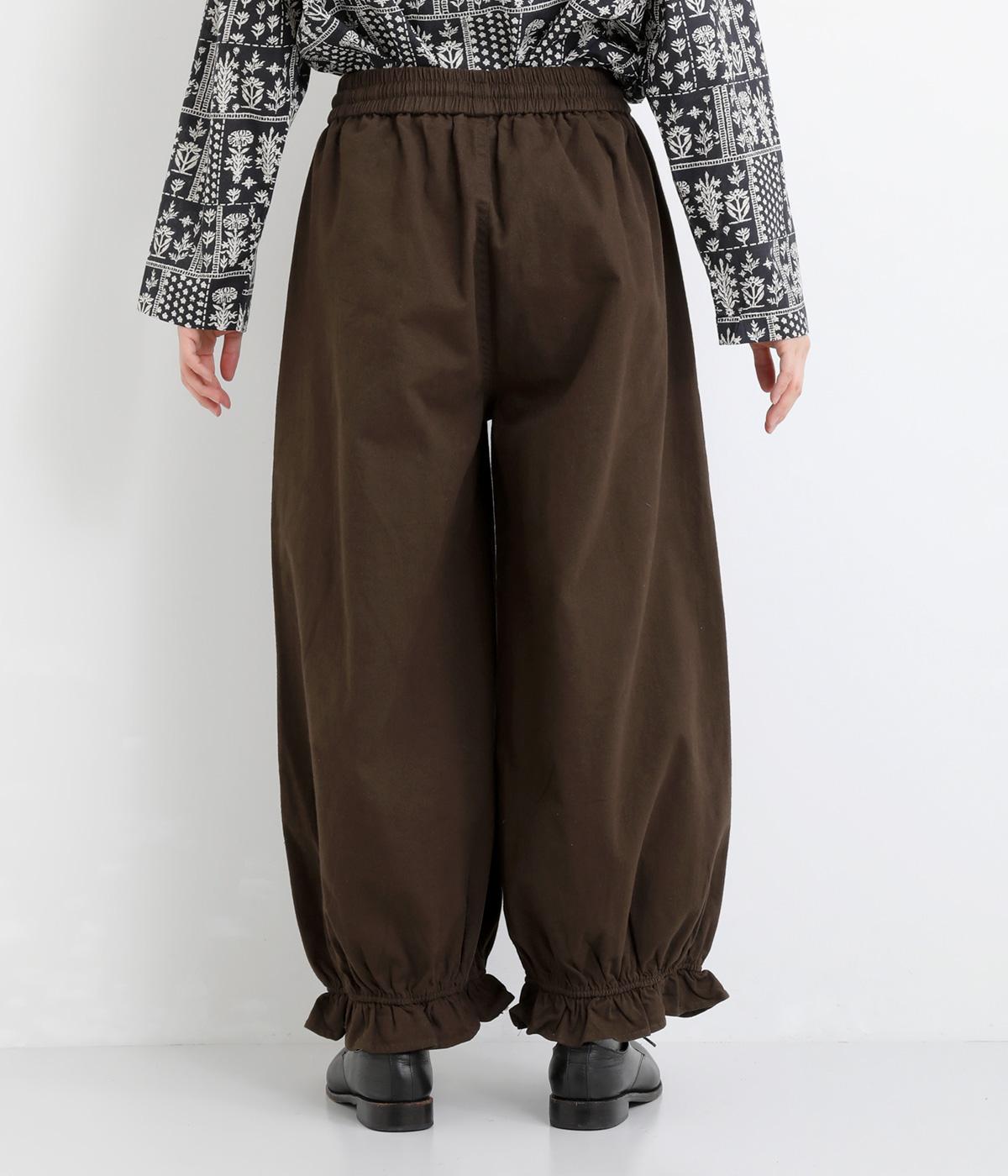 裾にフリルをほどこしたデザイン性のあるパンツです。ゆとりのあるシルエットを、縦の切り替えラインがすっきりと見せてくれます。ほどよいストレッチで動きやすさも確保しました。ウエストは総ゴム仕様で紐で調節できます。