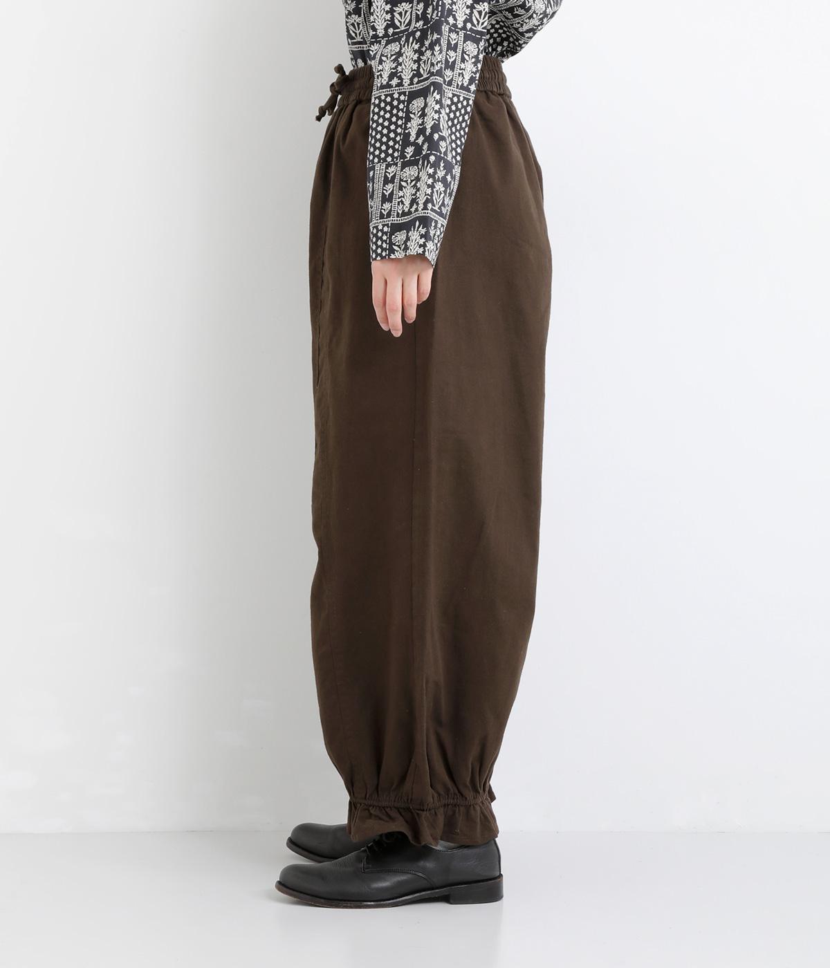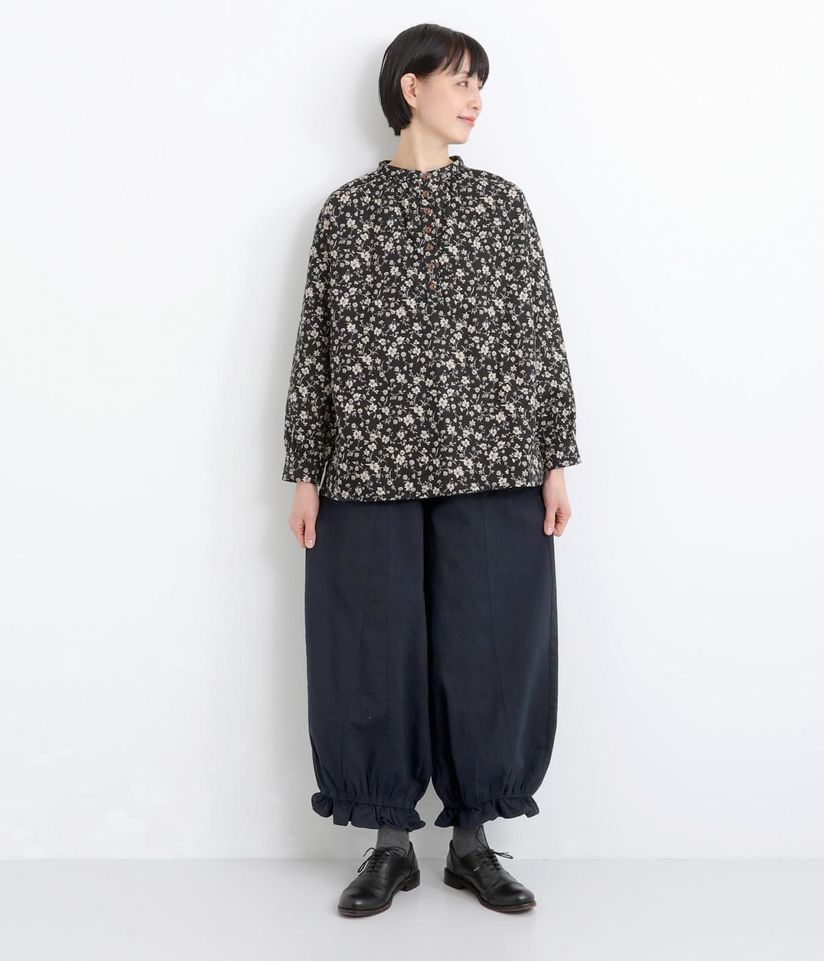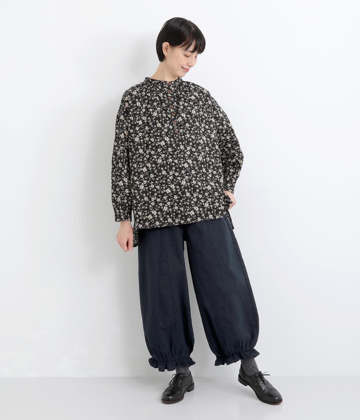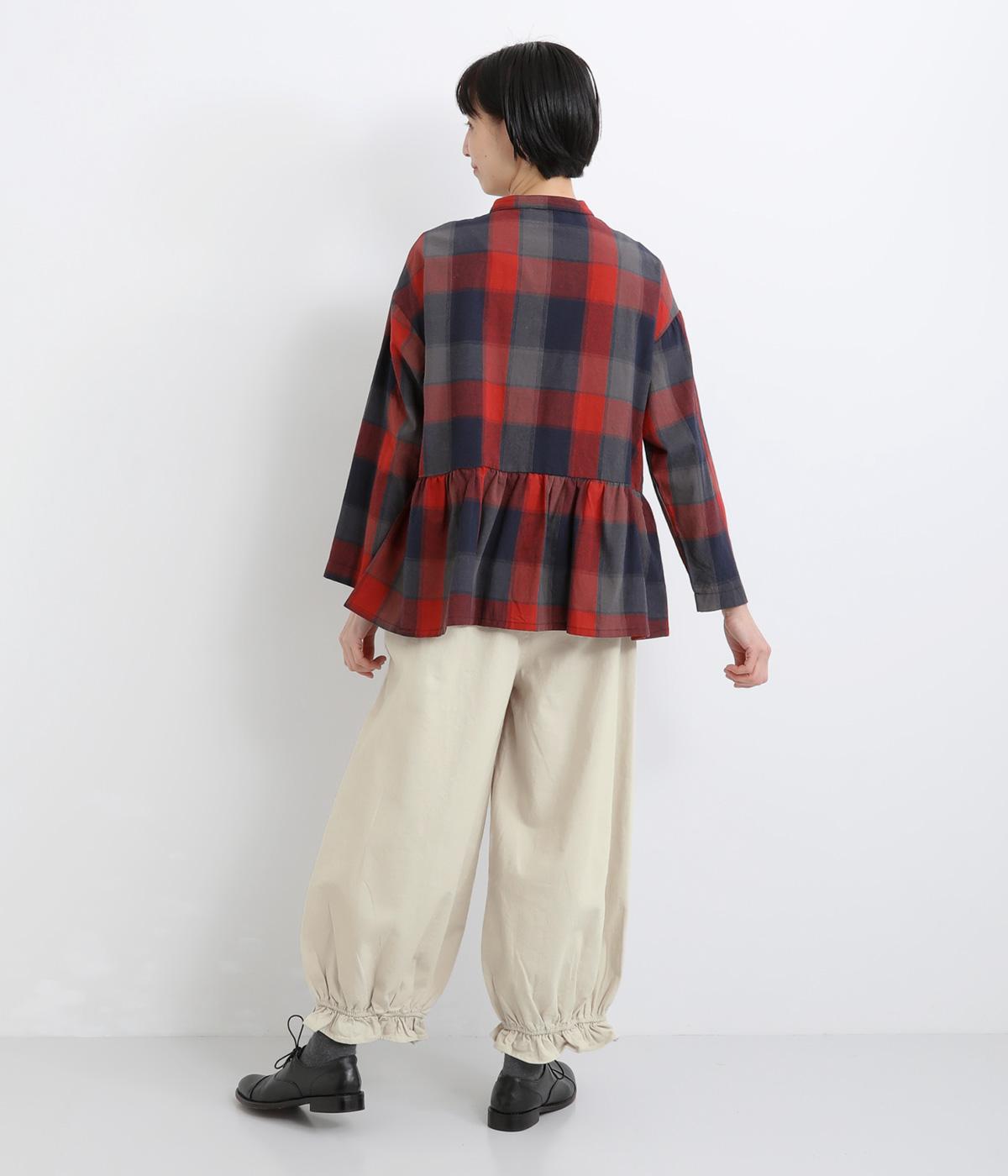 裾にフリルをほどこしたデザイン性のあるパンツです。ゆとりのあるシルエットを、縦の切り替えラインがすっきりと見せてくれます。ほどよいストレッチで動きやすさも確保しました。ウエストは総ゴム仕様で紐で調節できます。