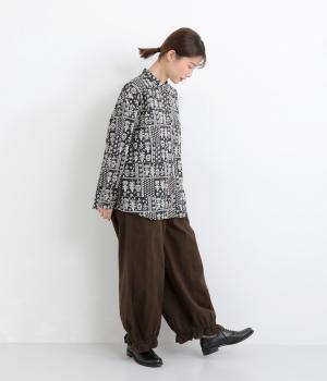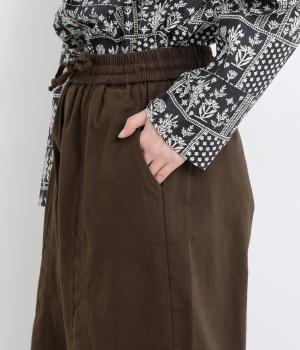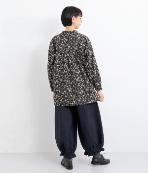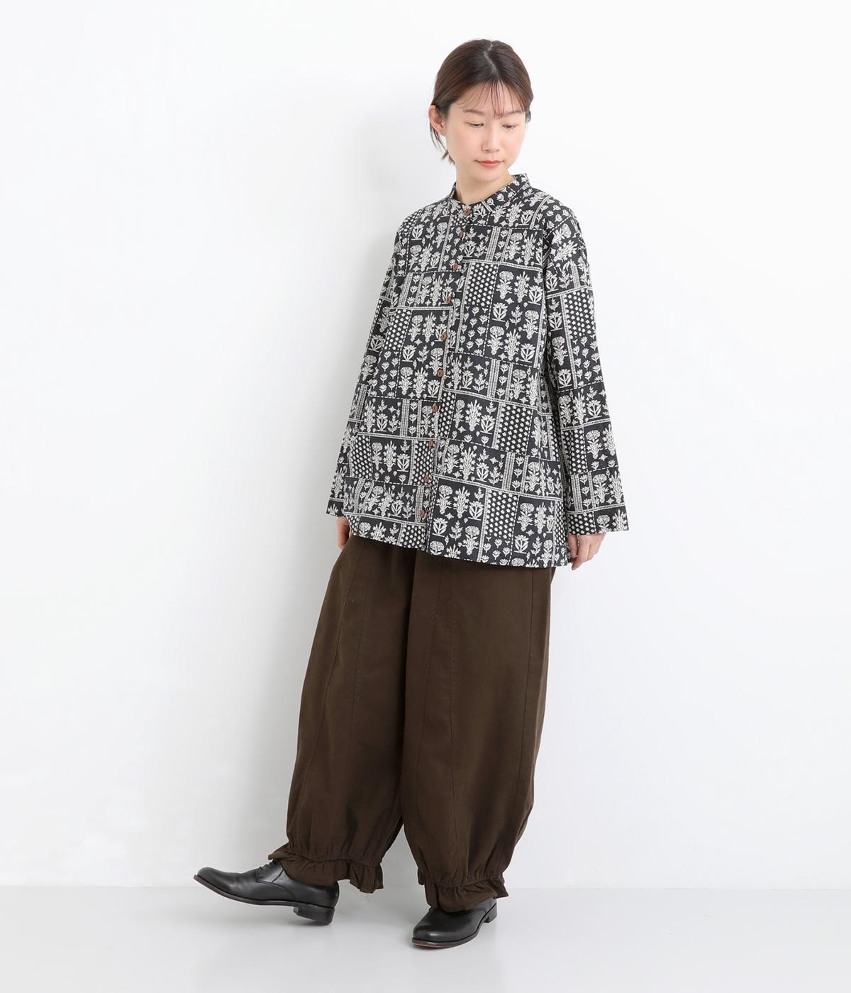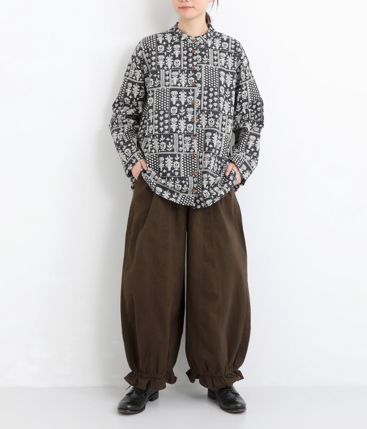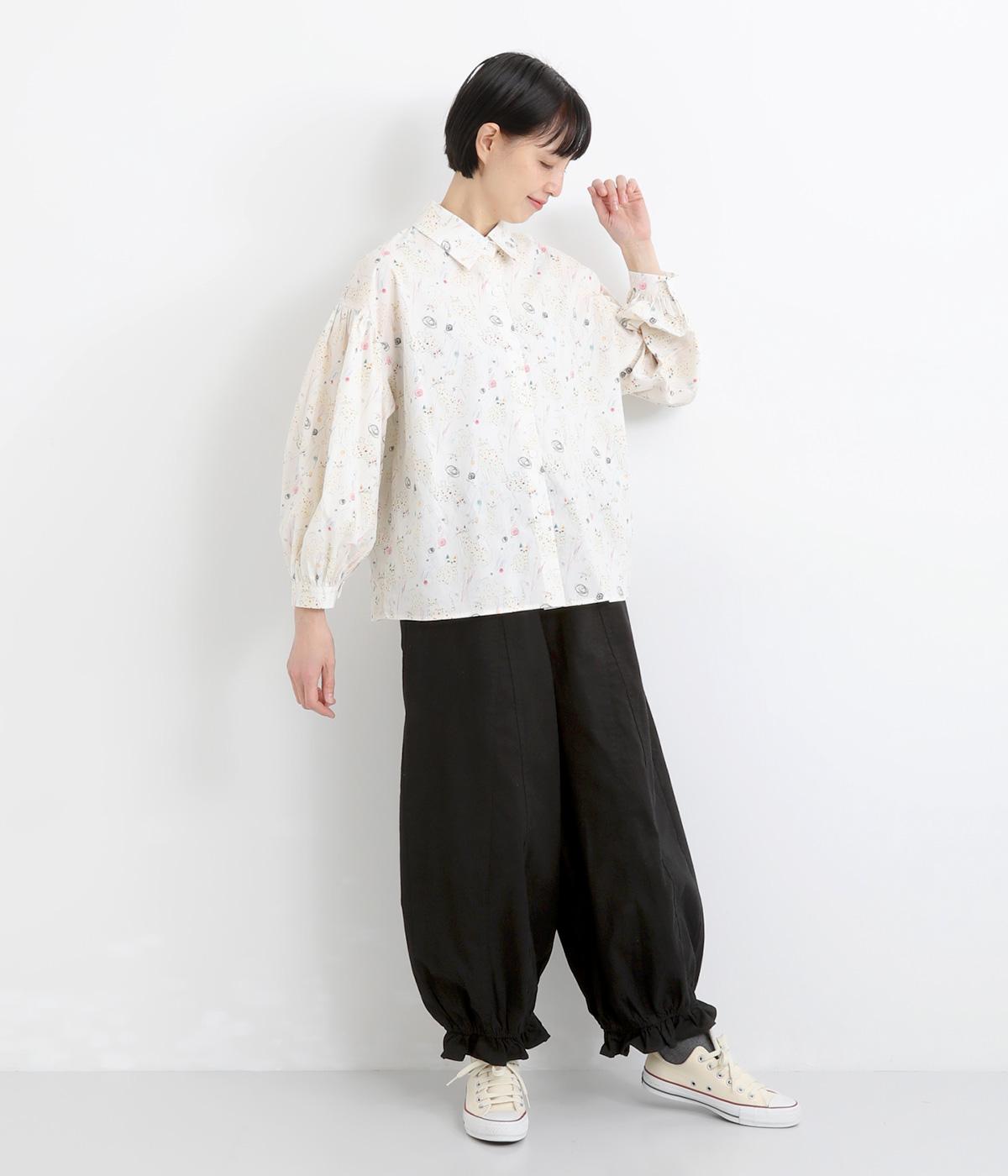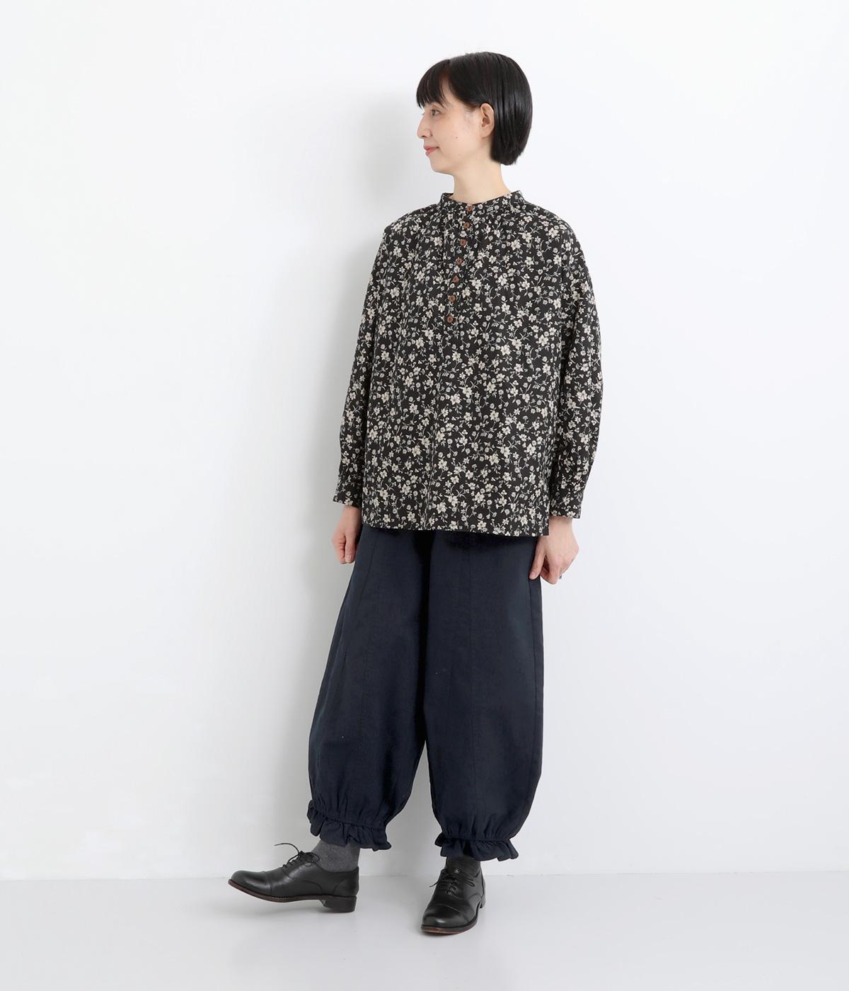 裾にフリルをほどこしたデザイン性のあるパンツです。ゆとりのあるシルエットを、縦の切り替えラインがすっきりと見せてくれます。ほどよいストレッチで動きやすさも確保しました。ウエストは総ゴム仕様で紐で調節できます。